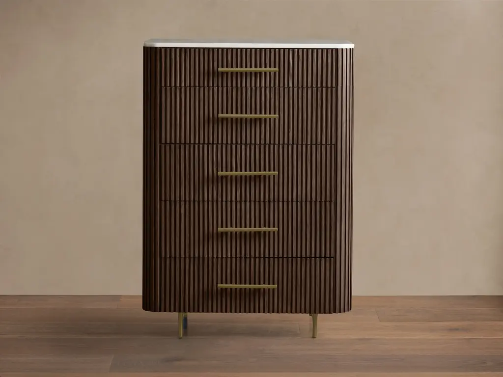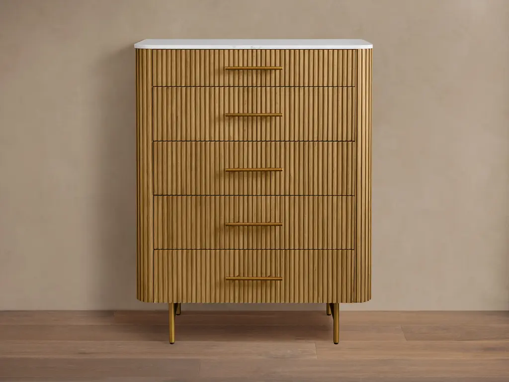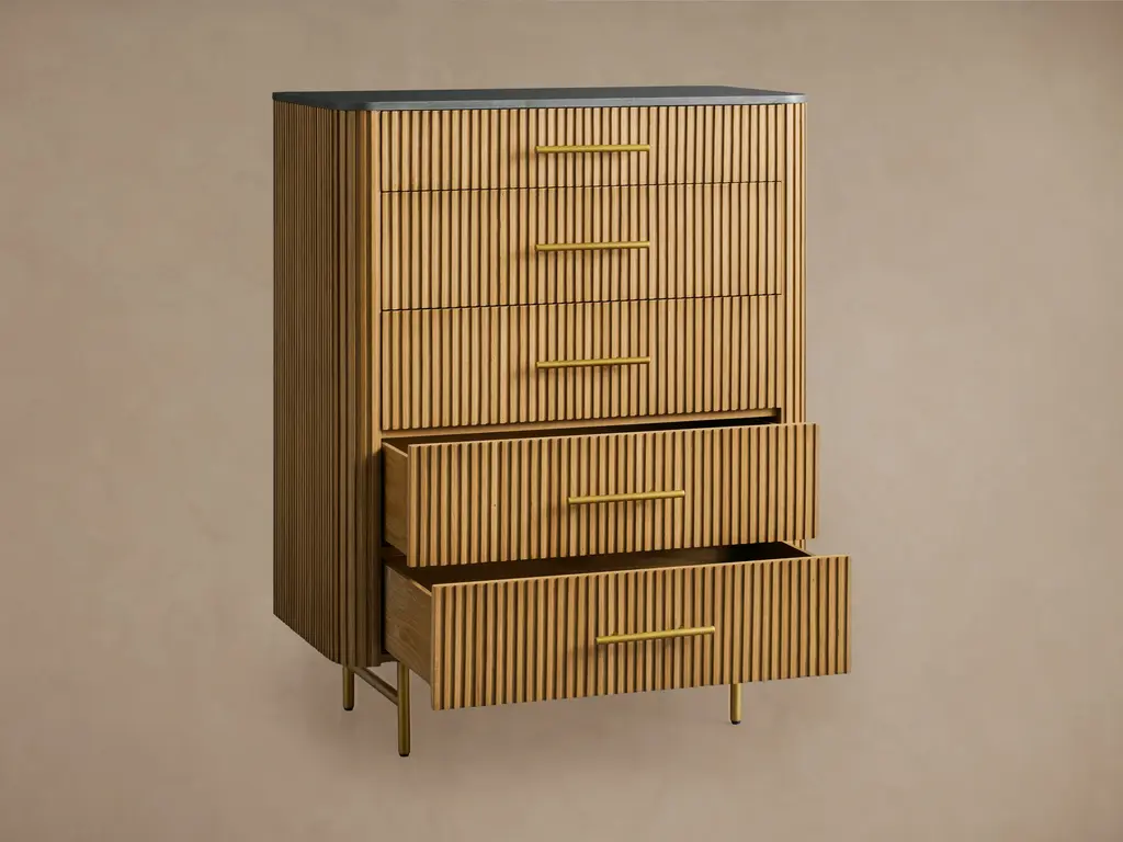 Our Finnley Bedroom Collection showcases a stunning mixed-material design, inviting elevated style into your bedroom oasis. Hand-finished pine from Finland or white oak wood is luxuriously accented by reeded oak detailing complemented by stone tops. The result is an eclectic-yet-chic bedroom suite that easily fits into the aesthetic of your home.