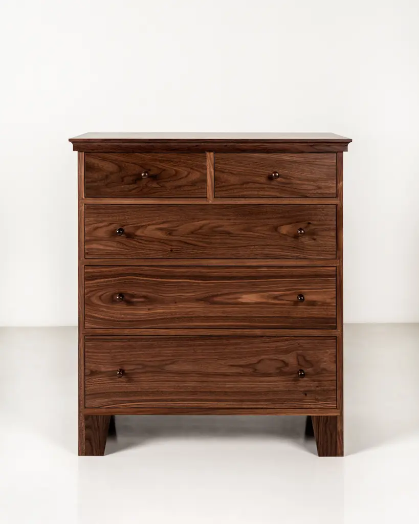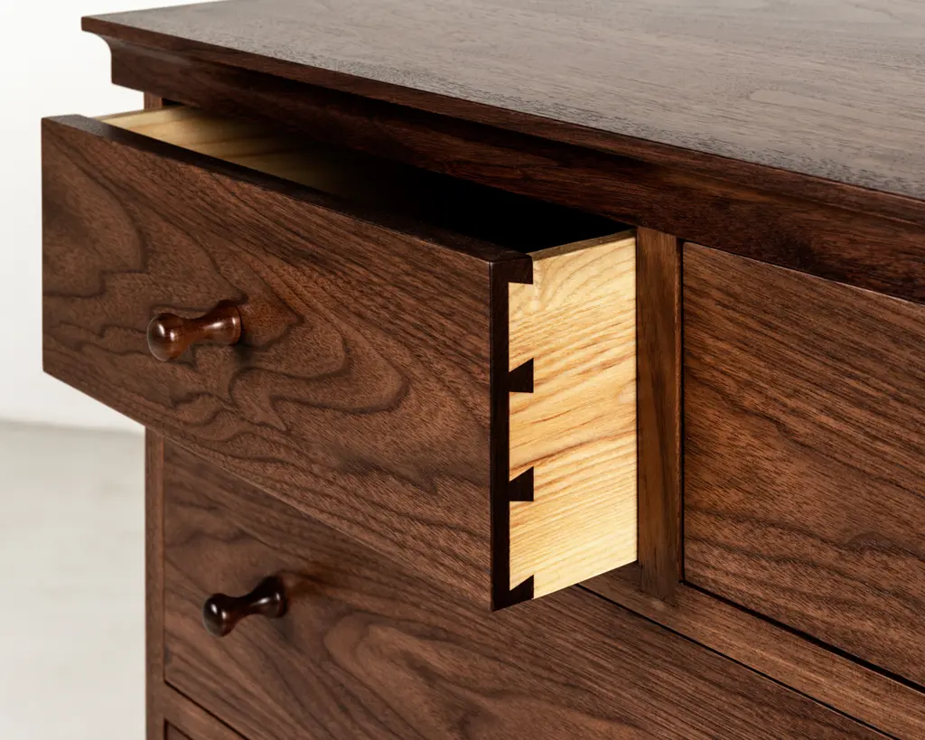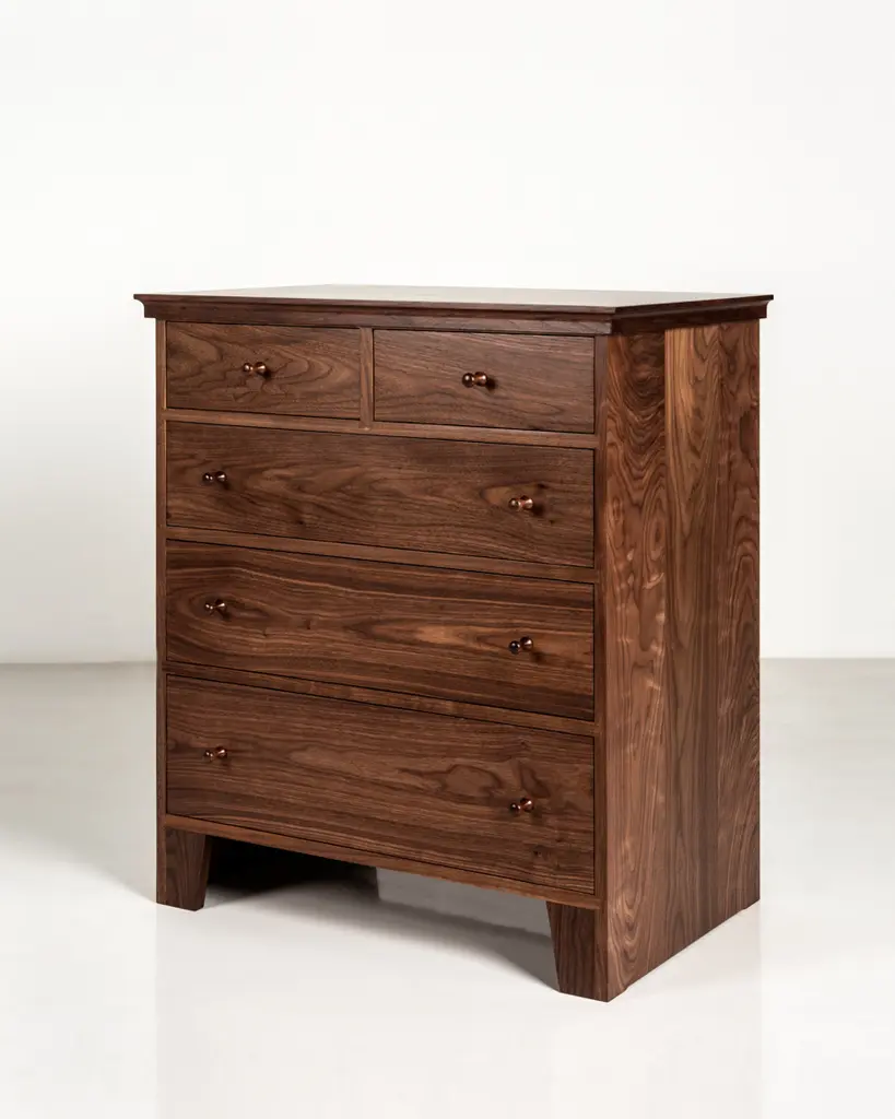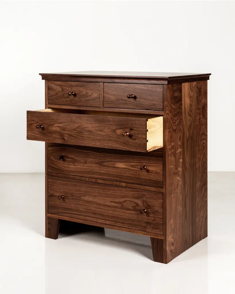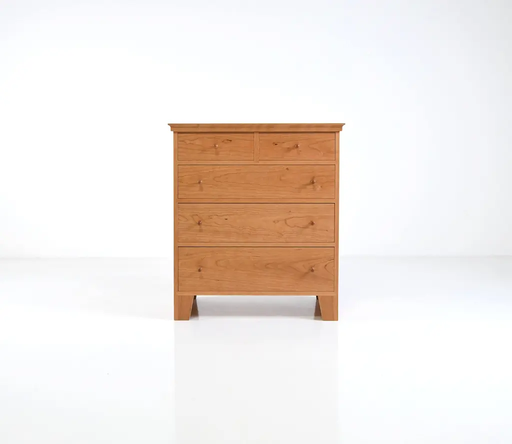 Designed in the Shaker tradition, our Five Drawer Dresser is free of ornamentation, with wood grain resplendent on its drawer faces, sides and top – and a solid wood back panel that rests in innovative expansion channels to accommodate temperature and humidity fluctuations.