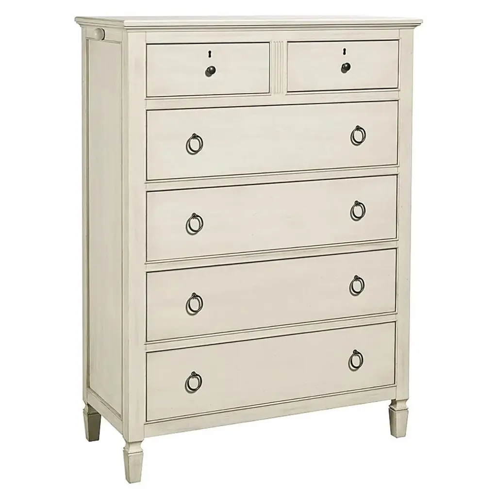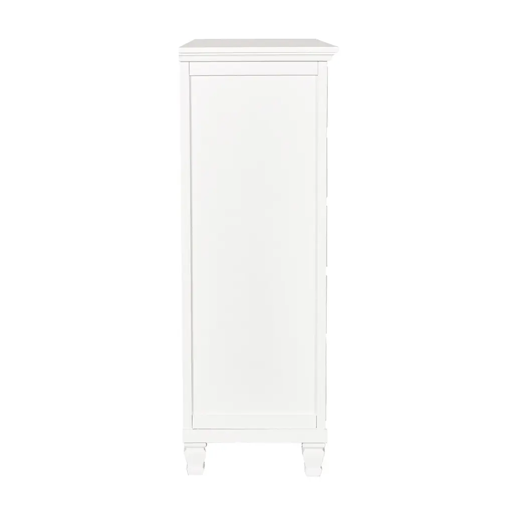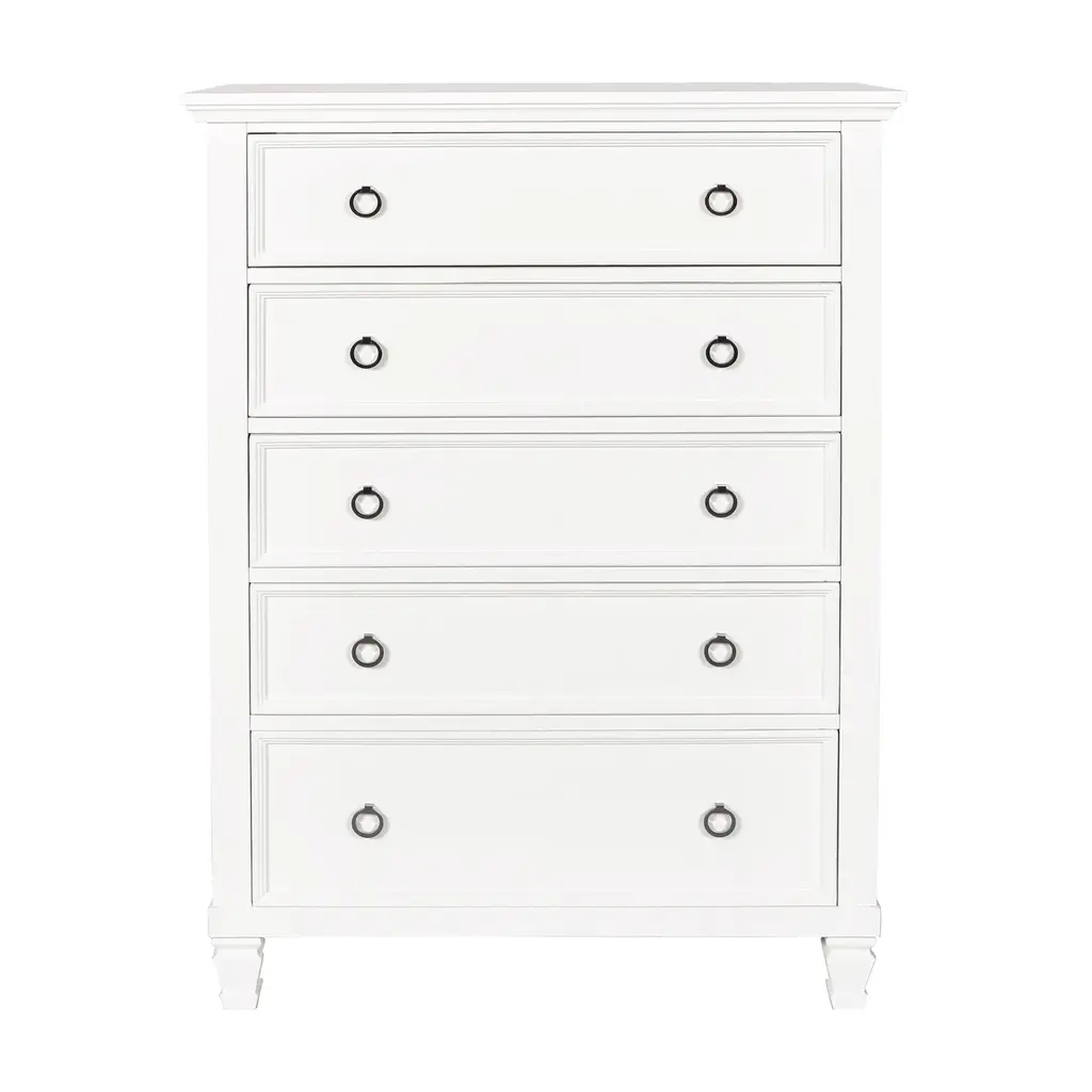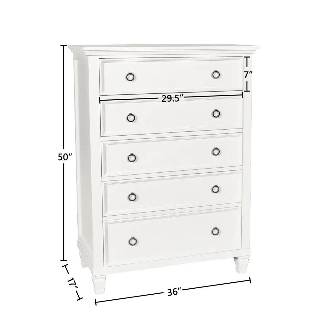 Five large drawers make room for all your belongings in this chest of drawers. Chrome finished loops adorn the drawer fronts and lay delicately against the white finish of this chest. Crown moulding and carved feet offer classic design to match your bedroom design. With modern and classic inspiration, this chest offers a transitional look for your uptown loft or country cottage. Match this dressing chest with your favorite decor to turn this functional storage piece into a stylish statement.