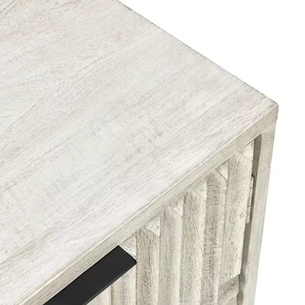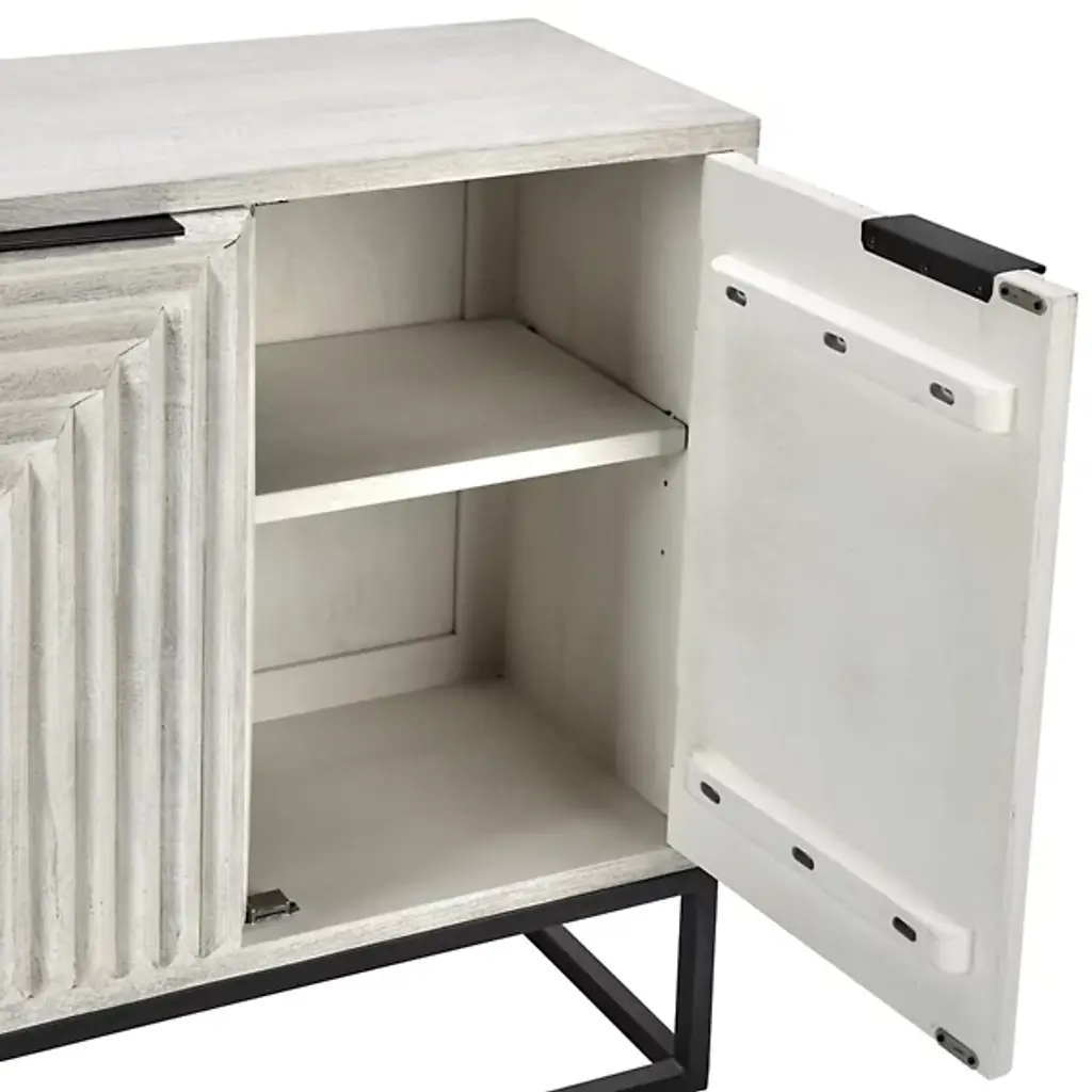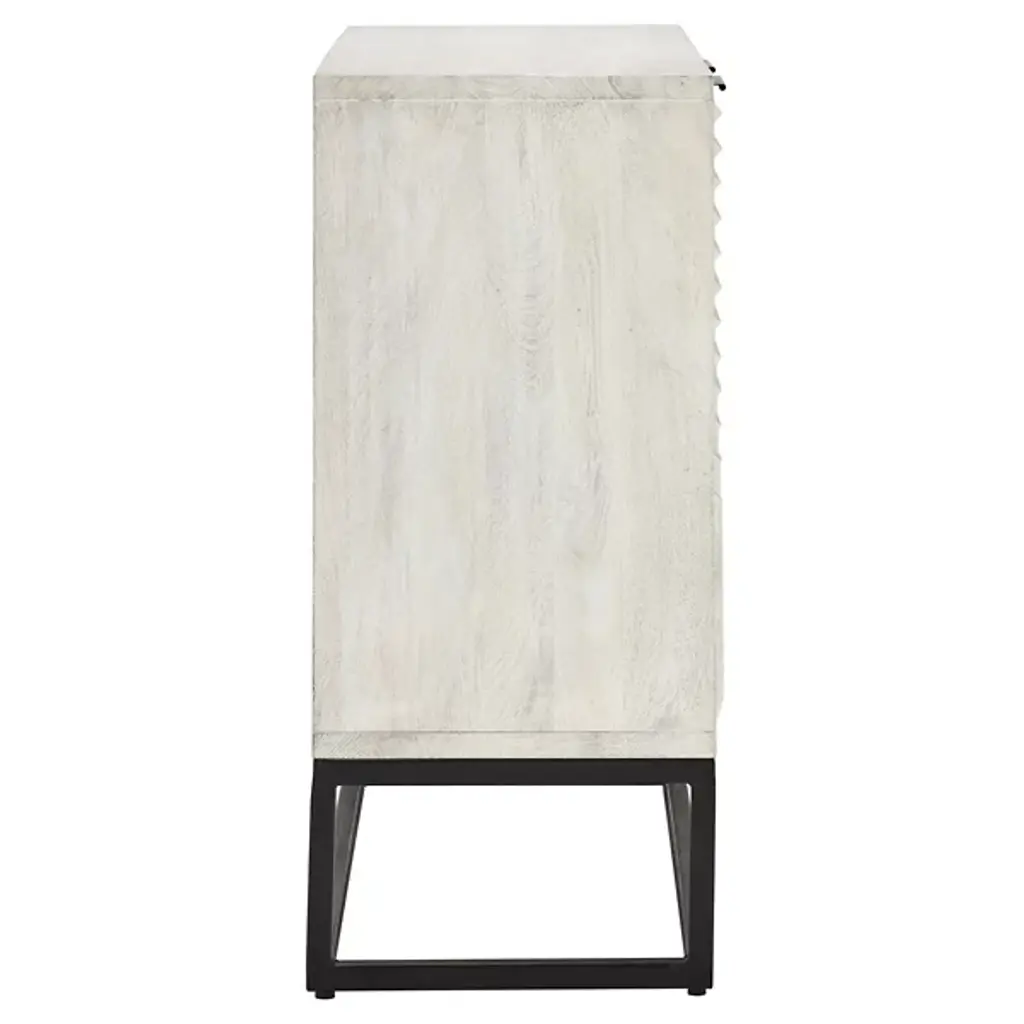 The Flint 2 Dresser Buffet from Classic Home features a geometric pattern, featuring both style and functionality. Behind the intricately carved doors lies ample storage space, making it ideal for organizing and decluttering any room. The light, airy finish enhances your décor by complementing various color schemes and adding a bright, uplifting touch to your space. Constructed from mango wood and accented with sturdy iron handles, this sideboard ensures long-lasting use while elevating your interior with its design.