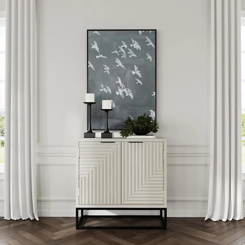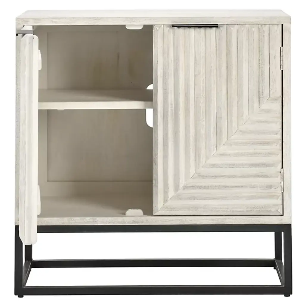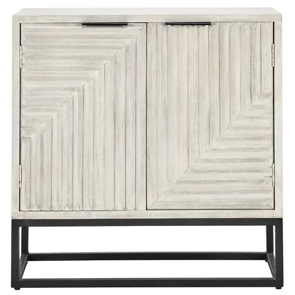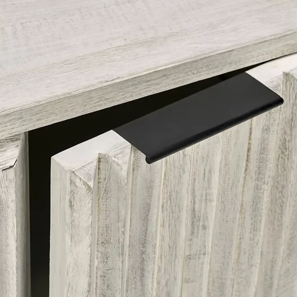 The Flint 2 Dresser Buffet from Classic Home features a geometric pattern, featuring both style and functionality. Behind the intricately carved doors lies ample storage space, making it ideal for organizing and decluttering any room. The light, airy finish enhances your décor by complementing various color schemes and adding a bright, uplifting touch to your space. Constructed from mango wood and accented with sturdy iron handles, this sideboard ensures long-lasting use while elevating your interior with its design.
