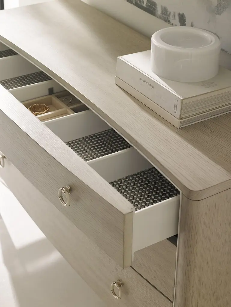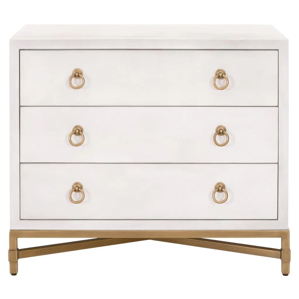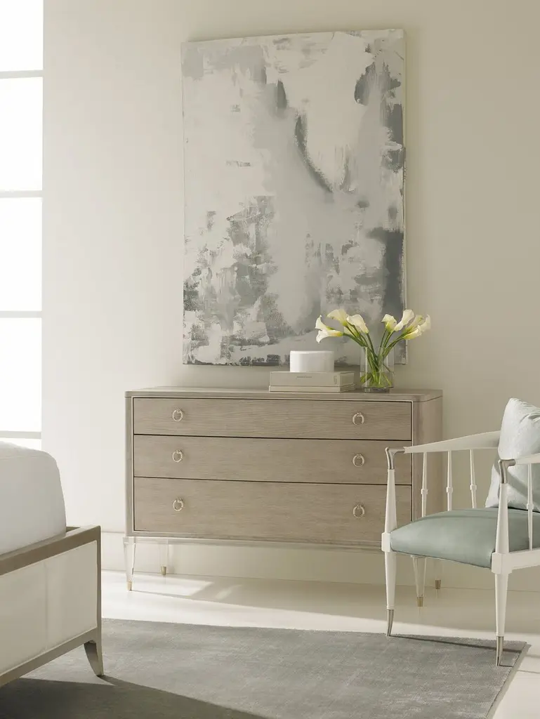 Beautifully hewn from pine and oak, this clean-lined dresser is perched on an acrylic base with three sliding drawers and leather-wrapped hardware. Golden ferrules add that little something extra.