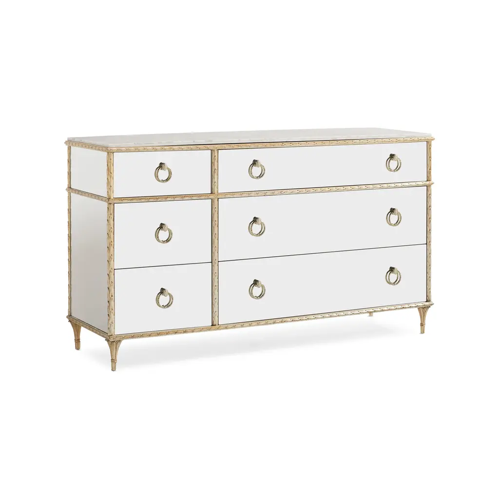 An opulent and glamorous statement for the bedroom, the Fontainebleau 6-Drawer Double Dresser from Caracole is an elegant reflection of all things Baroque. This extraordinary piece is defined by its richly carved laurel leaf motifs, which are brought to life in a shimmering Aglow finish and surround the exquisite mirrored exterior. A durable and luxurious ¾-inch Carrara white marble top provides a practical surface, while custom-designed ring pulls, adorned with vintage cameo buttons, add a final, jewel-like touch. A fusion of historical grandeur and masterful craftsmanship, it’s an unforgettable centerpiece for a sophisticated and glamorous bedroom. Highlights: