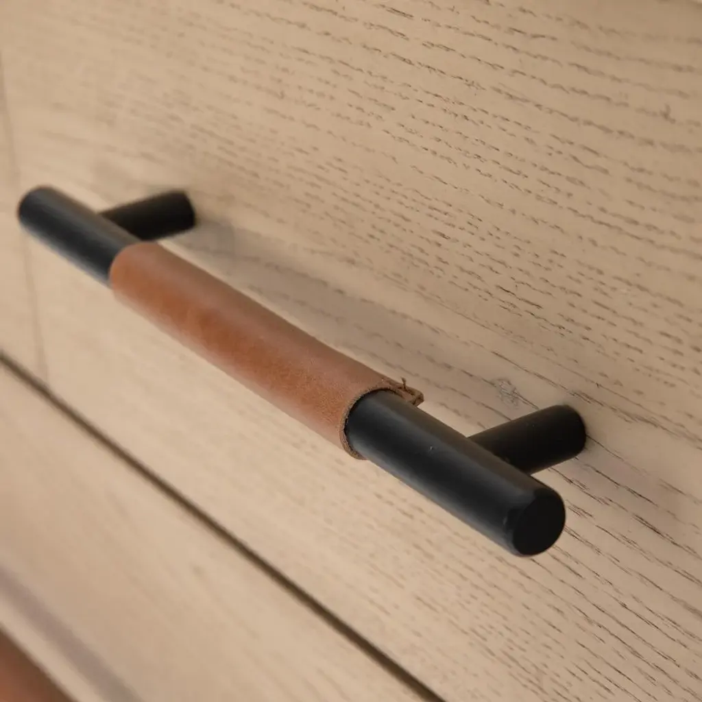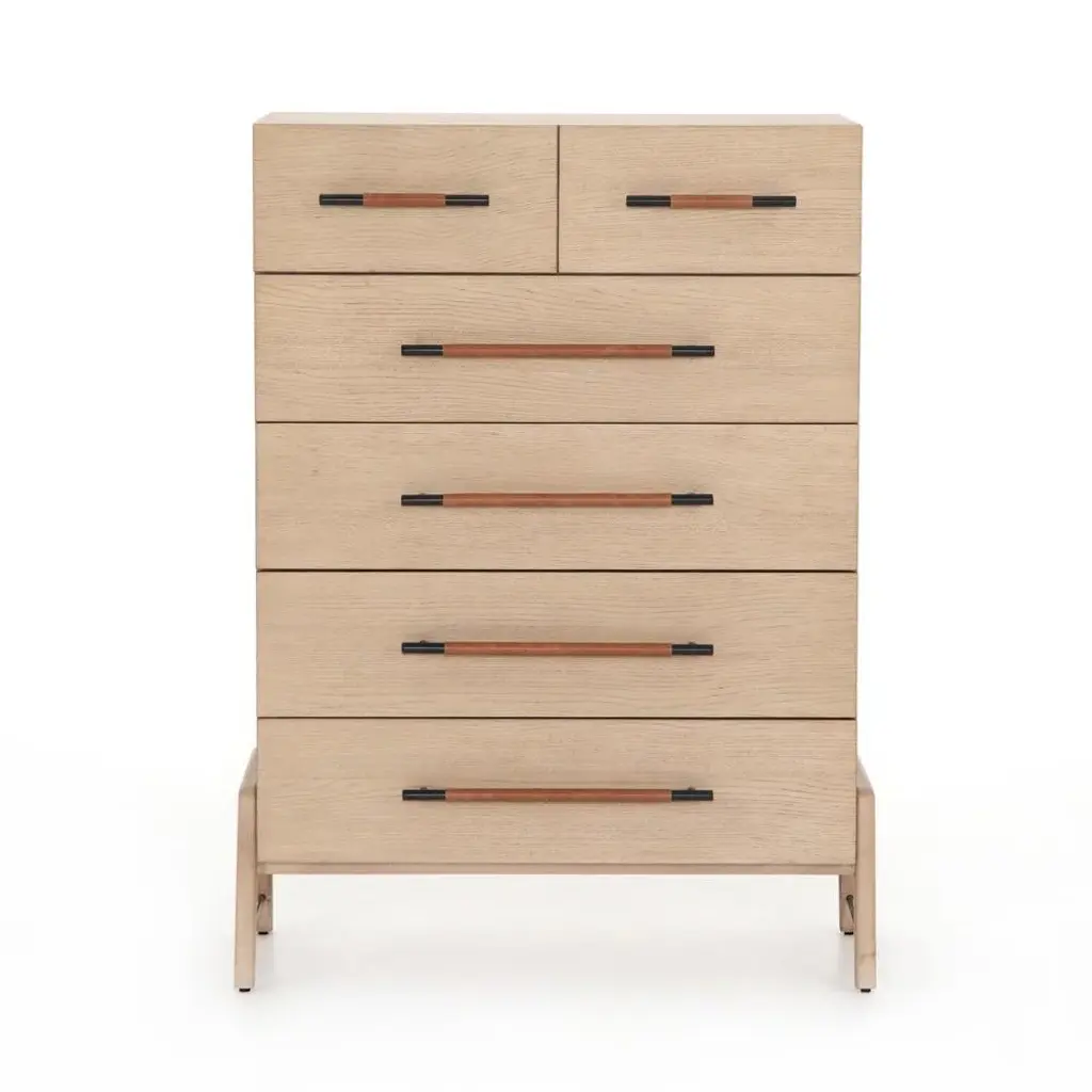 Light-finished oak forms a clean silhouette for six spacious drawers with iron hardware wrapped in tan top-grain leather. Assembly Required? Yes