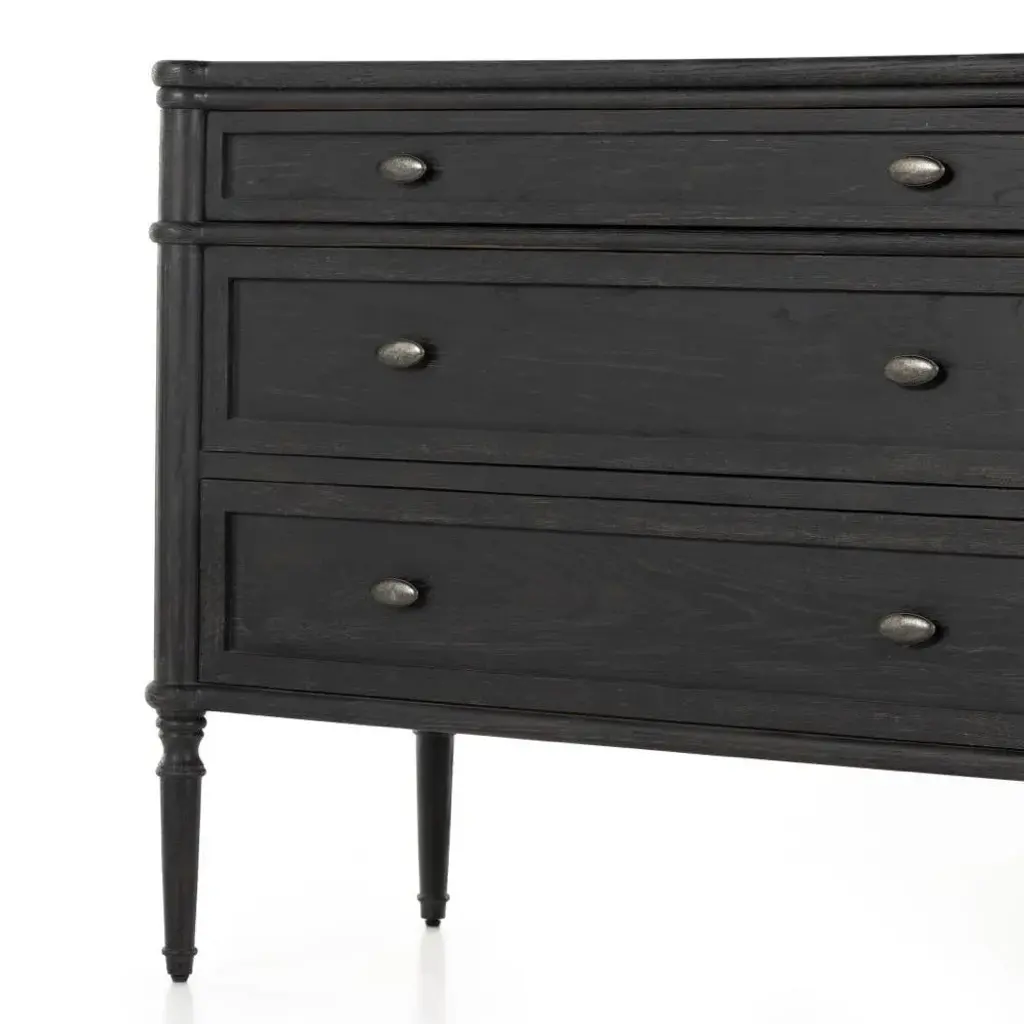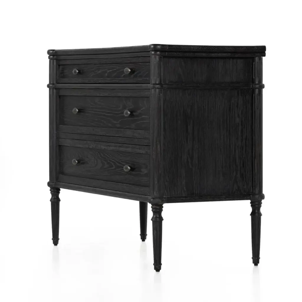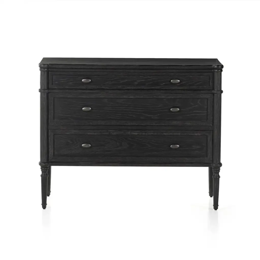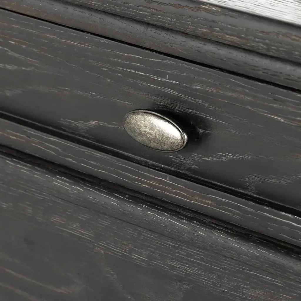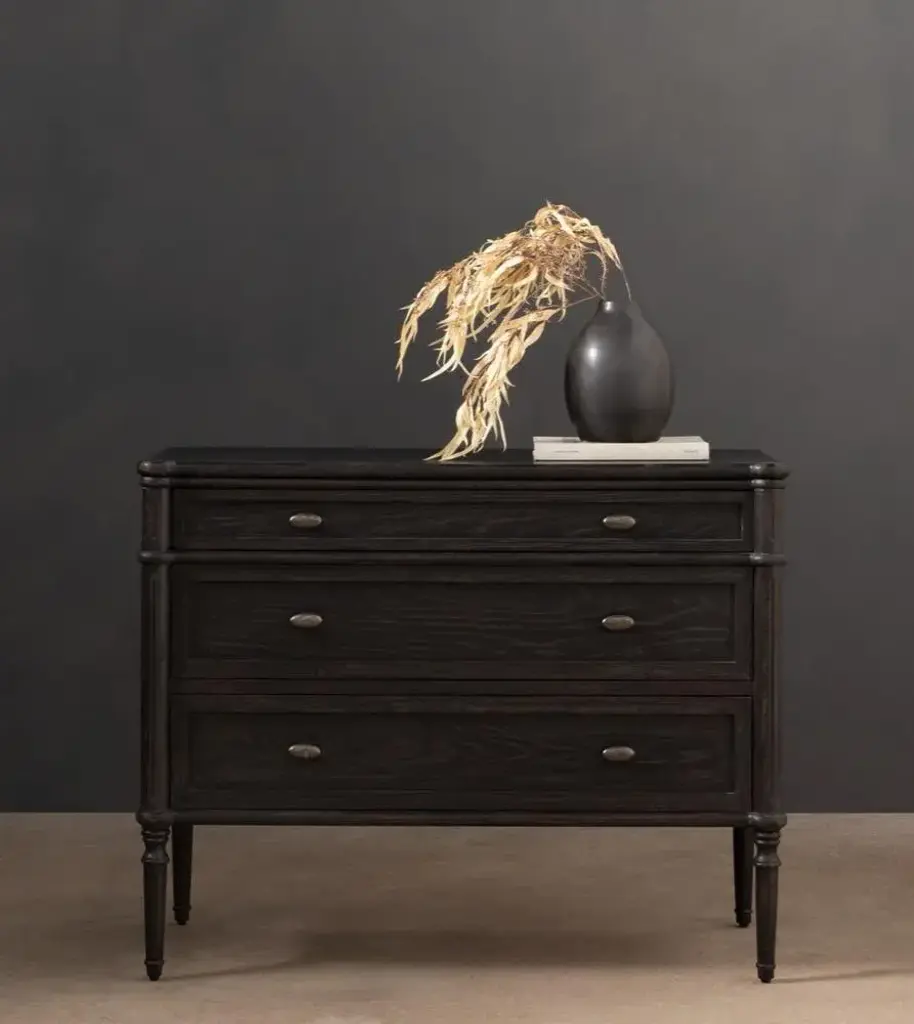 Made from oak veneer with slim, solid oak legs finished in a distressed black, a vary-sized drawers bring antique European vibes to modern bedroom styling. Assembly Required? Yes