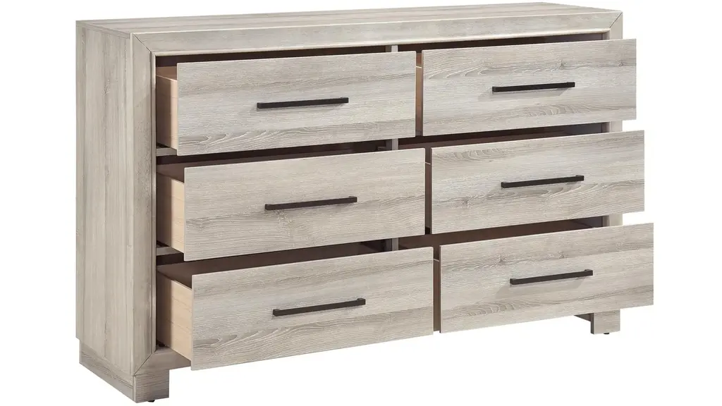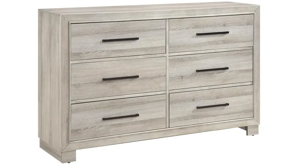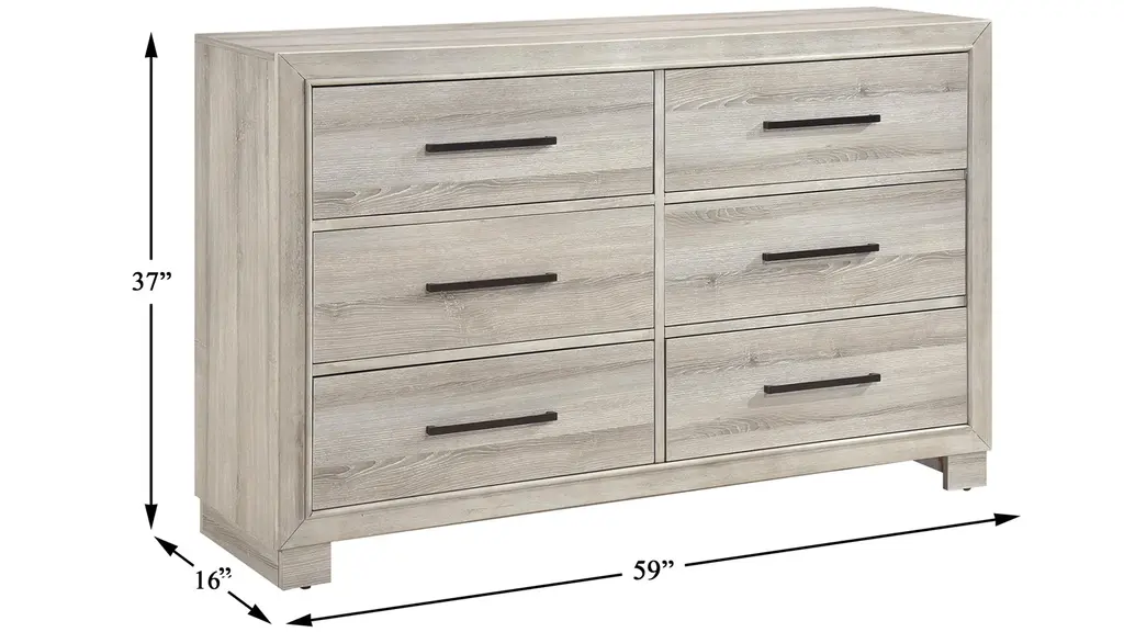 Organize your wardrobe with ease and style using the modern Fraser Dresser. Finished in a sophisticated gray, this dresser offers ample storage with its six smooth-gliding dovetail drawers, each equipped with durable metal-on-metal center glides for reliable use. The elegant antique brass tone bar pulls add a touch of refinement, complementing the dresser's clean and contemporary design. Crafted from a sturdy combination of premium melamine board, wood, and engineered wood, this dresser provides lasting durability and a sleek aesthetic. Best of all, this dresser arrives fully assembled, allowing you to enjoy its functionality and beauty immediately.