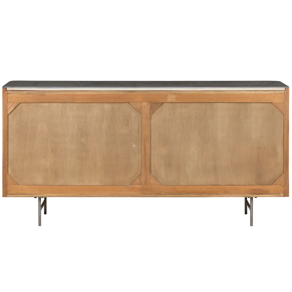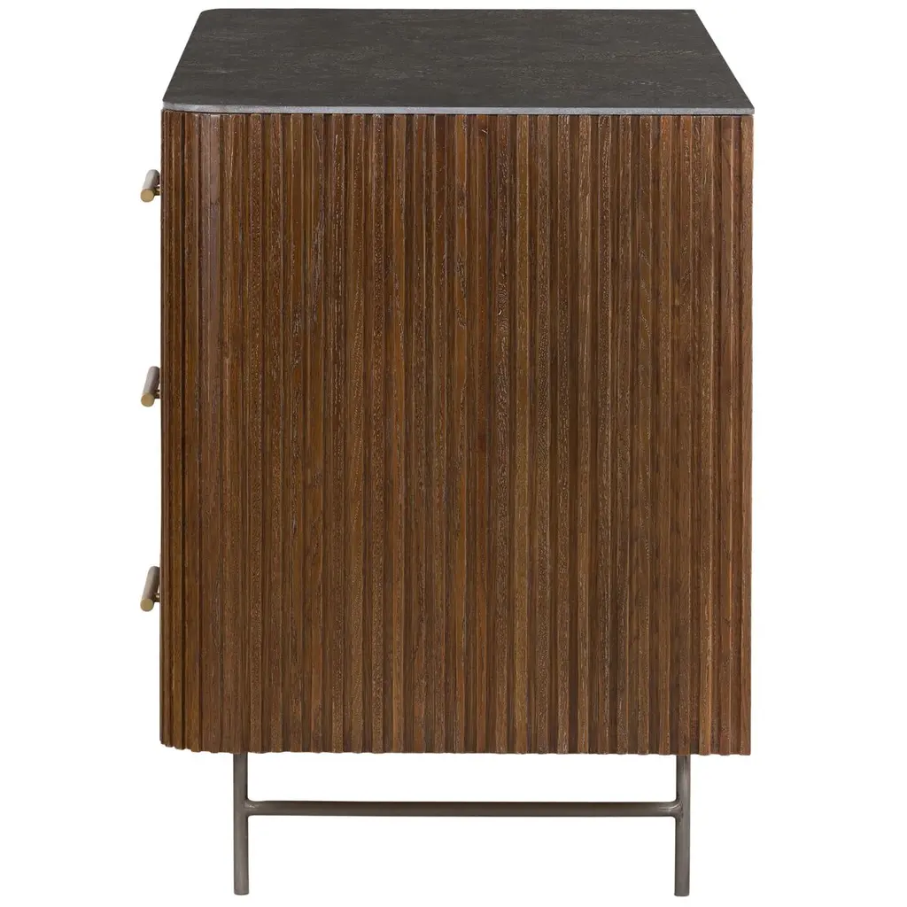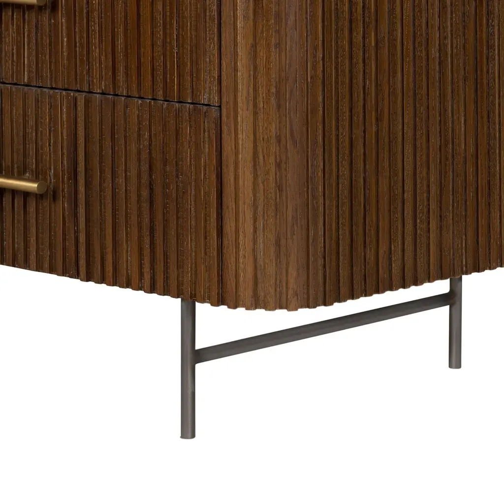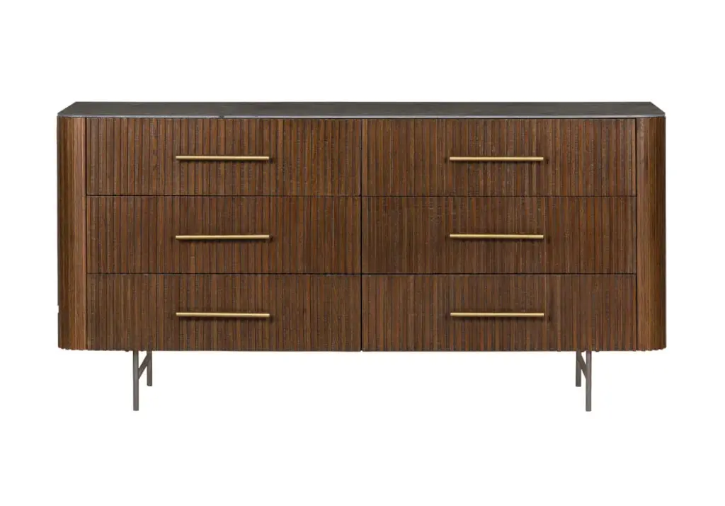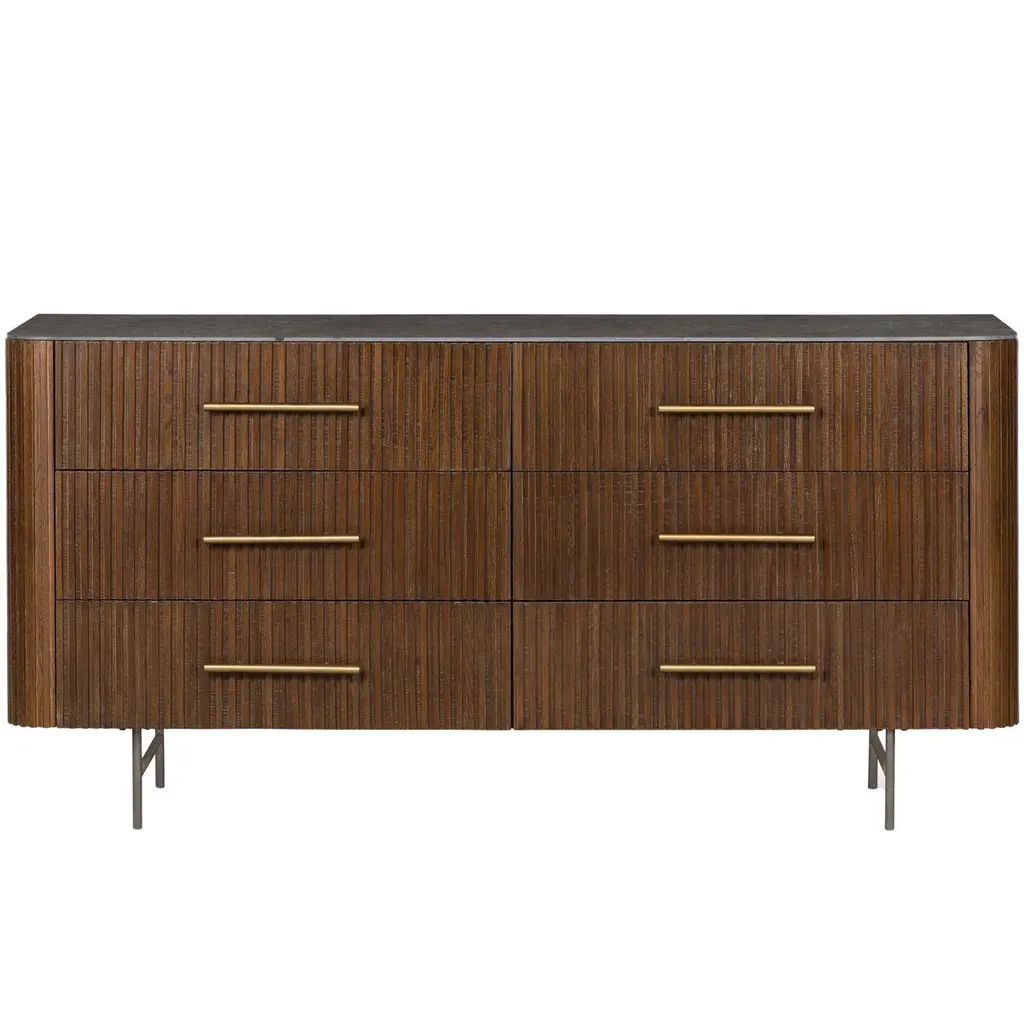 Reeding brings rich texture and timeless elegance to this six-drawer dresser, which is crafted of durable oak with a top made of bluestone for a textural contrast. The curved corners and the slender iron legs lend a Mid-Century Modern sleekness.