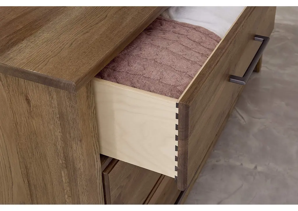 Made in the USA; this chest with five drawers natural oak finish offers casual style to any bedroom in your home. Made from solid American White Oak. Weight 260.000 lbs. (117kgs.)