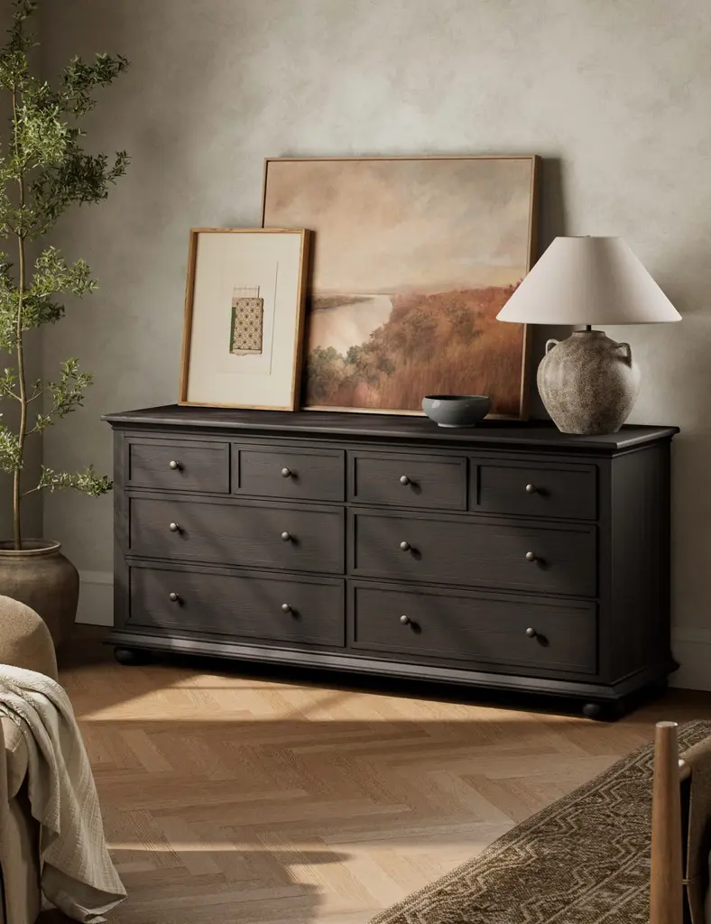 Four Hands brings their exceptional craftsmanship to a timeless collection rooted in Amber Lewis' perennial California style. Bun feet add a vintage touch of craftsmanship to this wooden dresser. Its wide silhouette delivers eight spacious drawers for clothing and accessories in a dresser design that emphasizes the natural beauty of oak.
