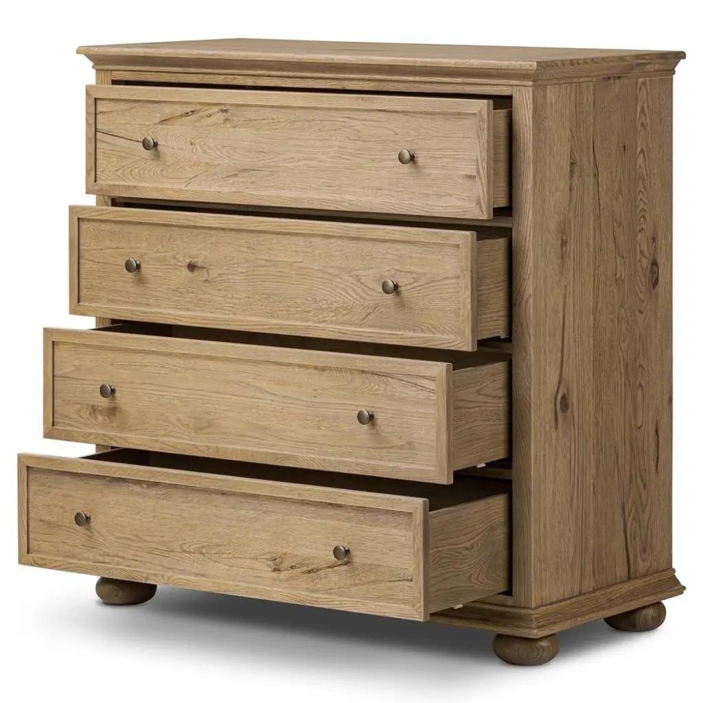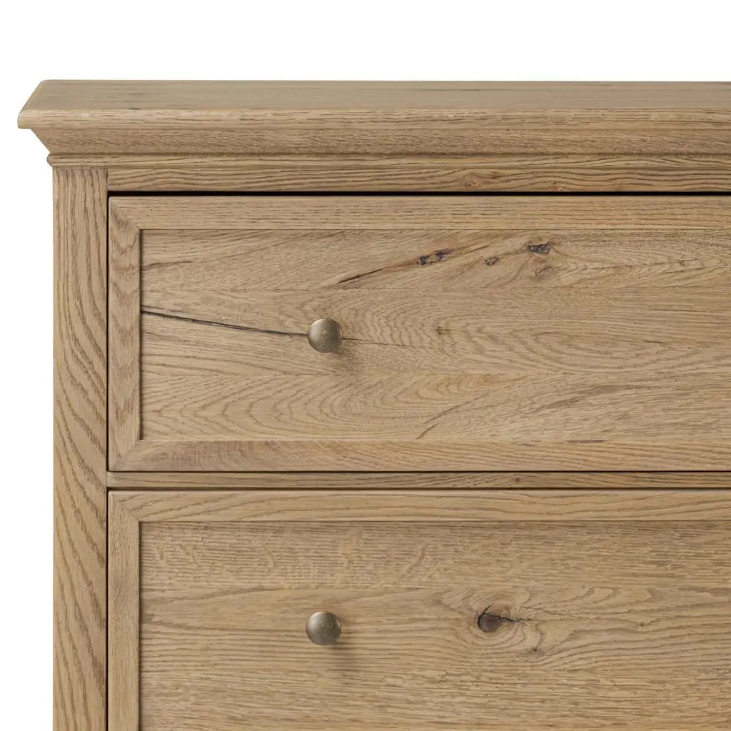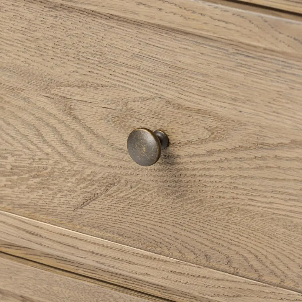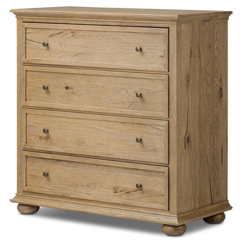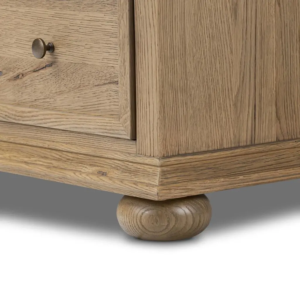 A design collaboration by Amber Lewis and Four Hands.Aged oak veneer with natural marks and graining, reflect the heritage inspiration behind this versatile dresser. Intricate molding, squished bun feet and brushed brass hardware complete the look in a light brown finish.