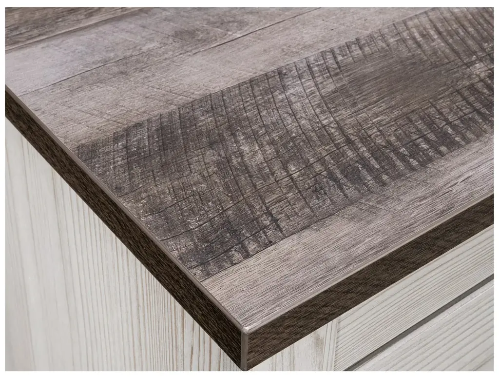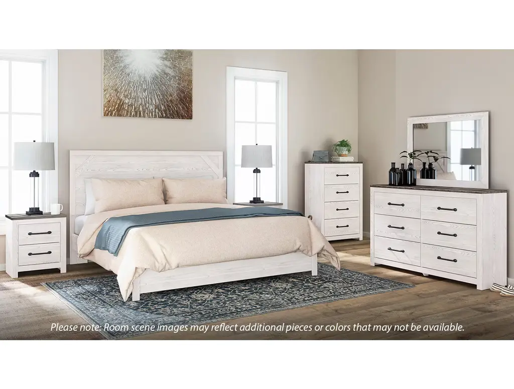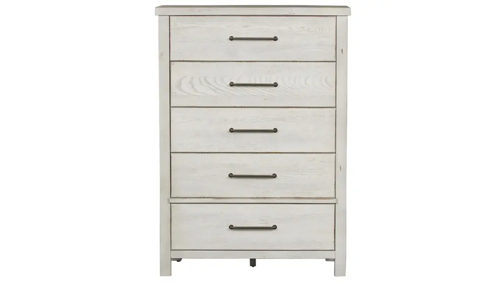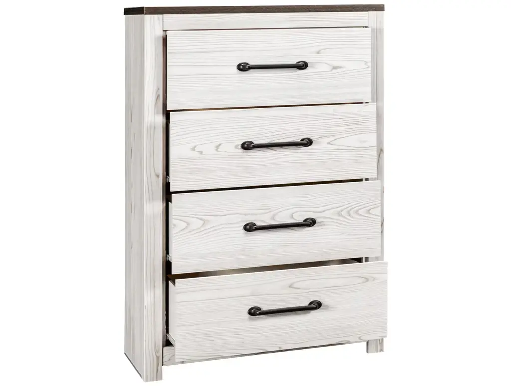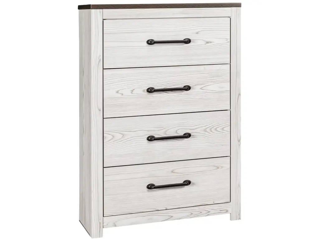 Organize your bedroom essentials in the Ashley Gerridan 4 Drawer Chest. The four French dovetail drawers offer ample space to neatly store clothing and other items. The white finish brightens any bedroom, and the contrast grey top and antique brass horizontal drawer pulls make it easy to coordinate with most interior color schemes.
