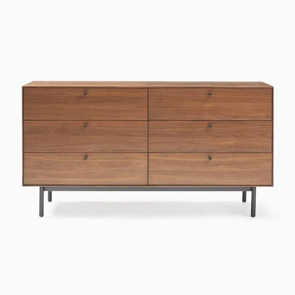 Kiln-dried walnut veneer over engineered wood. Covered in a water-based Cool Walnut finish. All wood is FSC®-certified. Your purchase of this product helps support forests and ecosystems worldwide. Learn more. Metal legs and hardware in an Antique Bronze finish. 6 drawers open on smooth metal glides and feature English Dovetail joinery. Legs have built-in levelers to adapt to varying floor levels. This contract-grade item is manufactured to meet the demands of commercial use in addition to residential. See more. Made in a Fair Trade Certified™ facility, benefiting the workers who make it. Made in Vietnam.