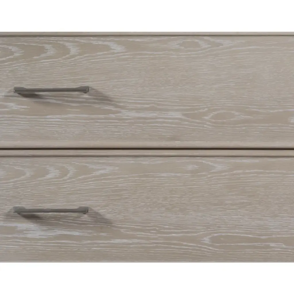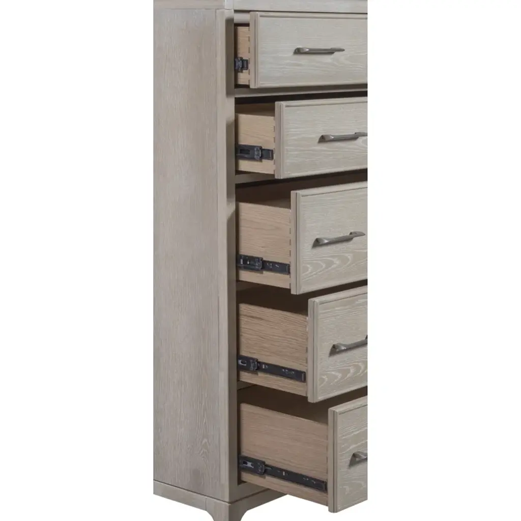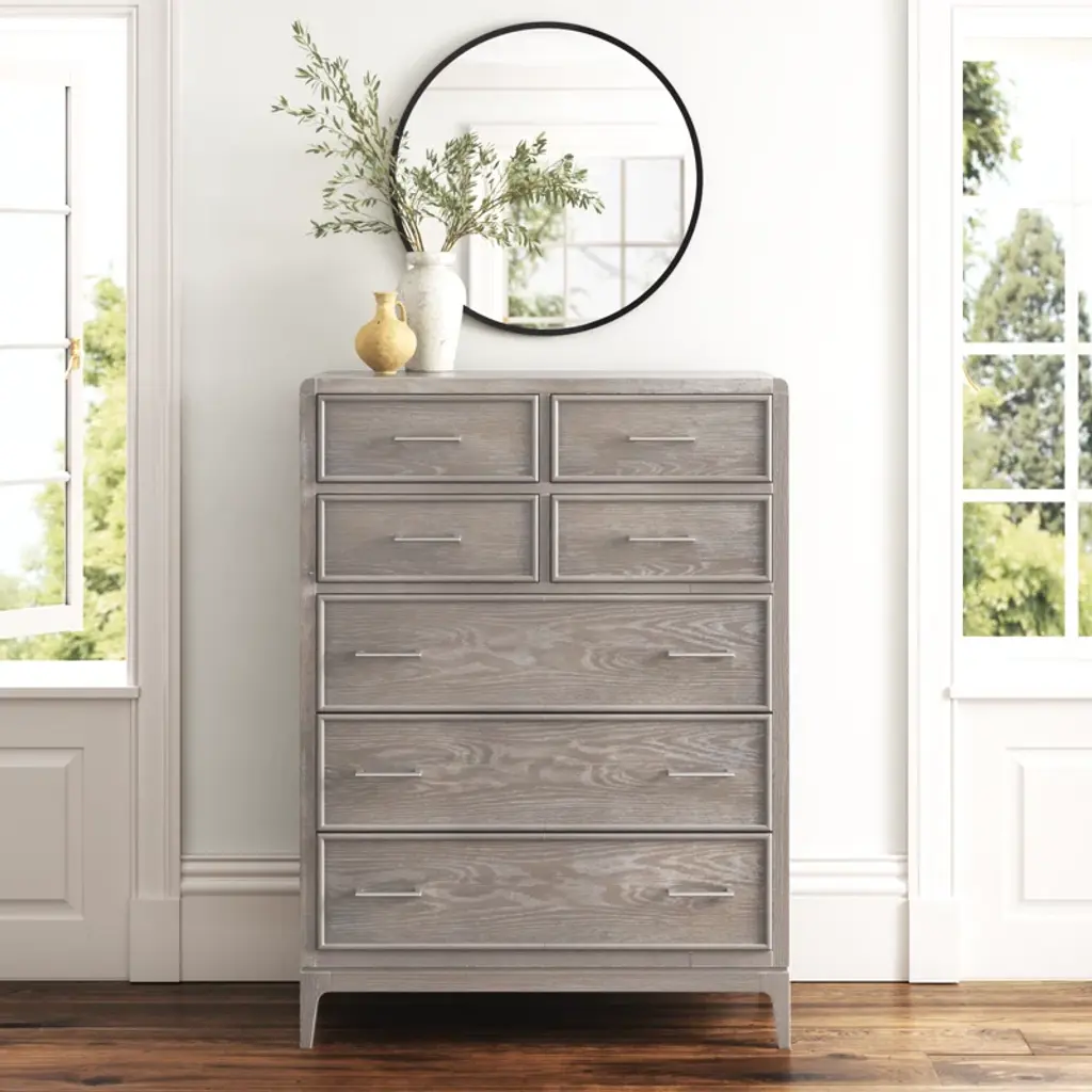 Elevate your bedroom with this seven-drawer dresser, a blend of engineered and solid wood that offers ample storage in a vertical orientation. The oak veneer and rubberwood solids create a warm, rustic-inspired look, while the metal handles add a touch of sophistication. With full-extension glides and safety stops, these drawers provide easy access to your belongings. The wood scoring and rub-through distressing give it a well-loved appearance. Plus, a tipover restraint device is included for added peace of mind. Remember, this dresser is intended for home use only.