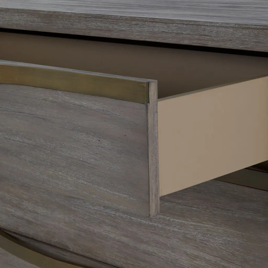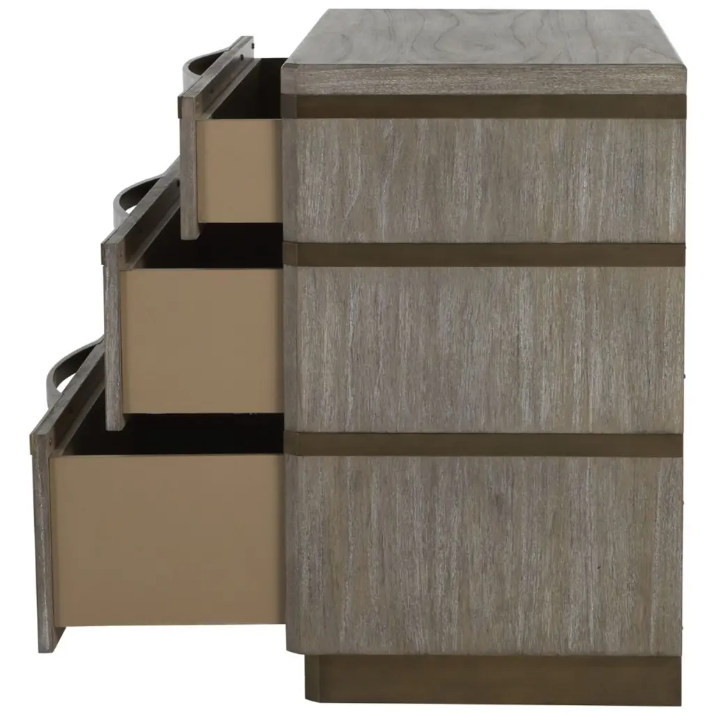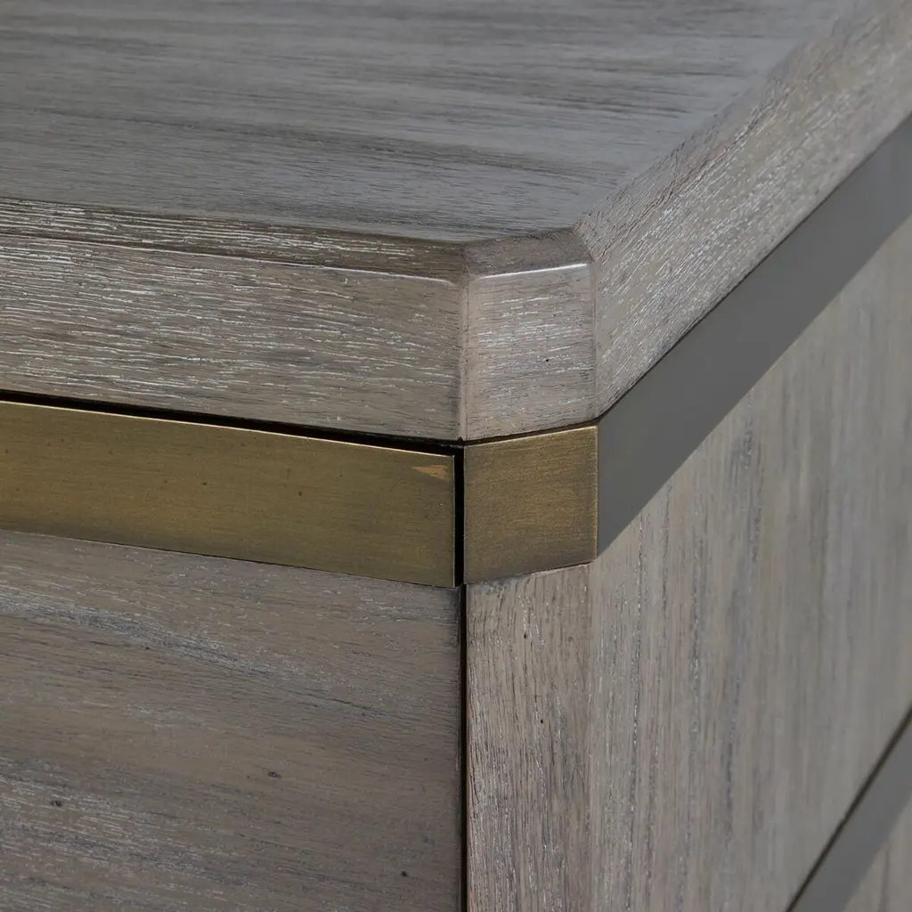 The Gillespie Chest embodies meticulous attention to detail, featuring slender metal bands that double as innovative drawer pulls, adding a sleek, contemporary edge. The chest's faceted edges and distinguished finish reflect the thoughtful design nuances that are known for, with undermount soft-close drawer glides enhancing functionality through subtle, user-friendly features.