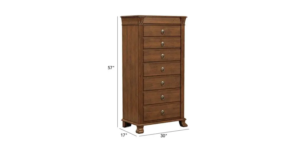 Handcrafted in our American workshops. This seven-drawer island beauty offers plenty of storage in a compact space. Reeded pilasters, intricate wood carvings, and decorative ring-pull hardware add elegance and style to this useful piece.