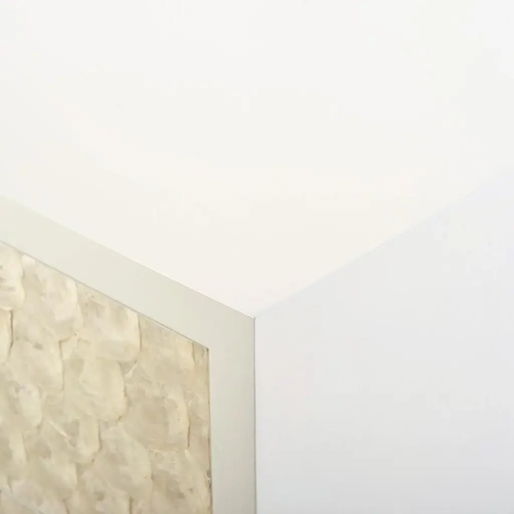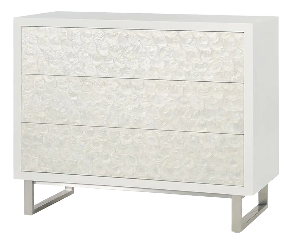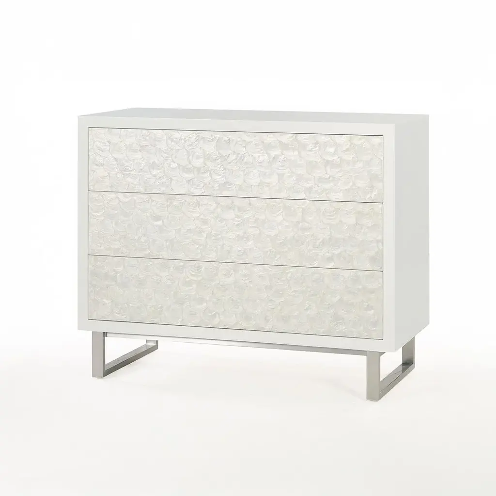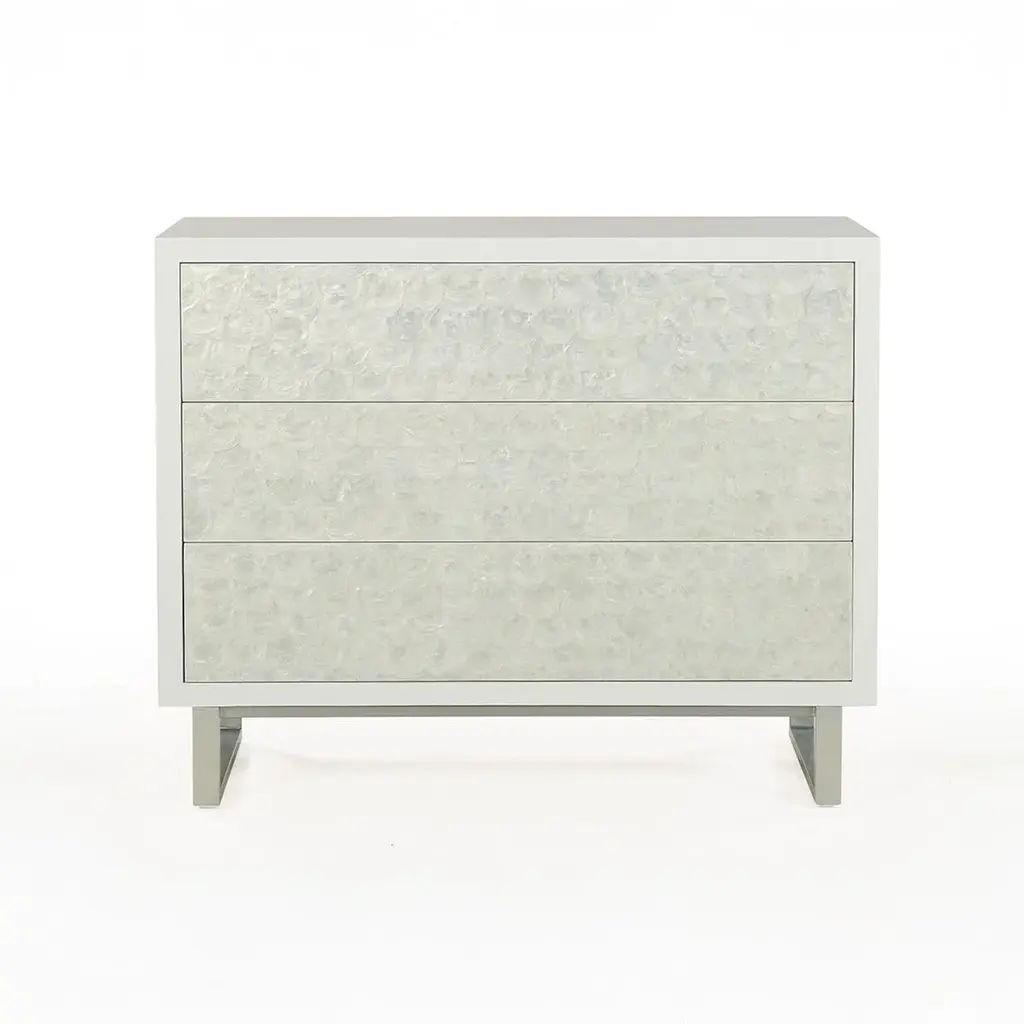 The chest of drawers brings a serene yet striking presence to contemporary interiors. Its sleek silhouette is finished in a soft Ghost tone, creating the perfect canvas for the pearlescent shell-adorned drawer fronts that shimmer with natural texture and elegance. Three soft-close drawers operate with seamless push/pull functionality, offering ample storage without the distraction of visible hardware. Set atop a streamlined aluminum base, this piece balances modern minimalism with luminous detail—ideal for bedrooms, living spaces, or entryways where understated glamour is desired. Refined in shape and radiant in texture, it’s a sophisticated focal point with effortless appeal. Dimensions: 42" W x 19" D x 34" H