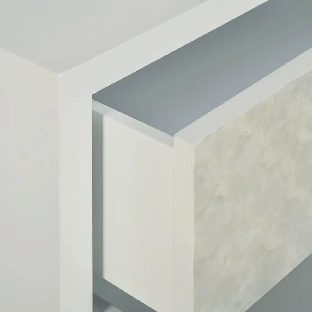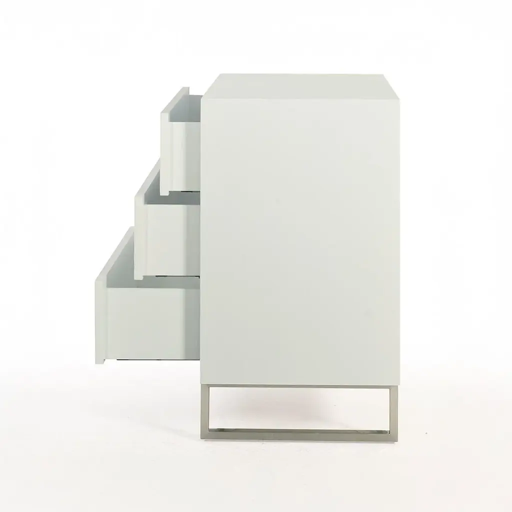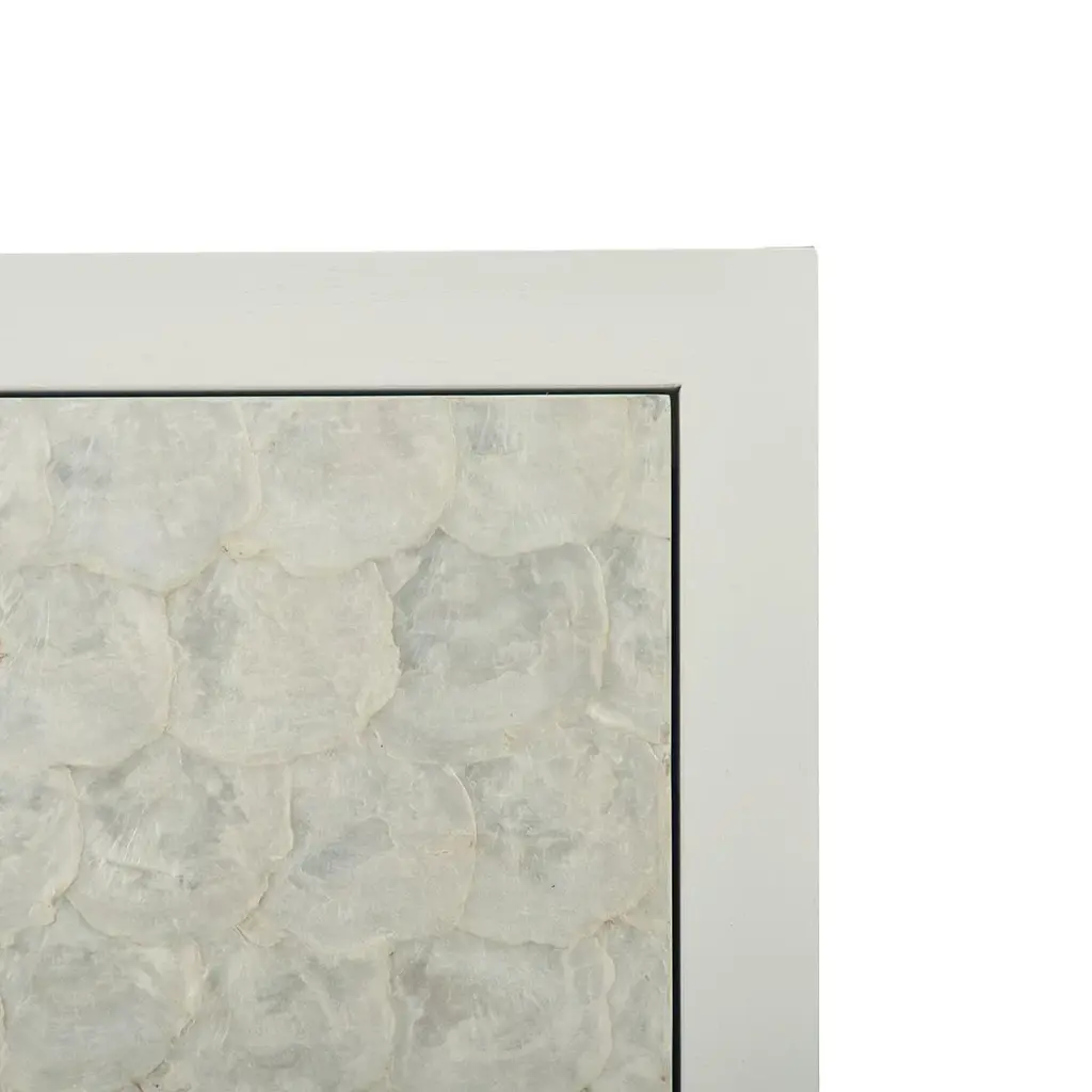 The chest of drawers brings a serene yet striking presence to contemporary interiors. Its sleek silhouette is finished in a soft Ghost tone, creating the perfect canvas for the pearlescent shell-adorned drawer fronts that shimmer with natural texture and elegance. Three soft-close drawers operate with seamless push/pull functionality, offering ample storage without the distraction of visible hardware. Set atop a streamlined aluminum base, this piece balances modern minimalism with luminous detail—ideal for bedrooms, living spaces, or entryways where understated glamour is desired. Refined in shape and radiant in texture, it’s a sophisticated focal point with effortless appeal. Dimensions: 42" W x 19" D x 34" H