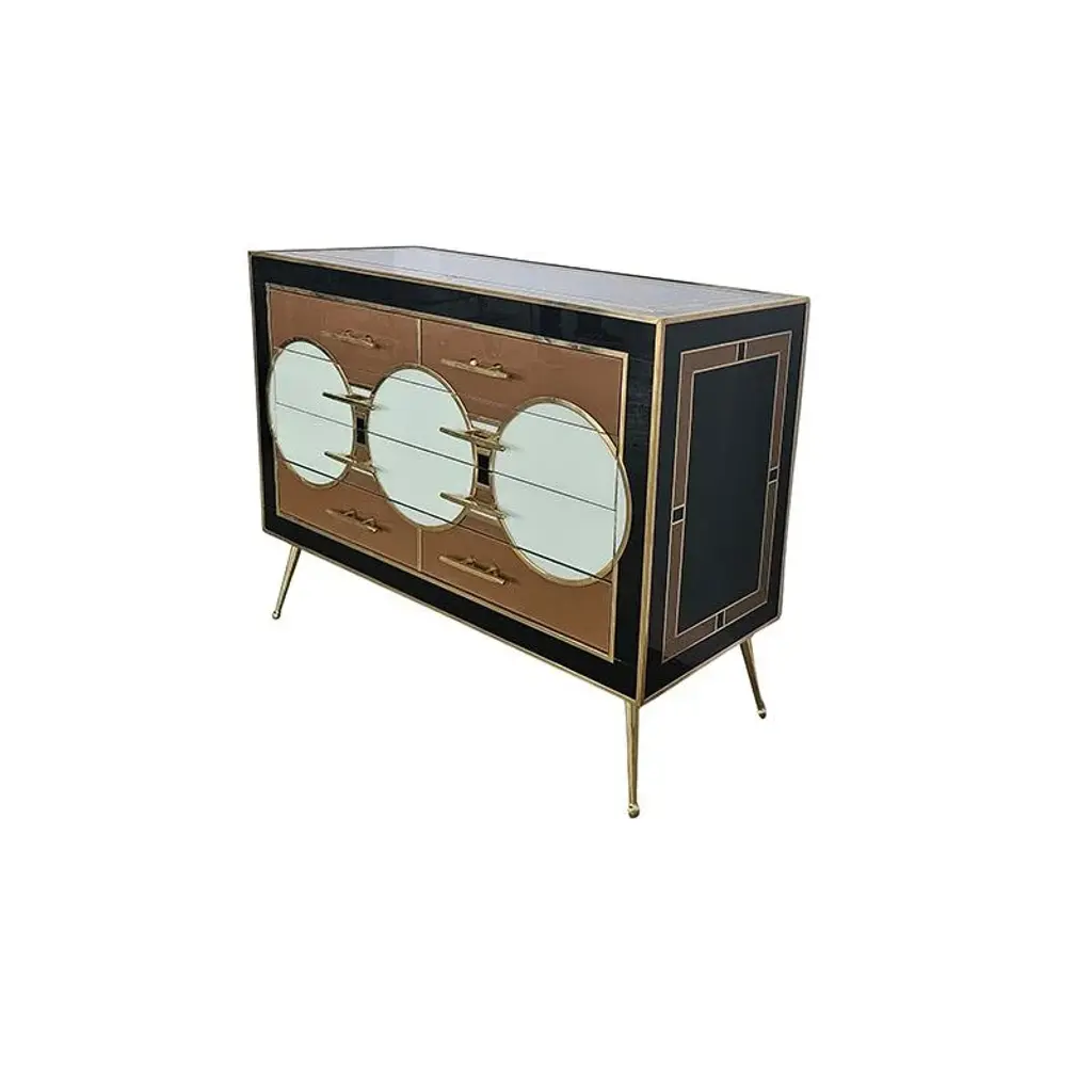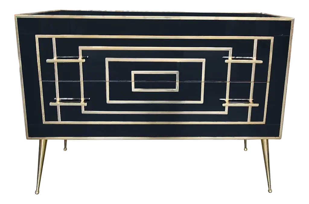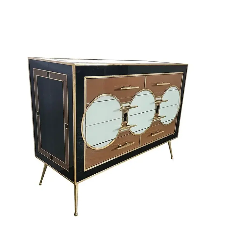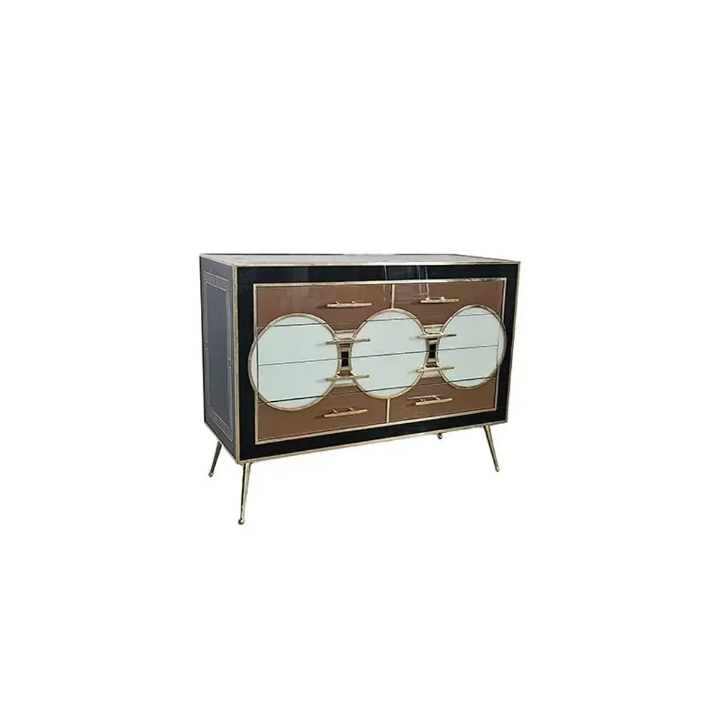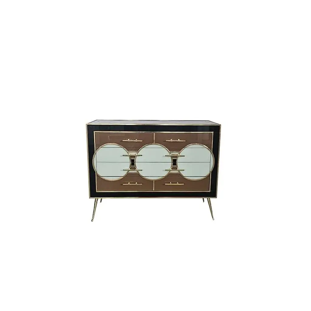 4-drawer dresser, entirely handmade, with wooden structure, covered in black and brown glass, enriched with round designs in white glass and geometric plays of black and brown on the sides and top. Profiles, handles and feet in golden brass. Dimensions (wxdxh) 110 x 45 x 86 cm