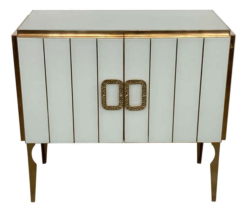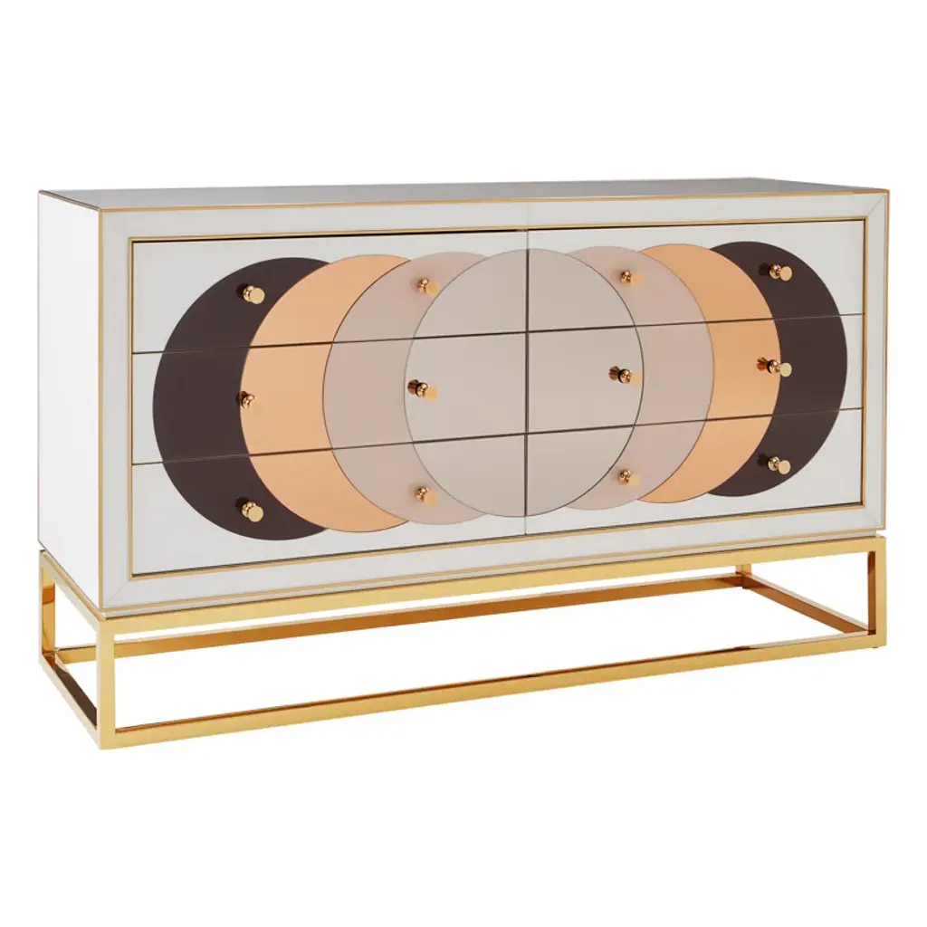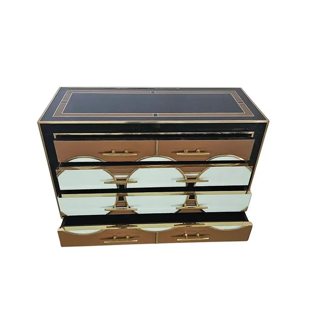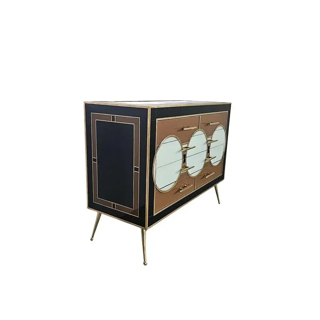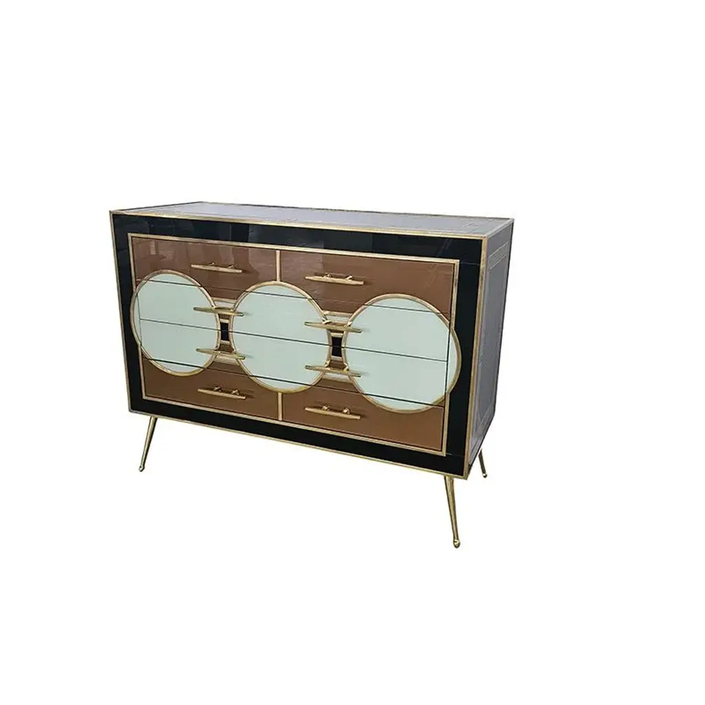 4-drawer dresser, entirely handmade, with wooden structure, covered in black and brown glass, enriched with round designs in white glass and geometric plays of black and brown on the sides and top. Profiles, handles and feet in golden brass. Dimensions (wxdxh) 110 x 45 x 86 cm