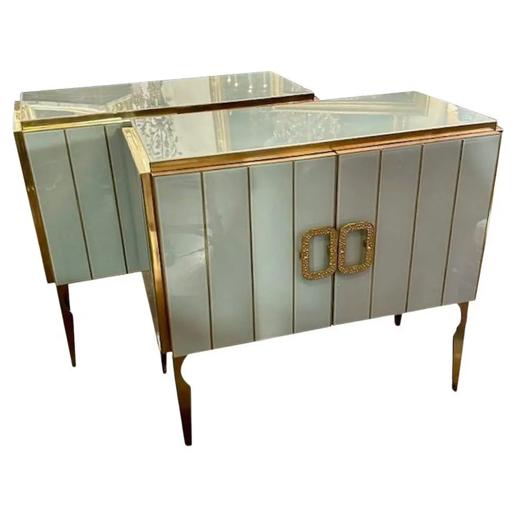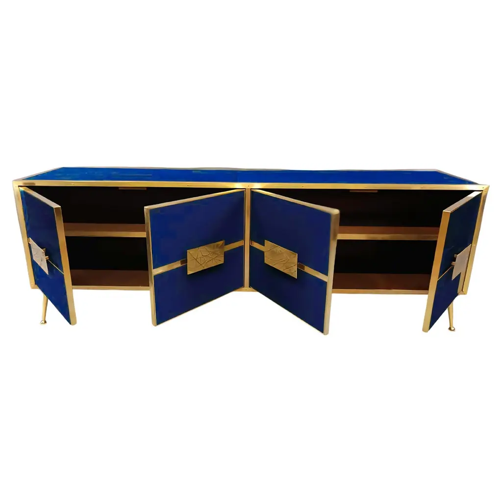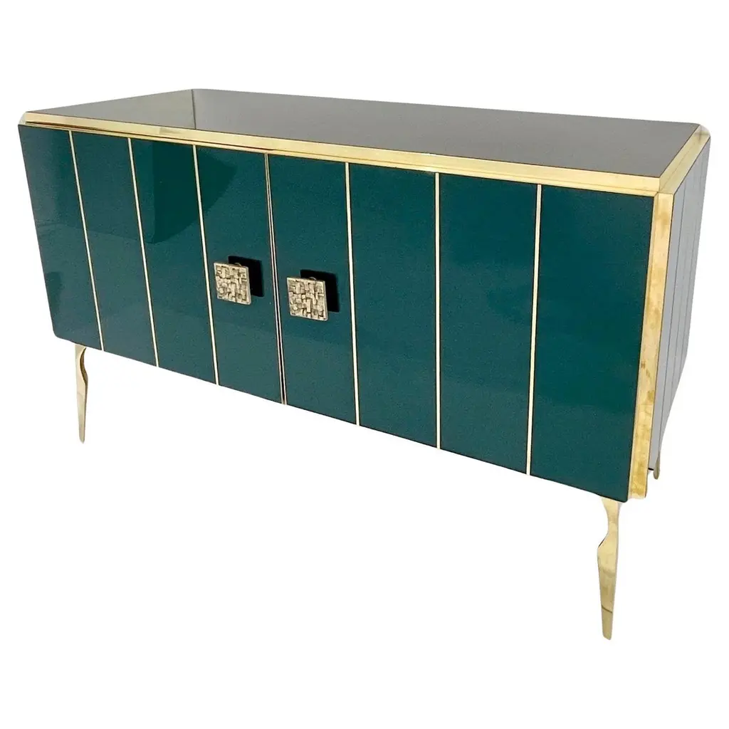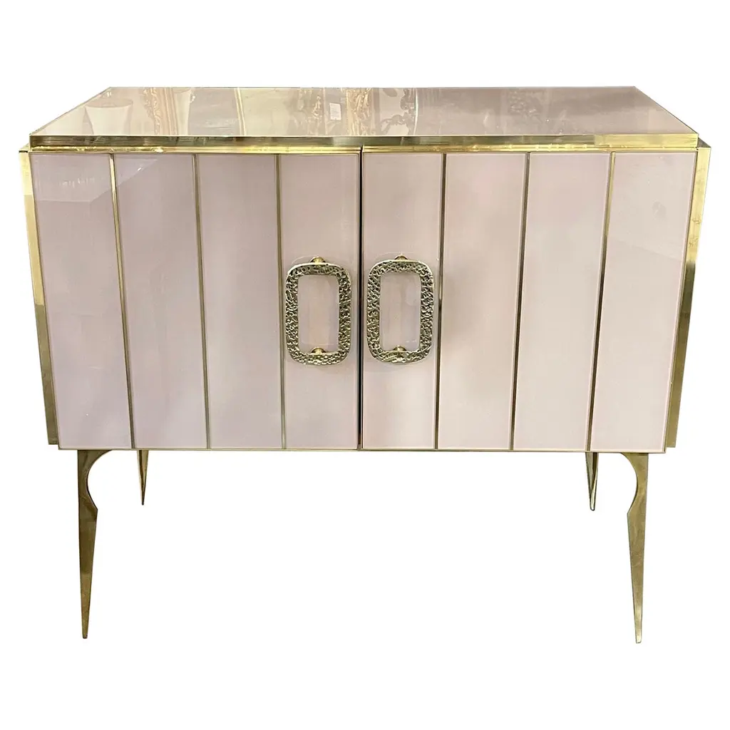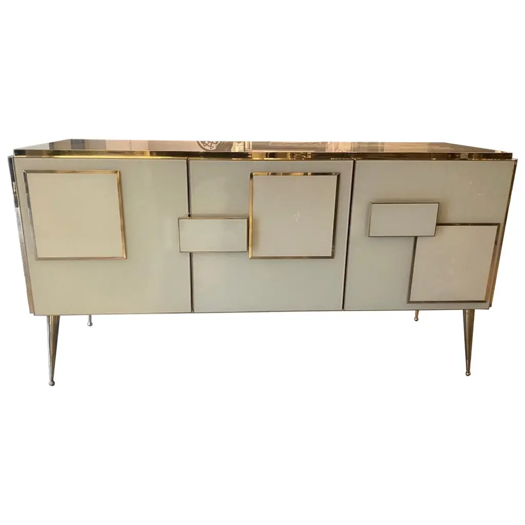 4-drawer dresser, entirely handmade, with wooden structure, covered in black and brown glass, enriched with round designs in white glass and geometric plays of black and brown on the sides and top. Profiles, handles and feet in golden brass. Dimensions (wxdxh) 110 x 45 x 86 cm