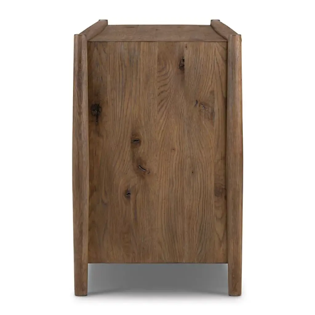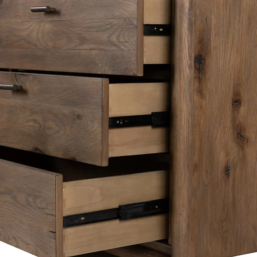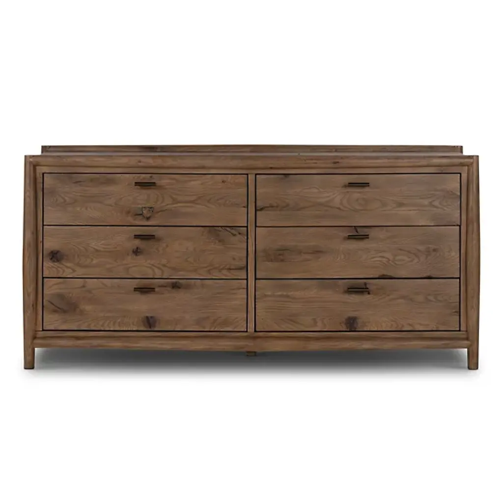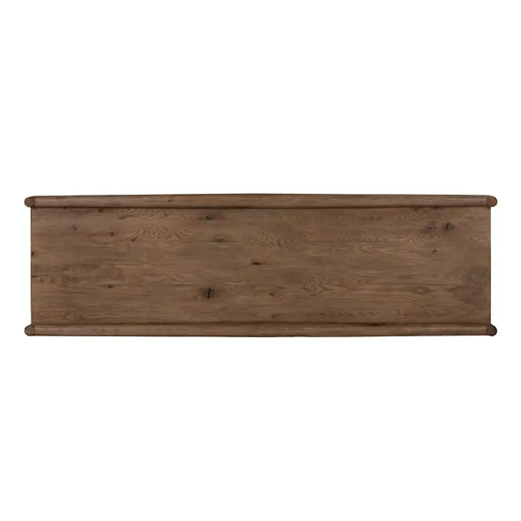 The Glenview 6-Drawer Dresser from Four Hands blends textured elegance with contemporary flair, bringing a renewed sense of tradition to your bedroom. Made from rustic weathered oak and smooth veneer, this dresser features a spindle-inspired structure that adds welcome intricacy. Its thick oak veneer and solid oak construction ensure lasting durability, while six spacious drawers provide ample storage. This dresser marries retro charm with functional design, making it a versatile addition to any indoor ensemble.