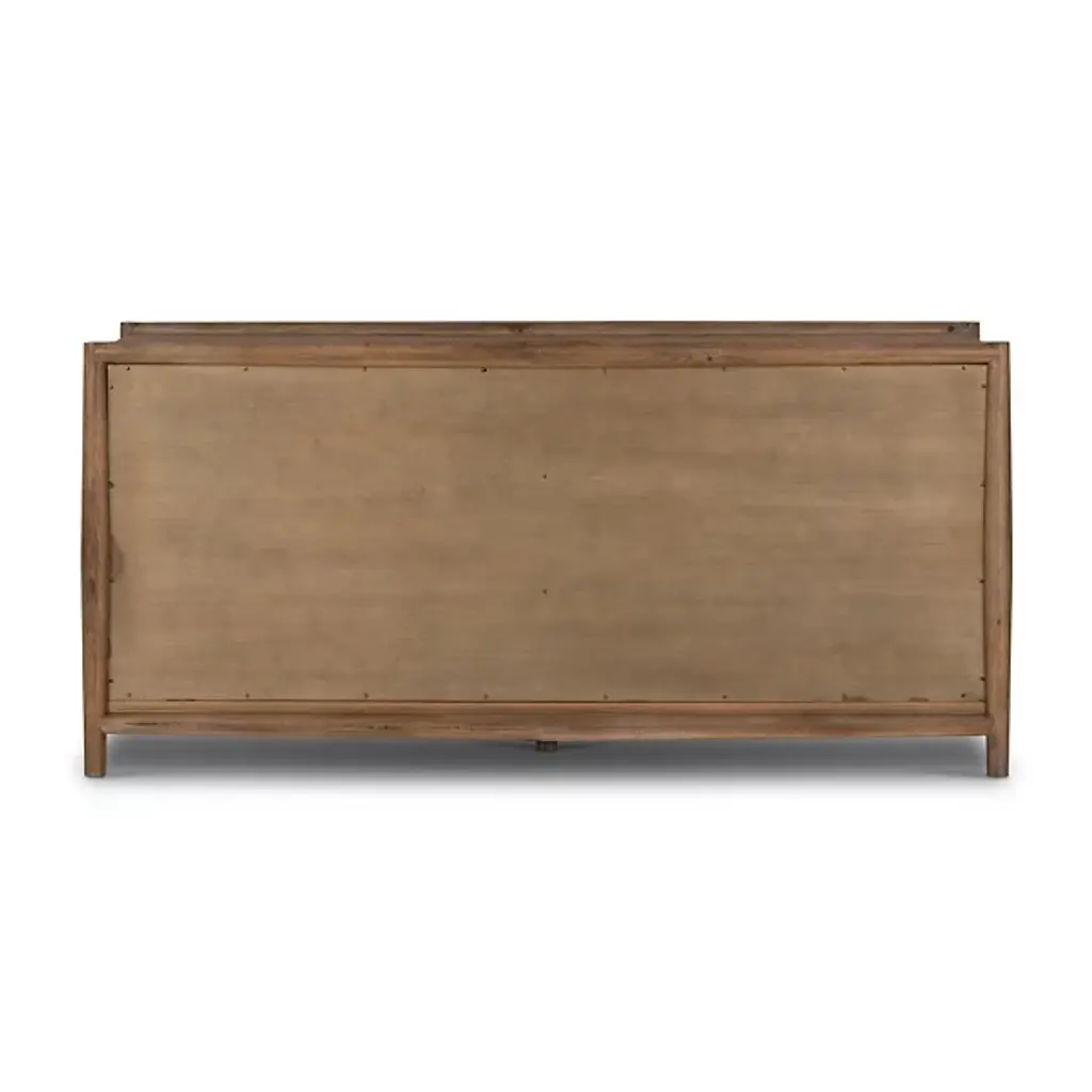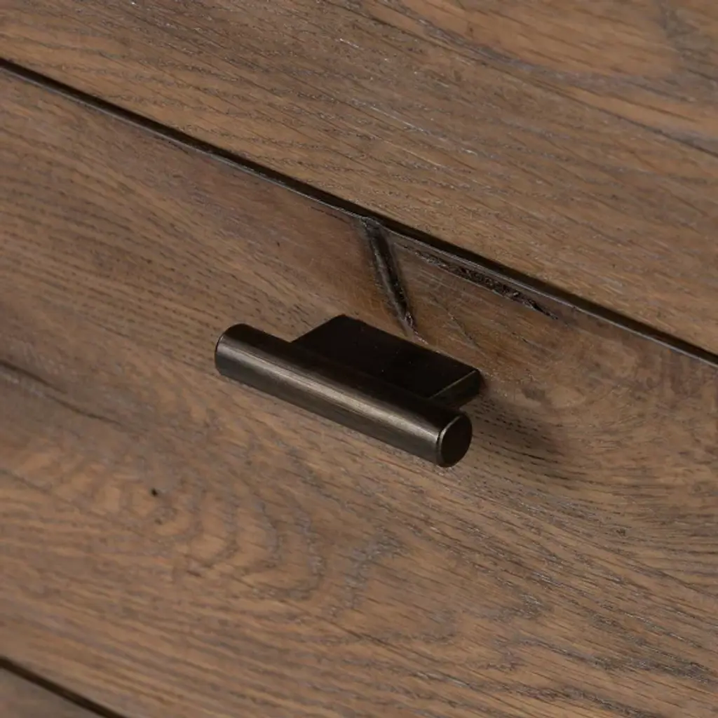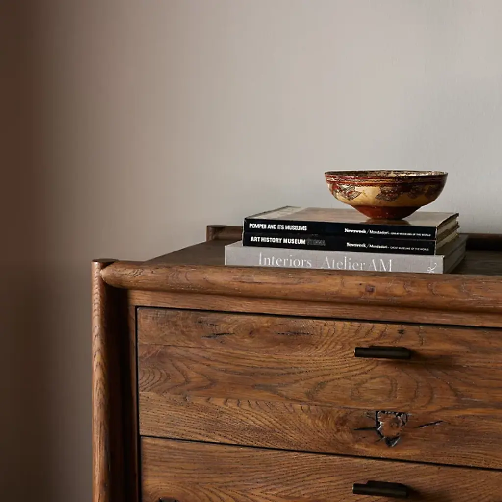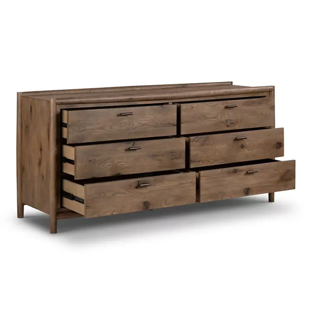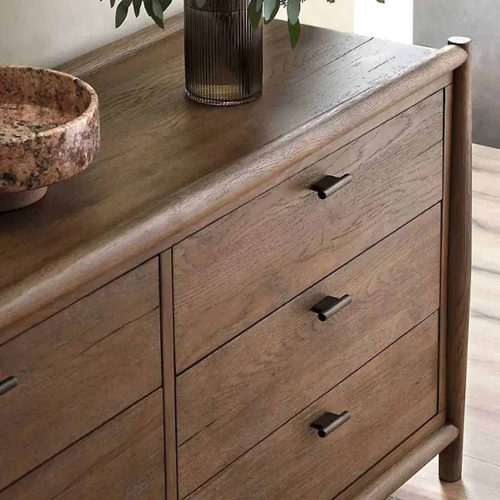 The Glenview 6-Drawer Dresser from Four Hands blends textured elegance with contemporary flair, bringing a renewed sense of tradition to your bedroom. Made from rustic weathered oak and smooth veneer, this dresser features a spindle-inspired structure that adds welcome intricacy. Its thick oak veneer and solid oak construction ensure lasting durability, while six spacious drawers provide ample storage. This dresser marries retro charm with functional design, making it a versatile addition to any indoor ensemble.