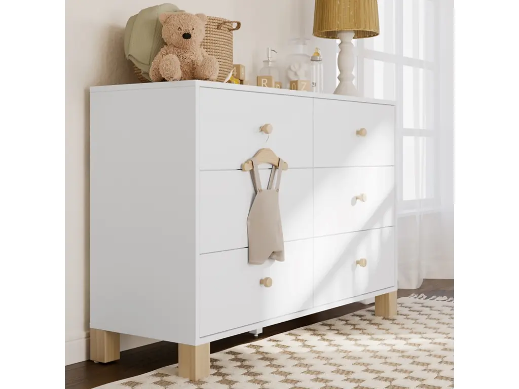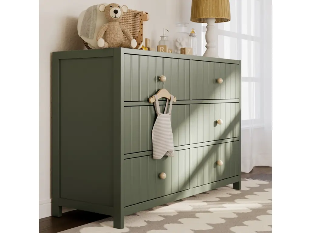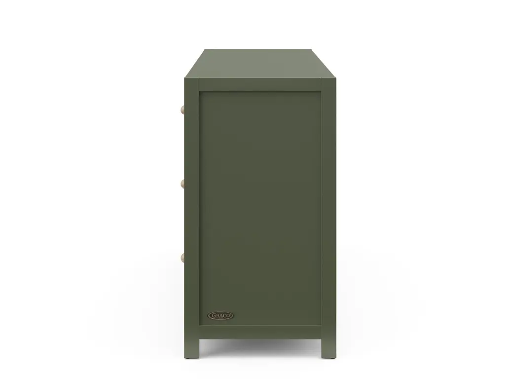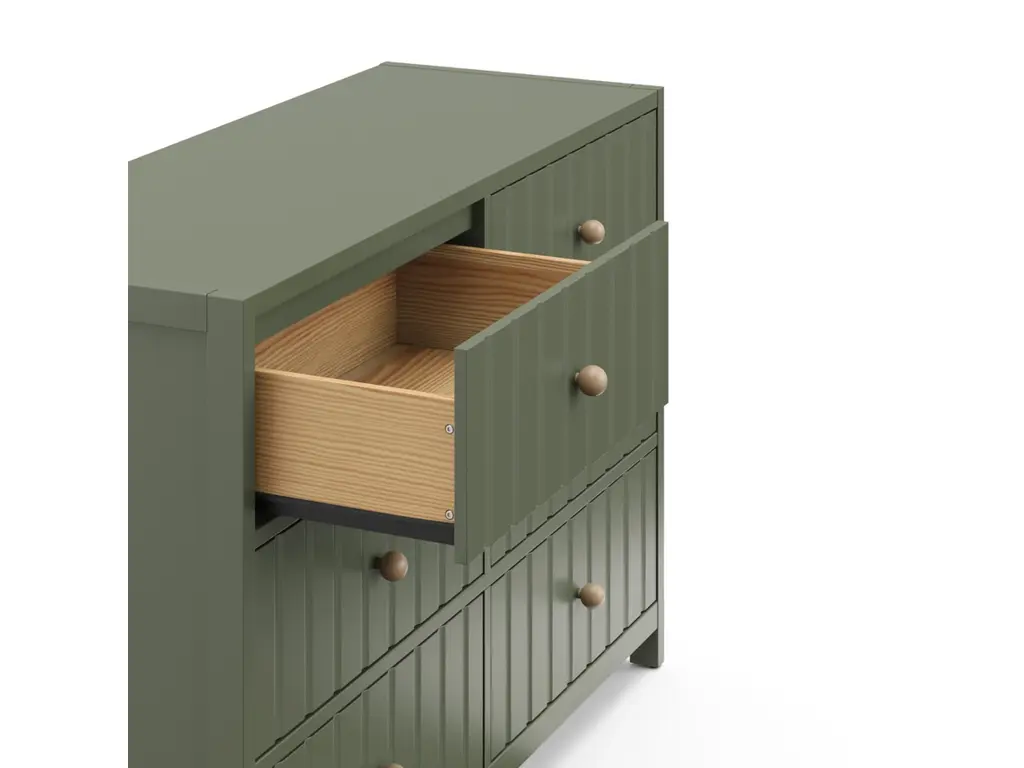 Introducing the Graco Teddi 6 Drawer Dresser, a timeless, transitional dresser with elevated drawer panels, the perfect addition to elevate your nursery or kids' bedroom and enhance its functionality and style. This chic and spacious dresser combines modern aesthetics with practical functionality, featuring subtle routing details with a subtle stripe motif that enhance its sophisticated appeal, adding a touch of elegance to your space. Let your personality shine by choosing your own knobs, as the Teddi includes two sets of knobs: painted knobs in the color of the dresser for a monotone look, or driftwood knobs for a pop of two-tone style. With both painted knobs and driftwood knobs included, the Teddi ensures seamless coordination with a variety of finishes and collections, allowing you to customize your space to your liking. Enjoy a hassle-free assembly experience with pre-installed drawer tracks, ensuring smooth-gliding drawers from the moment you unpack. The versatile design of the Graco Teddi 6 Drawer Dresser effortlessly complements any style of nursery or kids' bedroom furniture, providing endless possibilities for your space. Safety is paramount, and the Teddi prioritizes it with its innovative interlocking drawer system. By allowing only one drawer to open at a time, this feature promotes safety and prevents accidents. Paired with the included furniture tip-over restraint kit, the Teddi further reduces the risk of furniture tip-over incidents, providing peace of mind for you and your family.