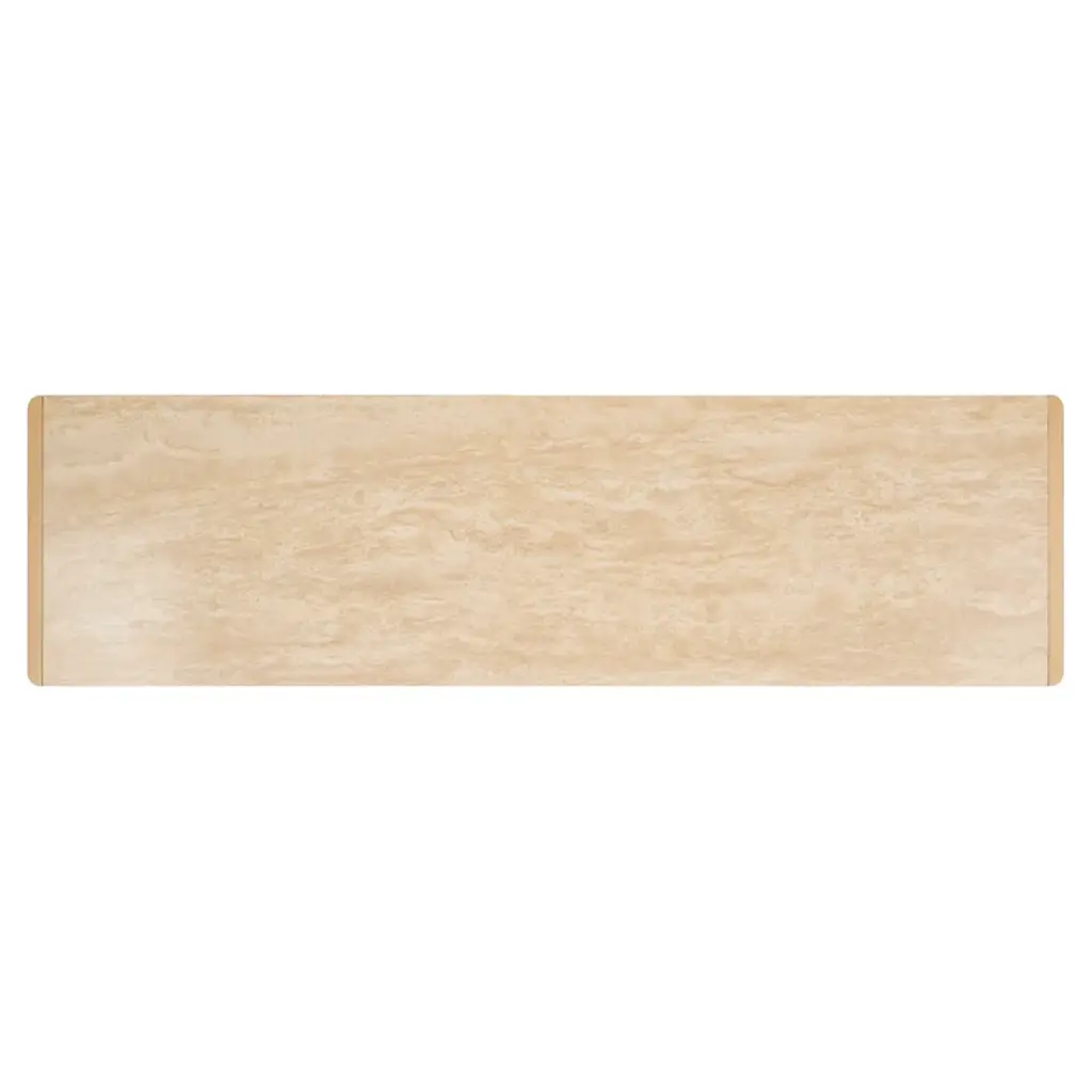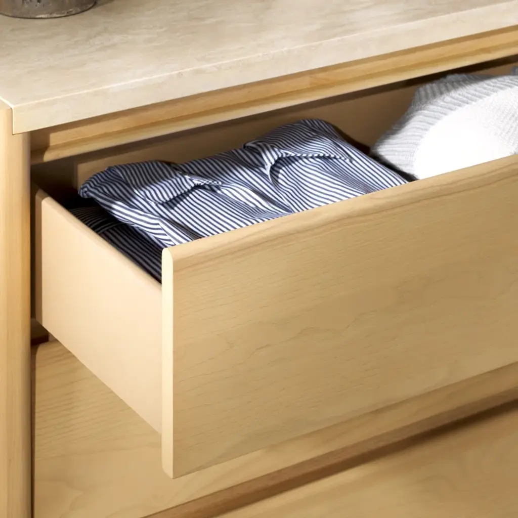 Stylish storage. This double dresser combines modern design with a mix of natural materials, creating a sophisticated and versatile addition to your bedroom. Crafted from kiln-dried ash and other solid wood, its minimalist profile showcases clean lines and an earthy palette. The six spacious drawers feature a travertine veneer, adding a touch of warmth and texture to the piece. Each drawer is equipped with ball bearing, soft-close roller glides and safety stops for smooth, secure storage. With its lined interiors and natural wood grain color variation, this dresser offers a sleek and practical solution for organizing.