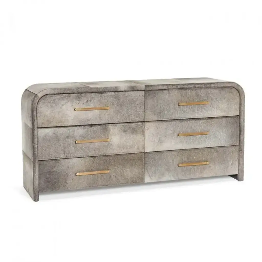Small dresser in quilted grey nubuk with top in beveled marble gray alpi. Base in light gold chrome stainless steel. Six big center handles in combination with gold chrome stainless steel and beveled marble.