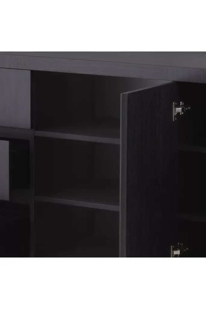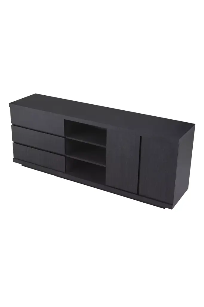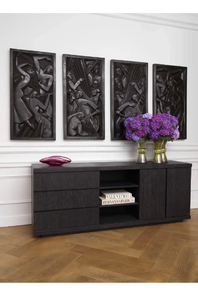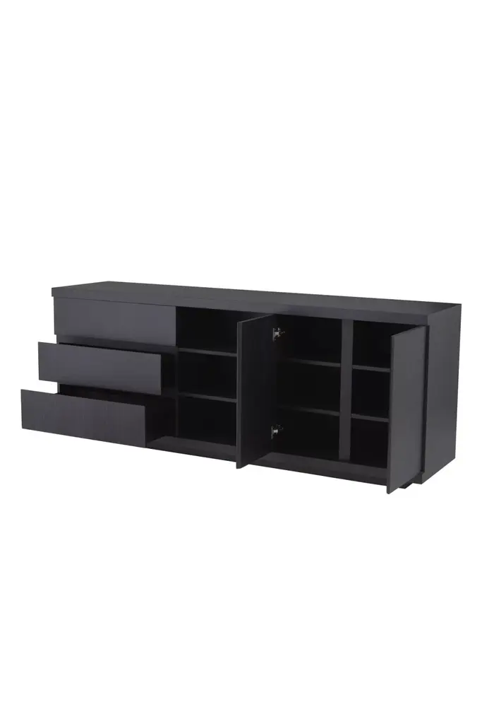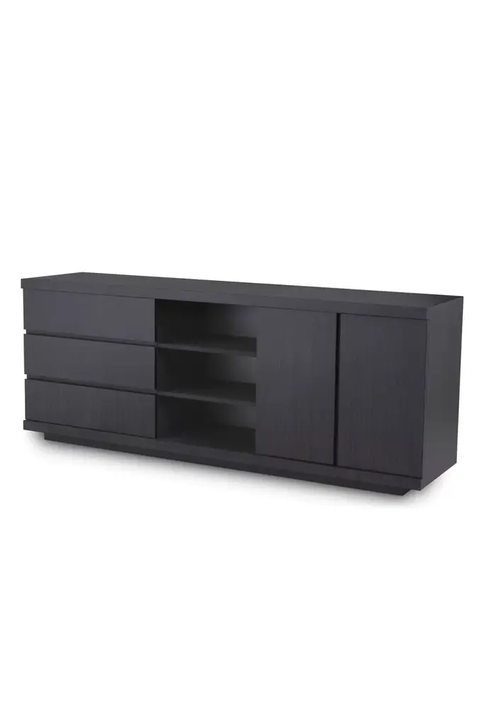 Crosby dresser by Eichholtz boasts its fuss-free design and generous storage space. Made with oak wood in a charcoal gray finish, this dresser features three open shelves, three drawers, and two doors. A perfect fit for minimalist and industrial-style spaces.