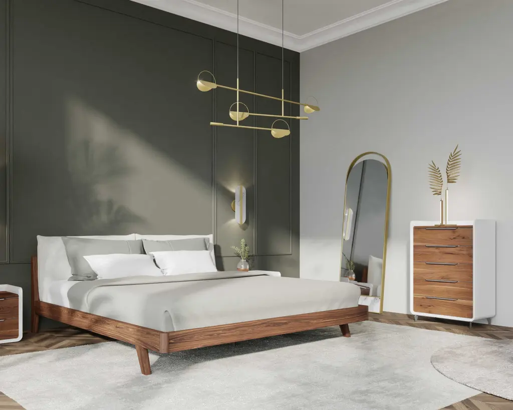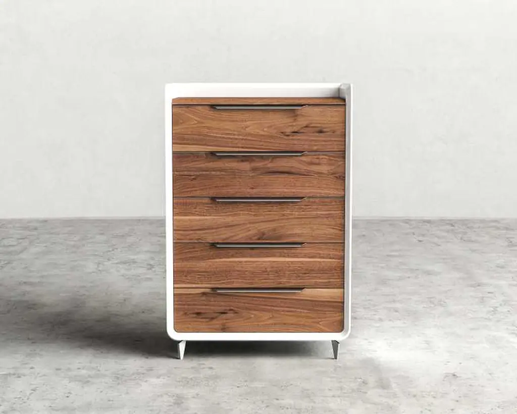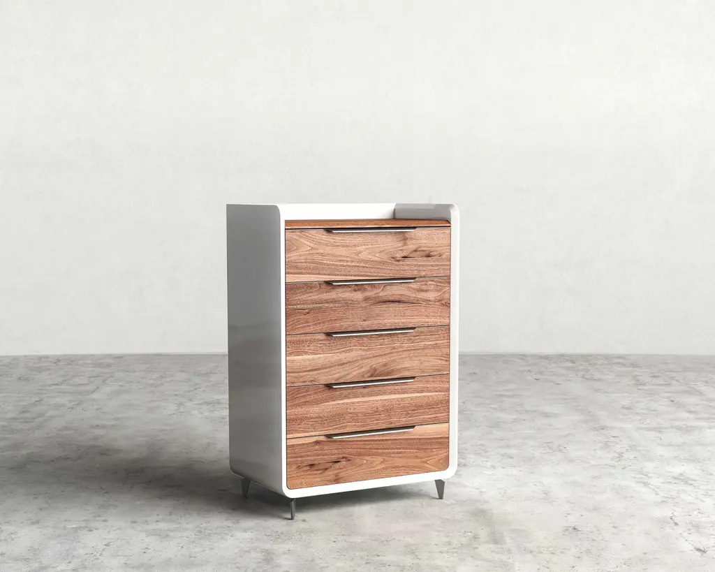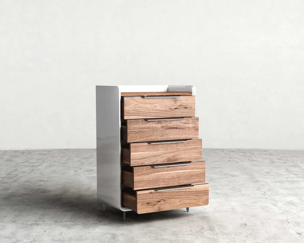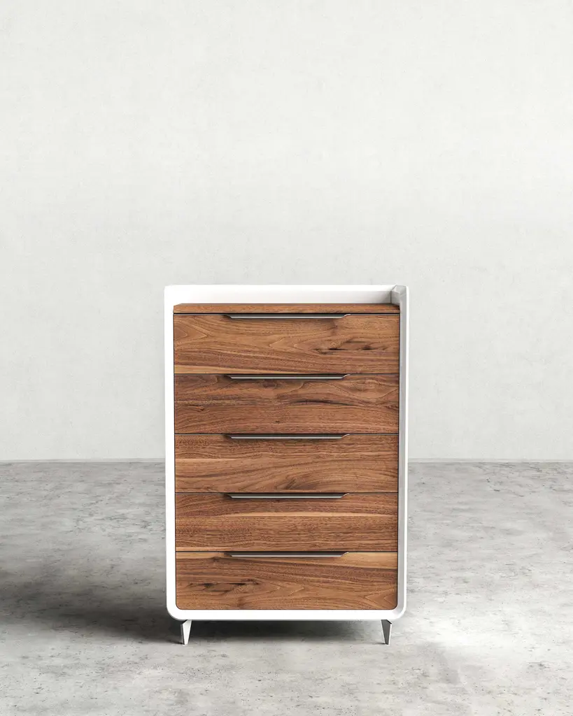 Grayson's modern facade is attributed to the striking combination of glossy white and grainy wood, round curvatures and sharp industrial lines. As if arriving from the future, the sustainably crafted and sturdy materials are destined to last for years to come. Easy open-and-close drawers are matched with sleek aluminum handles that complement the uniquly angled legs. The indented top is a good place for extra storage without the worry of anything falling off.
