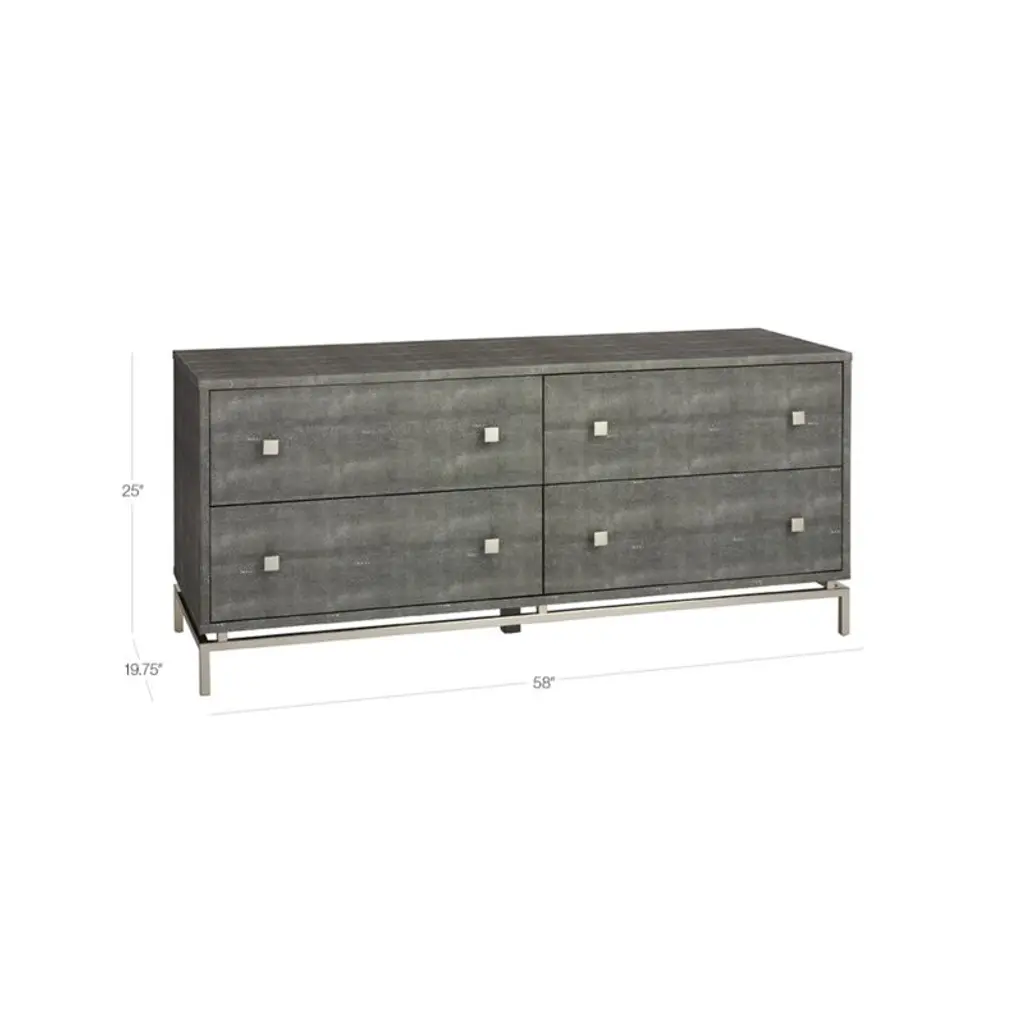 Divine gray shagreen is boudoir-level luxury on a minimal modern frame. Designed by Amanda Ip of Slate Design, striking low profile dresser is completely wrapped in faux embossed snakeskin-like shagreen, by hand no less. Braced by a slim, open structure brushed-nickel frame, silhouette is the picture of chic sophistication. Four deep drawers slide effortlessly on metal glides with brushed nickel knobs. Learn about Amanda Ip on our blog. shagreen embossed low dresser is a CB2 exclusive.