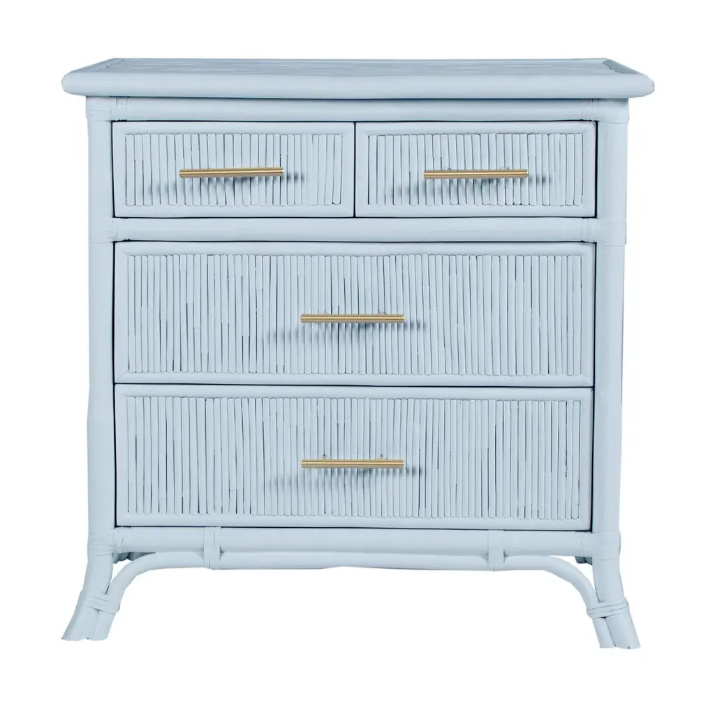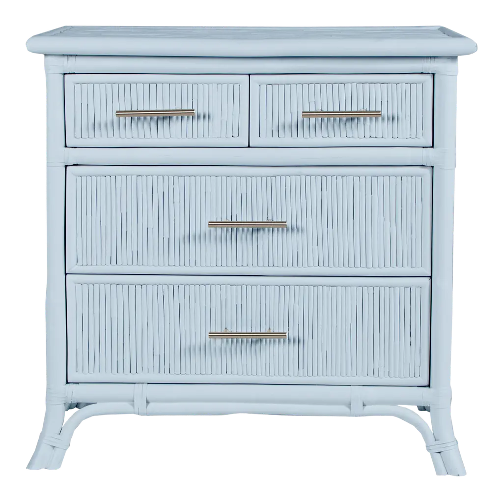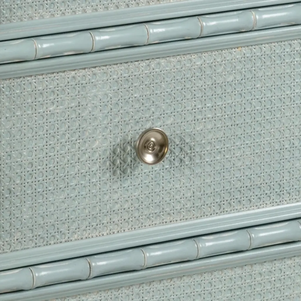 Blue With White Glaze Finish On Four Drawer Bamboo Motif Chest. Drawer Fronts Are Covered With Woven Caning And Satin Nickel Finished Hardware.