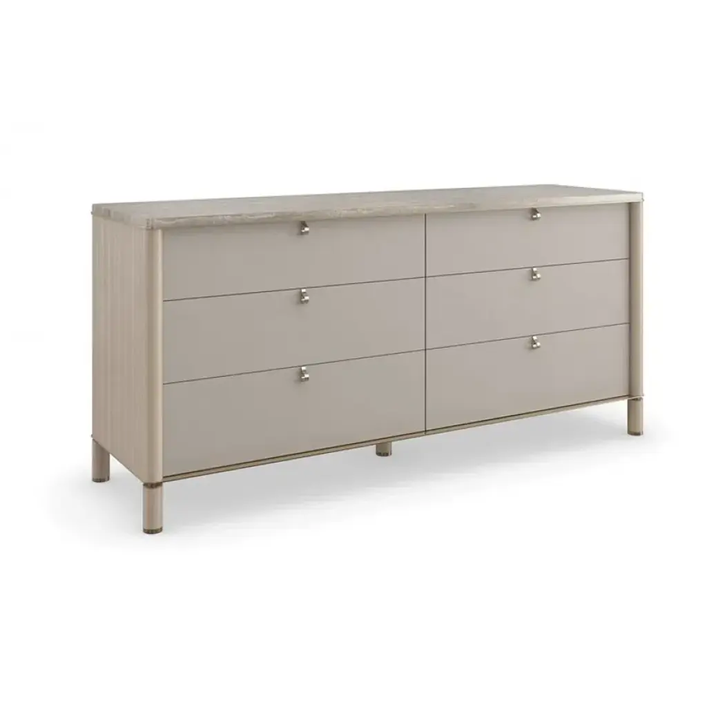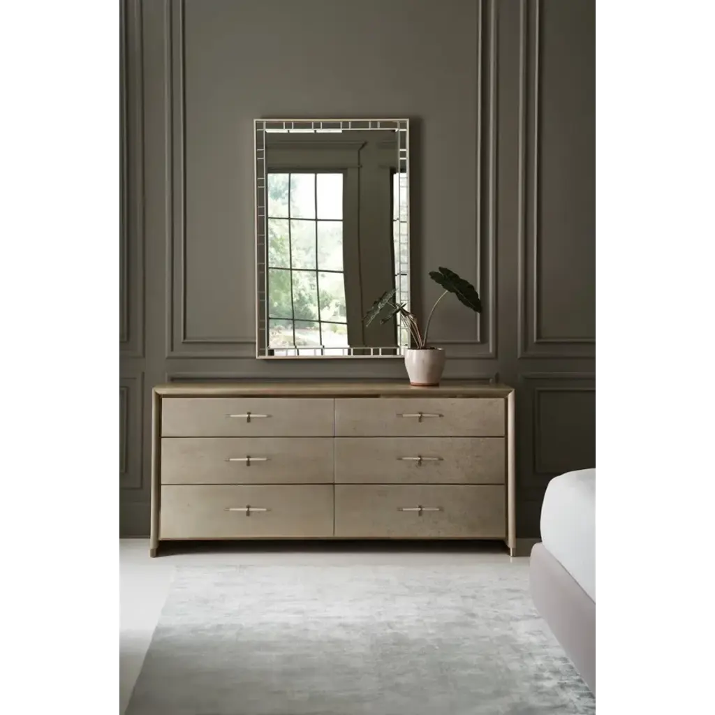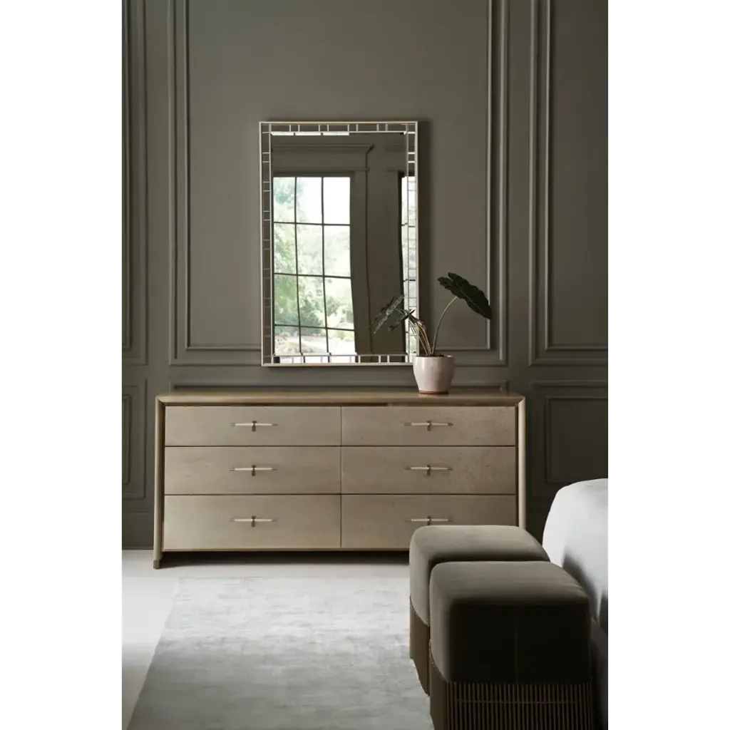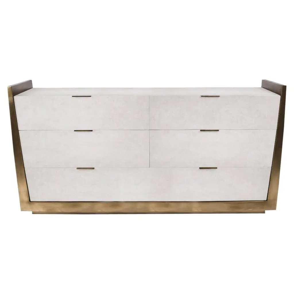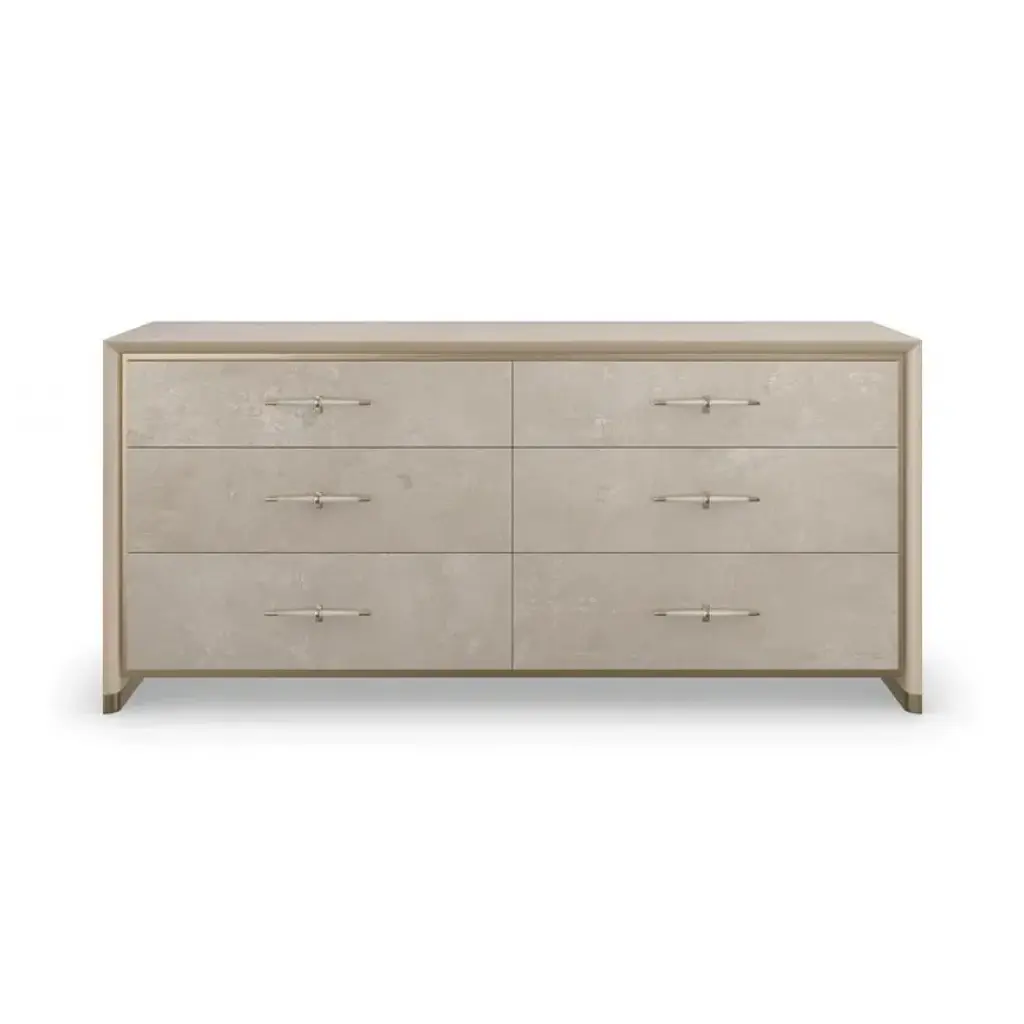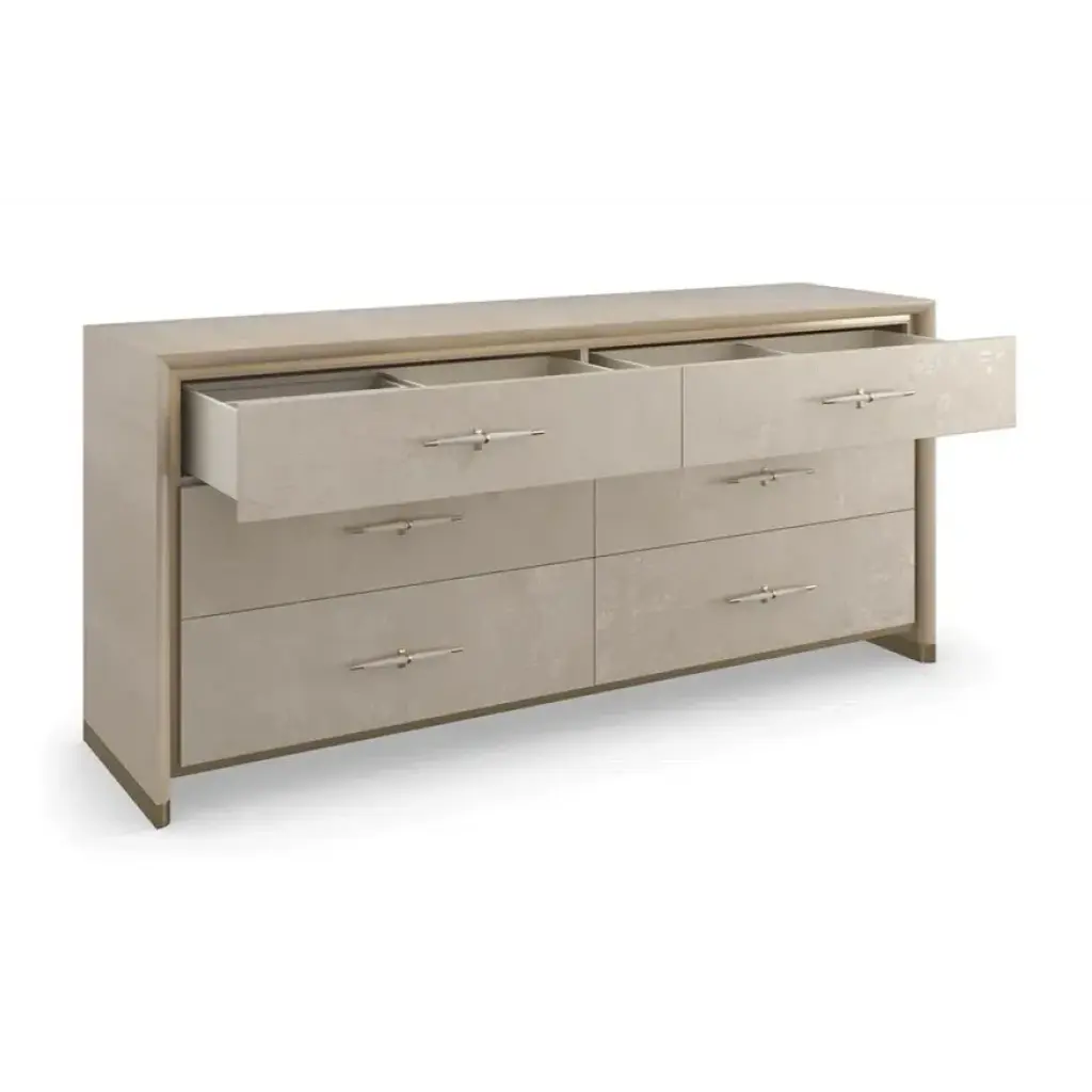 A refined assemblage of materials, the Hang Up dresser melds the beauty of wood with the allure of metal. Drawing the eye: drawer fronts in an ambiguous broken metallic leaf that takes on the shimmer of a frost-covered, candle lit window. A recessed metal frame adds depth and dimension, complemented by tapered pulls, wrapped in hand-stitched faux leather and accented by brushed gold and nickel. Features linen-painted interiors with top drawer dividers and a removable jewelry tray.