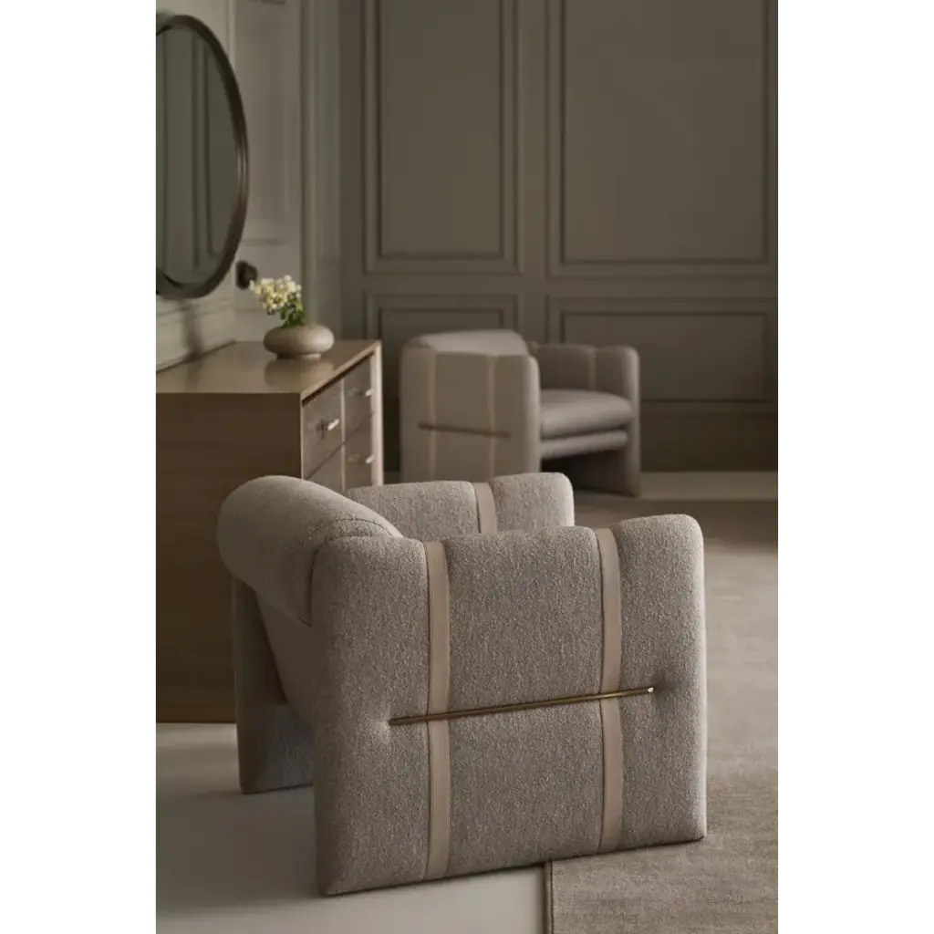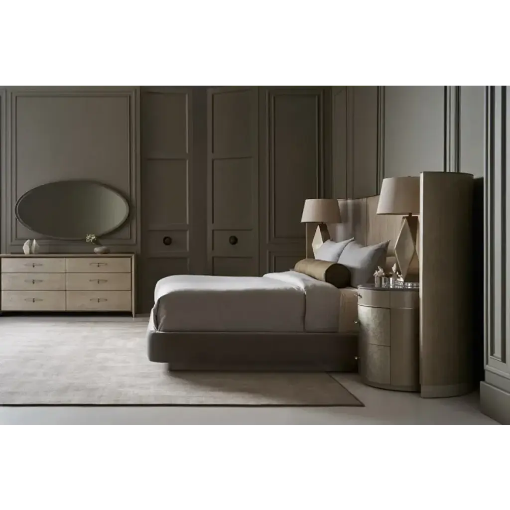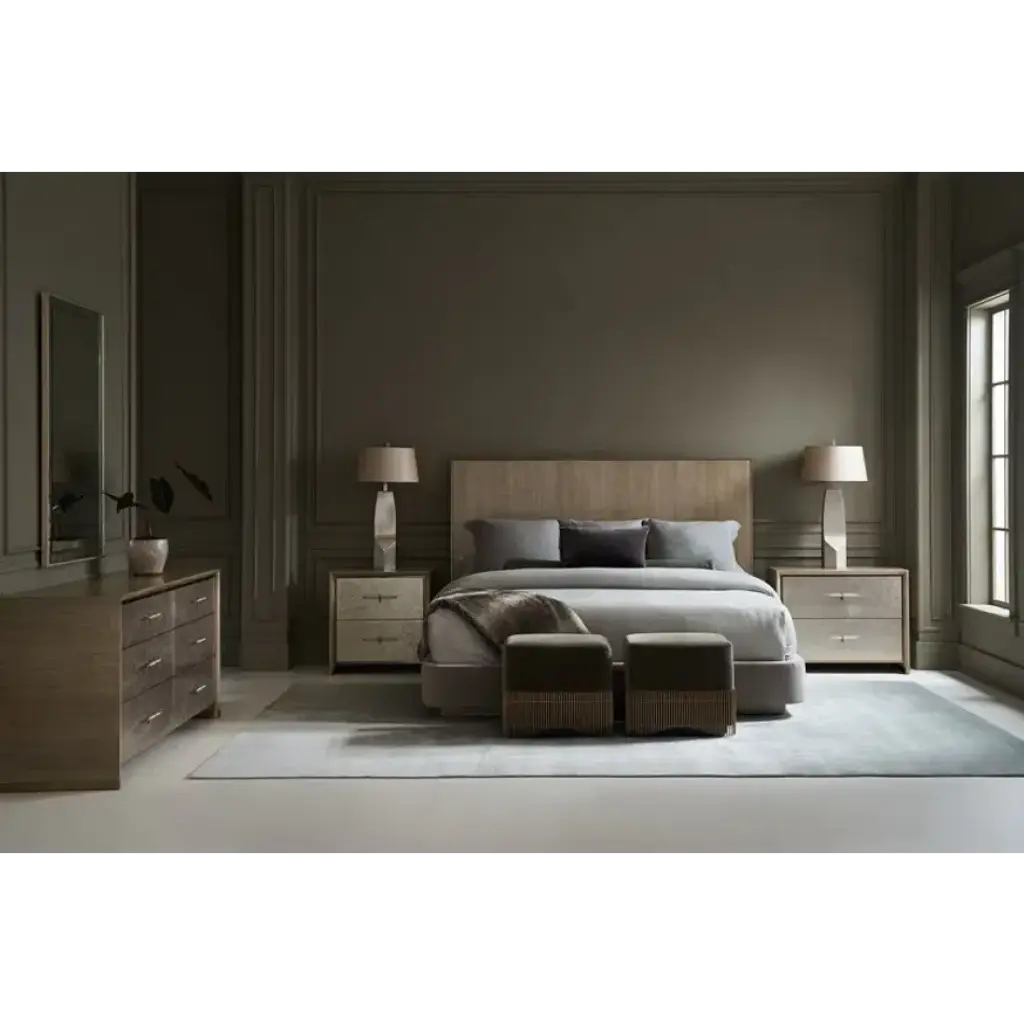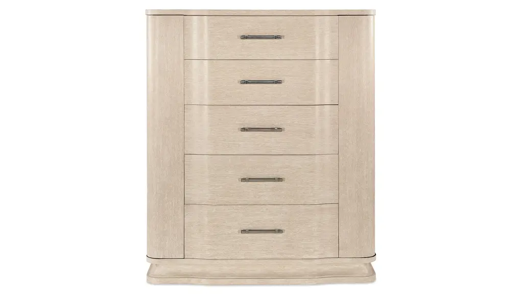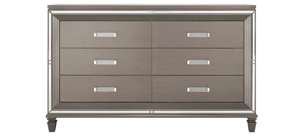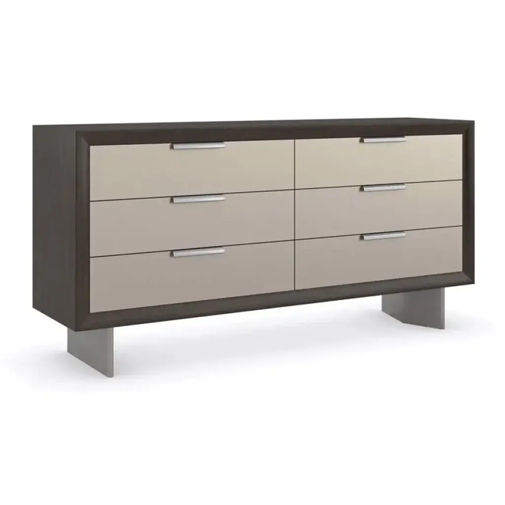 A refined assemblage of materials, the Hang Up dresser melds the beauty of wood with the allure of metal. Drawing the eye: drawer fronts in an ambiguous broken metallic leaf that takes on the shimmer of a frost-covered, candle lit window. A recessed metal frame adds depth and dimension, complemented by tapered pulls, wrapped in hand-stitched faux leather and accented by brushed gold and nickel. Features linen-painted interiors with top drawer dividers and a removable jewelry tray.