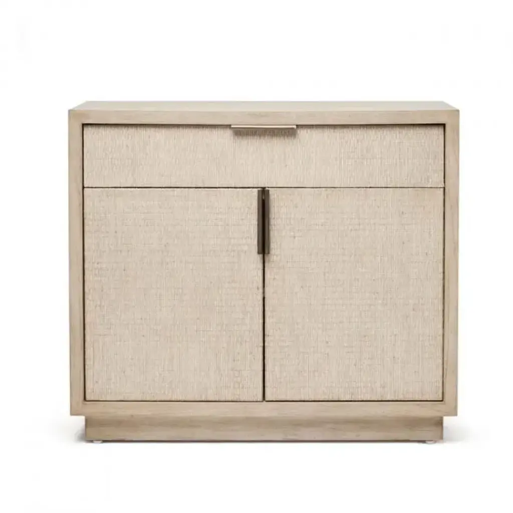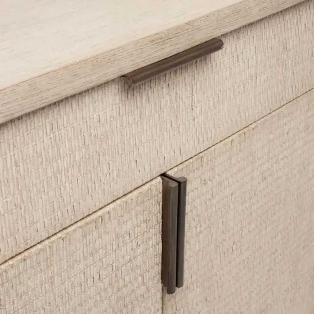Featuring washed taupe wood with raffia insets and metal drawer pulls in satin aged bronze, the Harperly Occasional Chest brings an organic calm to a storage must-have. This item is made of solid wood. Item will not be exactly as pictured, subtle deviations in hue after finishing can be expected as a result of natural variations in coloration of the base material.