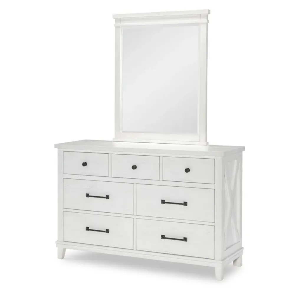 Rustic, comfortable, yet modern. Clean lines combine with natural textures to create the Angeliana youth collection. Modern farmhouse designs such as block feet, flat drawer fronts, and X motifs on side panels offer a lot of details without feeling cluttered. The natural variations of the grain and Aged White finish offer a casual, livable style. Simple Flat Black finished bar pull and knob hardware completes each piece.