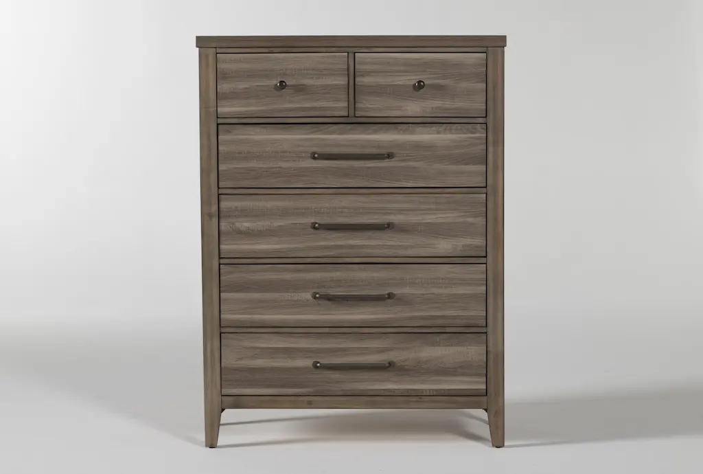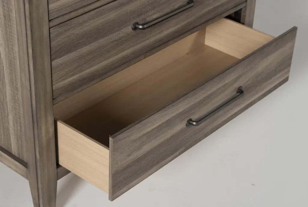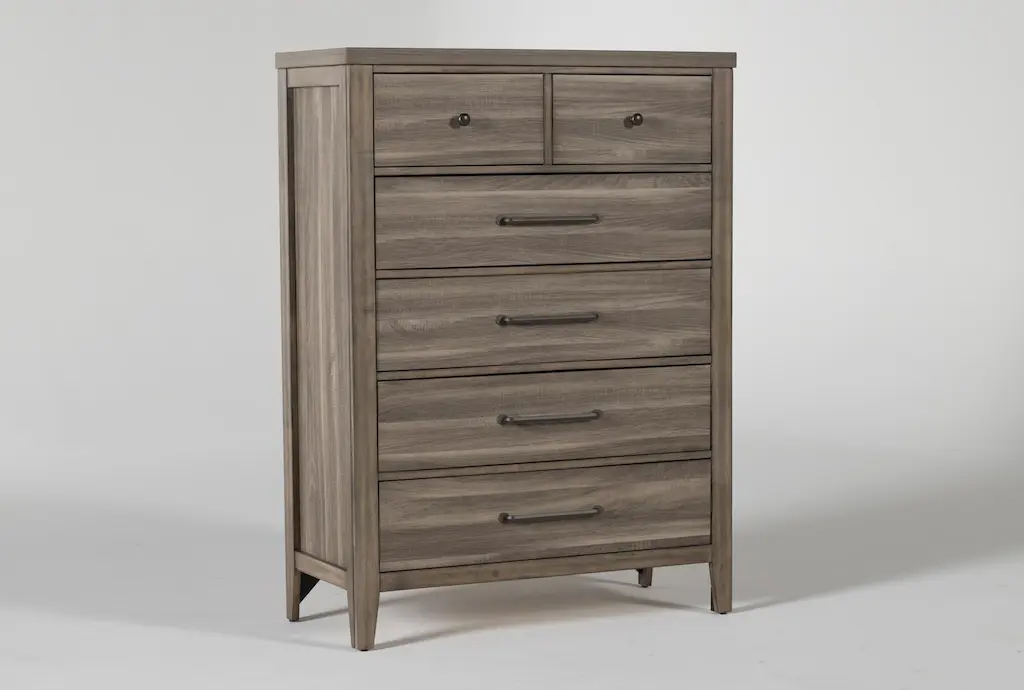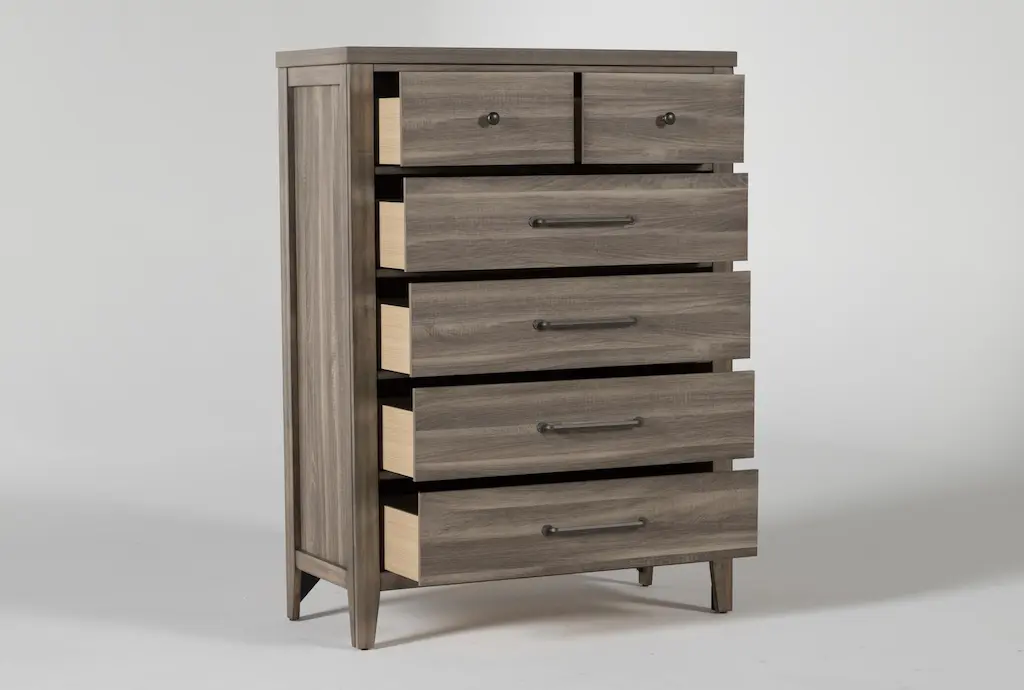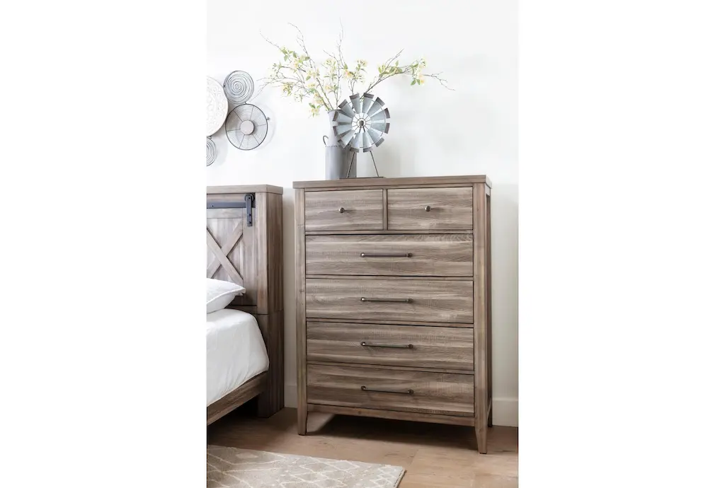 Our Haskell chest of drawer's charming farmhouse elements will bring warmth and character to your retreat. Wake up to an inviting design that encompasses a sturdy blend of laminate and MDF, which is decked in a grey barnwood finish. With its rustic appeal and handsome details, this piece is an outstanding value. You will love having this chest of drawers in your bedroom.