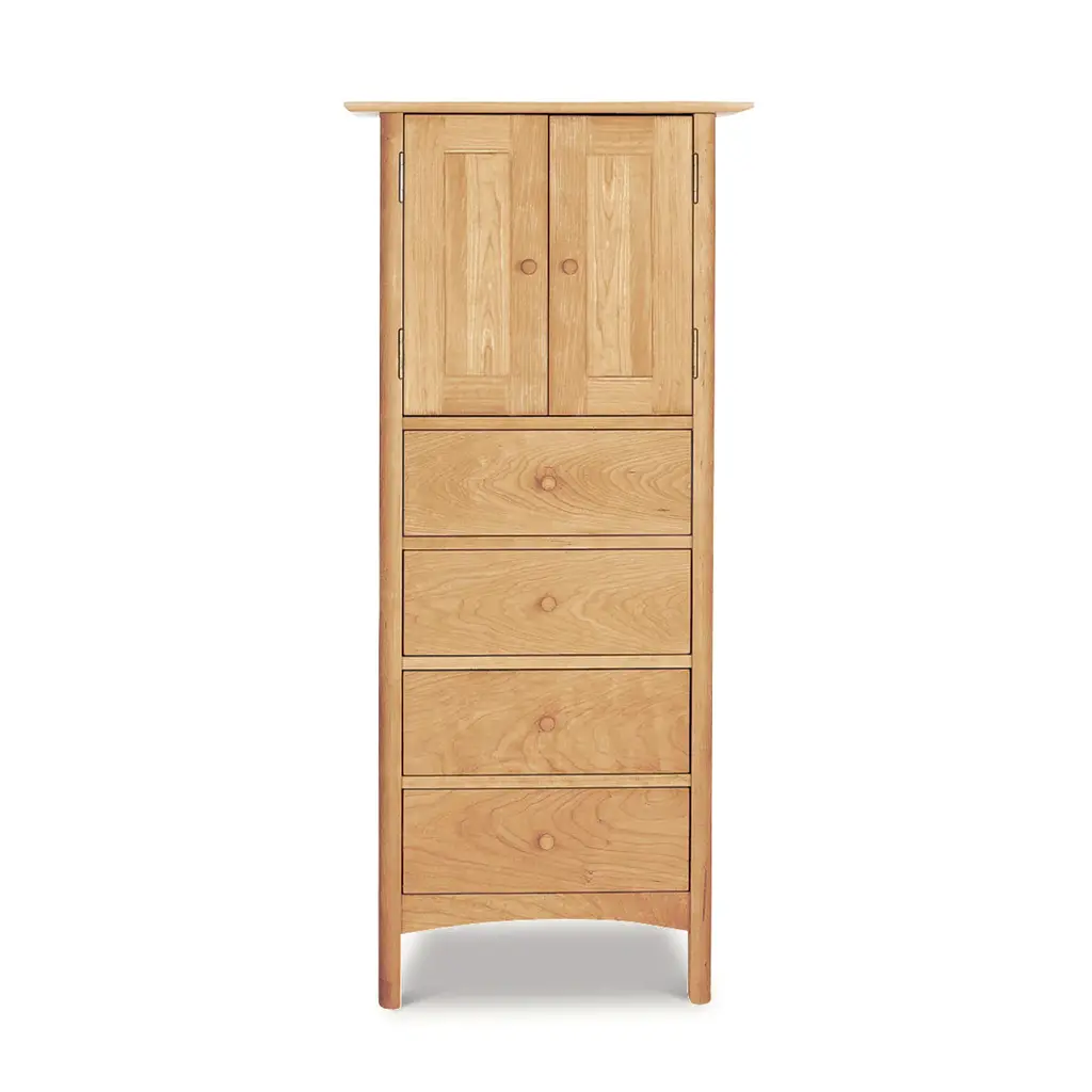Our high-end solid wood Heartwood Style Tall Storage Chest features four drawers and a two doored cabinet. It's narrow armoire design makes a great storage solution for a small space in the contemporary bedroom. With ample storage space and an adjustable shelf in the top cabinet section, this tall storage chest accommodates a wide range of storage needs. All our Heartwood Shaker fine furniture collection is handcrafted to order in Vermont in your choice of solid cherry, maple, or walnut woods with a eco-friendly oil finish that not only protects but enhances the natural beauty of the wood. Heirloom quality built for generations of use.Base price represents chest in natural cherryShown in natural cherryMatching furniture available in our Heartwood Shaker Furniture Collection