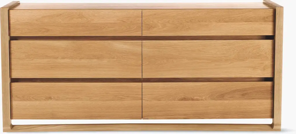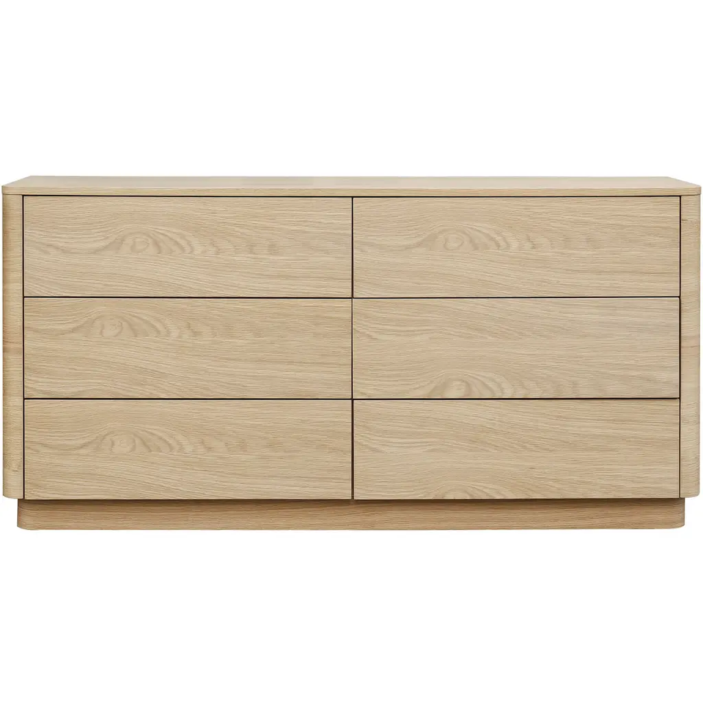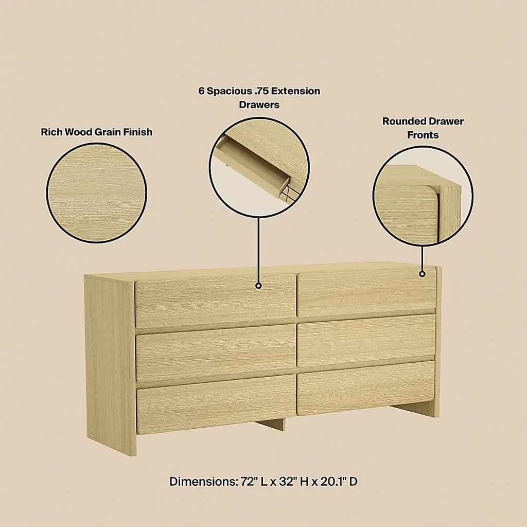 The Herosunny natural dresser blends clean lines with soft edges for a look that's both minimal and inviting. The subtle wood grain texture adds warmth and depth, while the seamless drawer fronts lend a clean, sculptural presence. Designed with versatility in mind, each piece offers functional storage that fits effortlessly in your bedroom. Customer assembly is required.