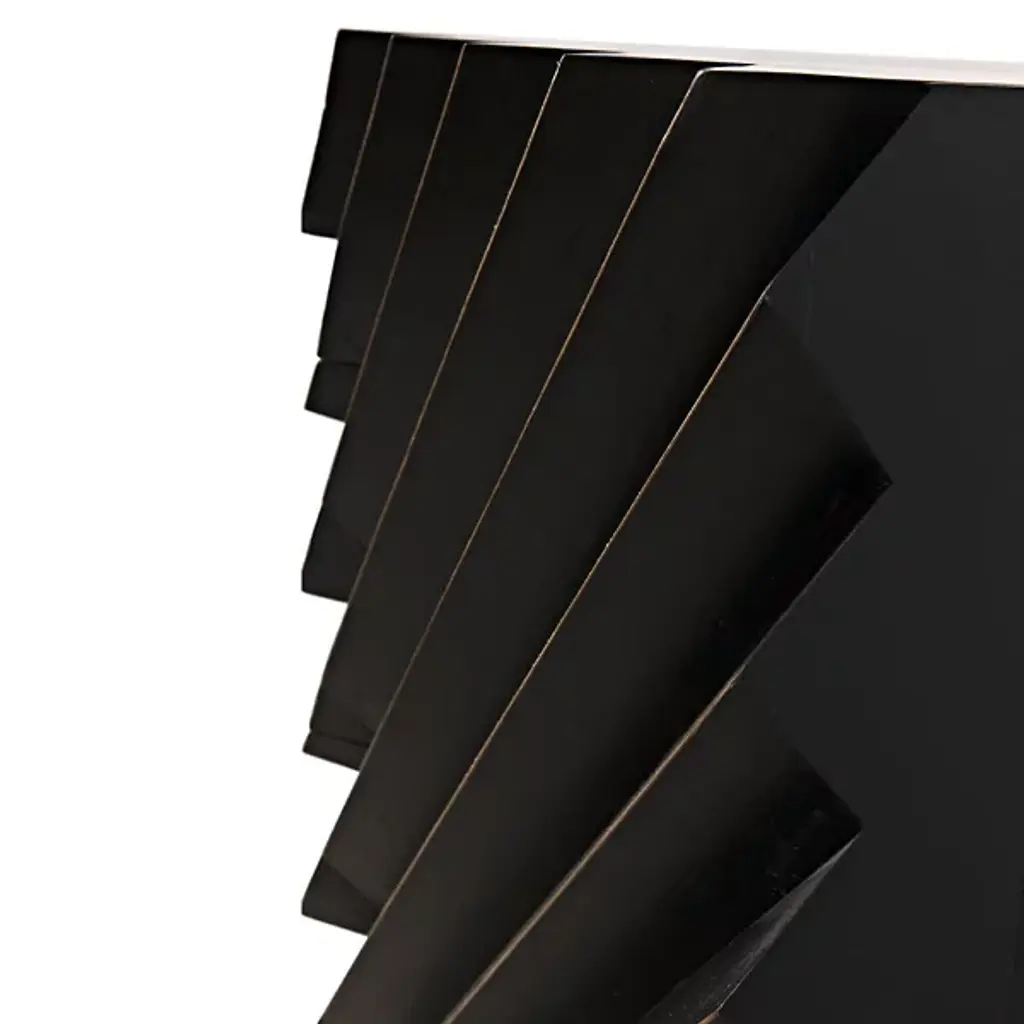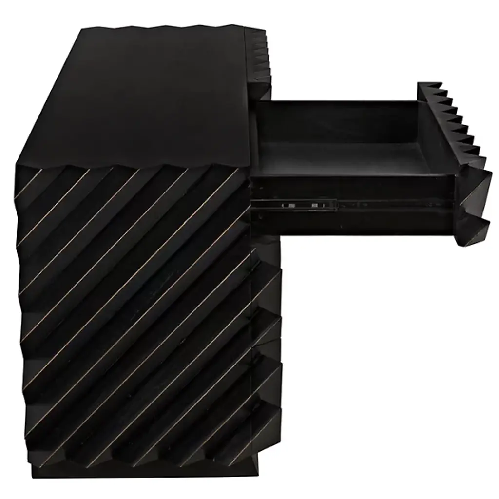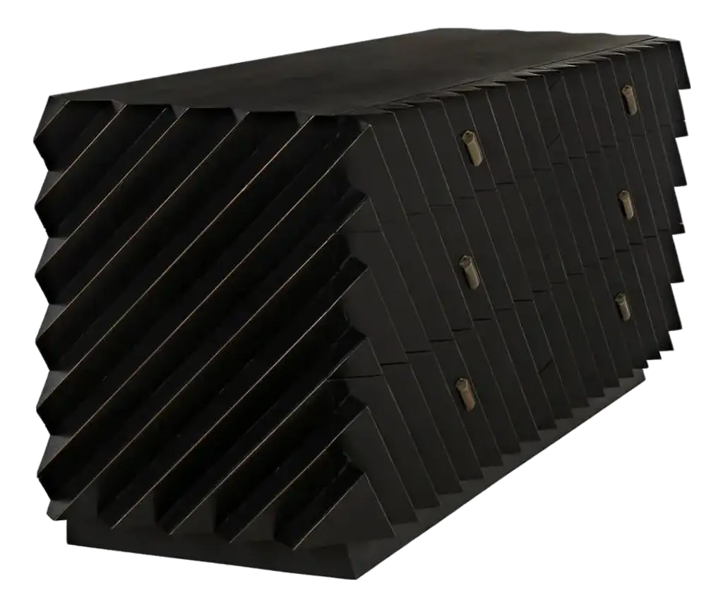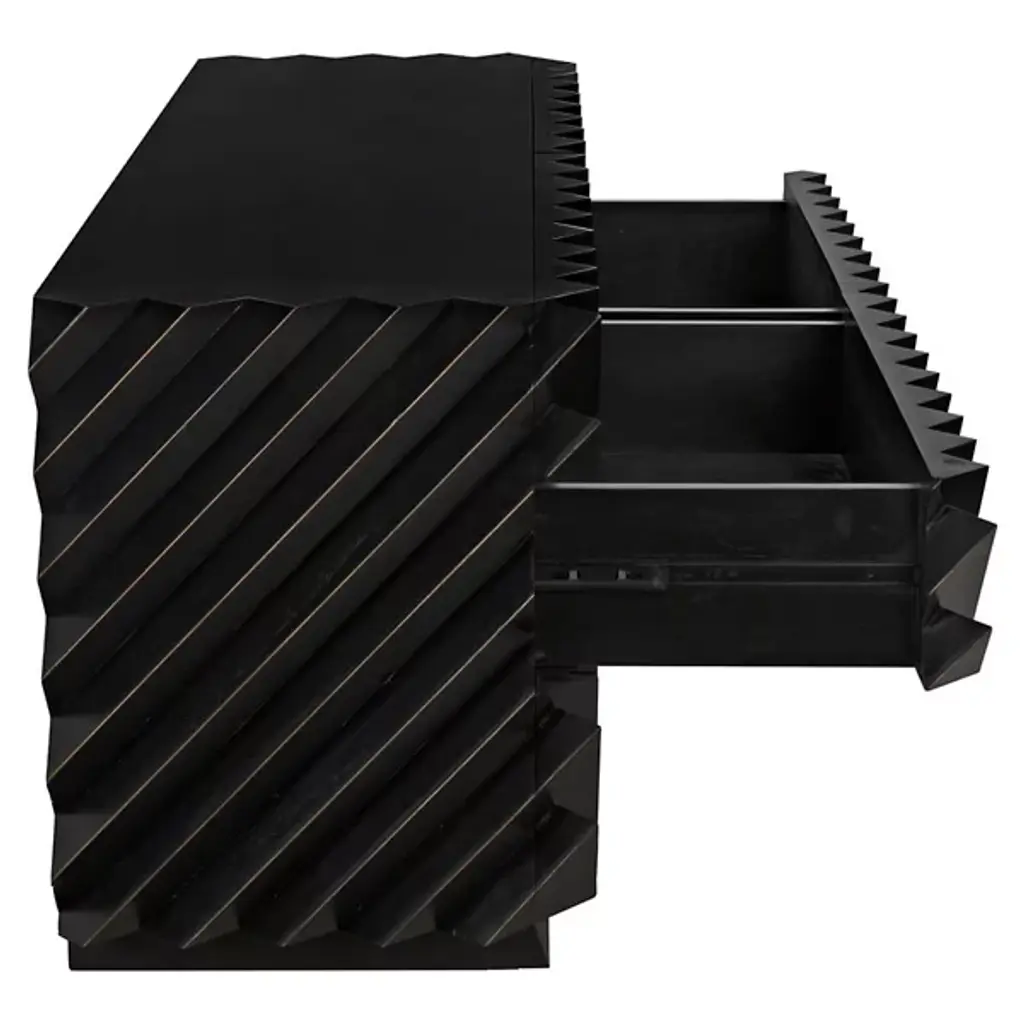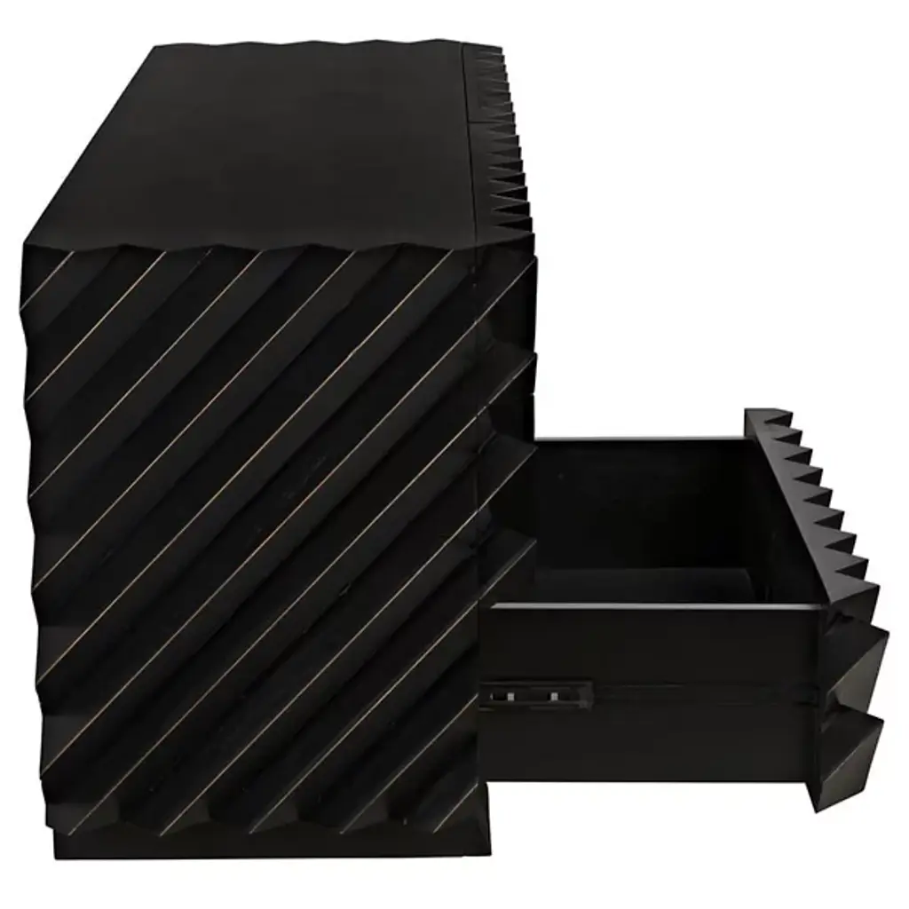 The Hikaru Dresser from Noir features bold diagonal ribs that create dynamic visual movement across its six-drawer facade. The rich finish is carefully removed from the rib peaks, revealing golden mahogany underneath and creating a striking two-tone effect. This artisan technique transforms the geometric pattern into a graphic display of craftsmanship. The high-relief diagonal detailing gives the piece an architectural quality, where each rib catches and reflects available natural illumination differently throughout the day.