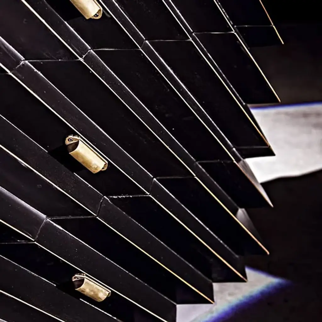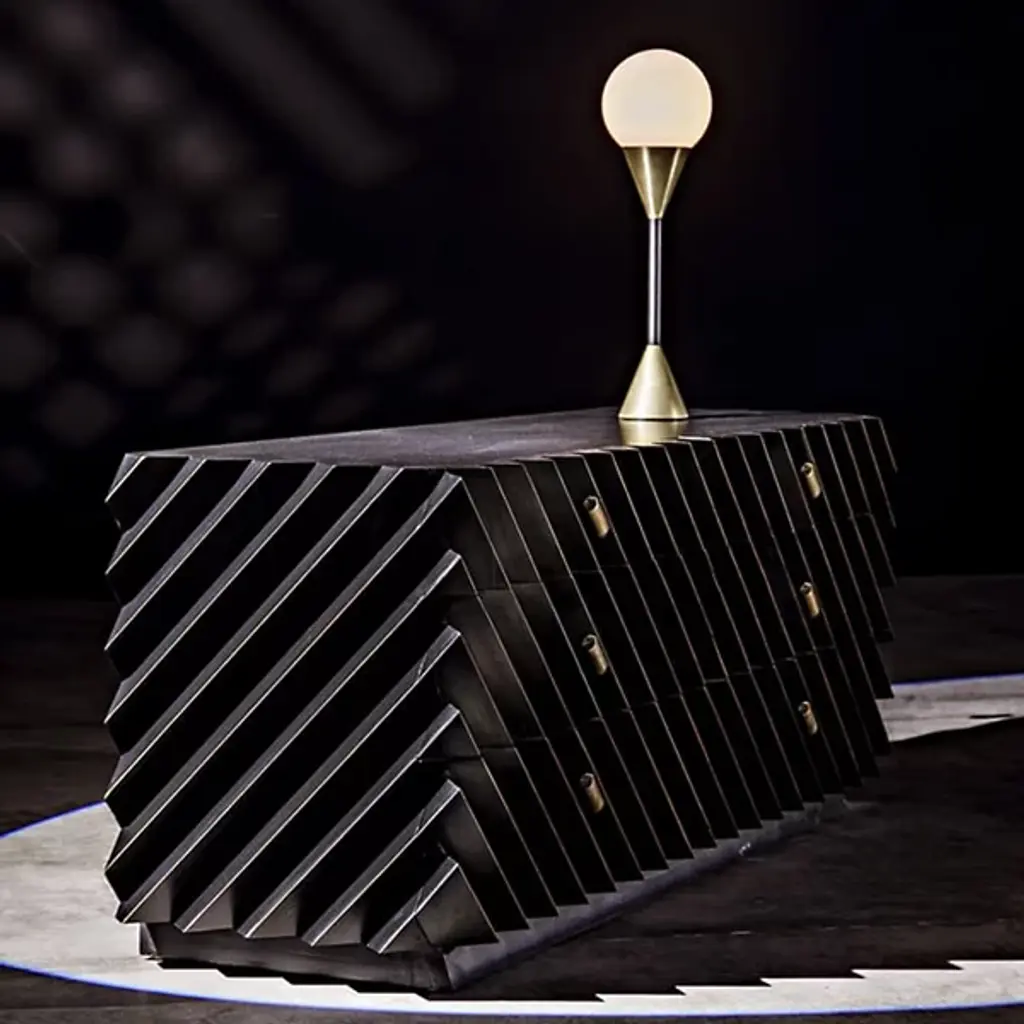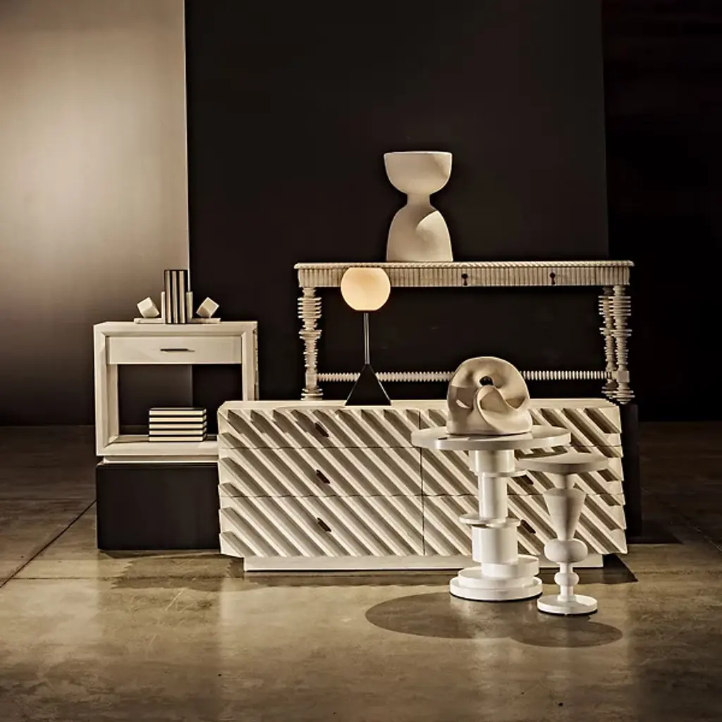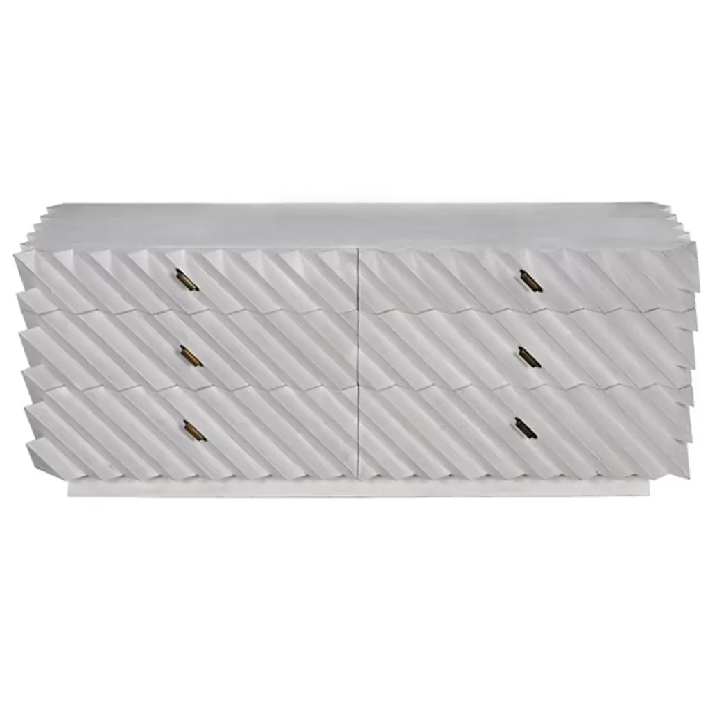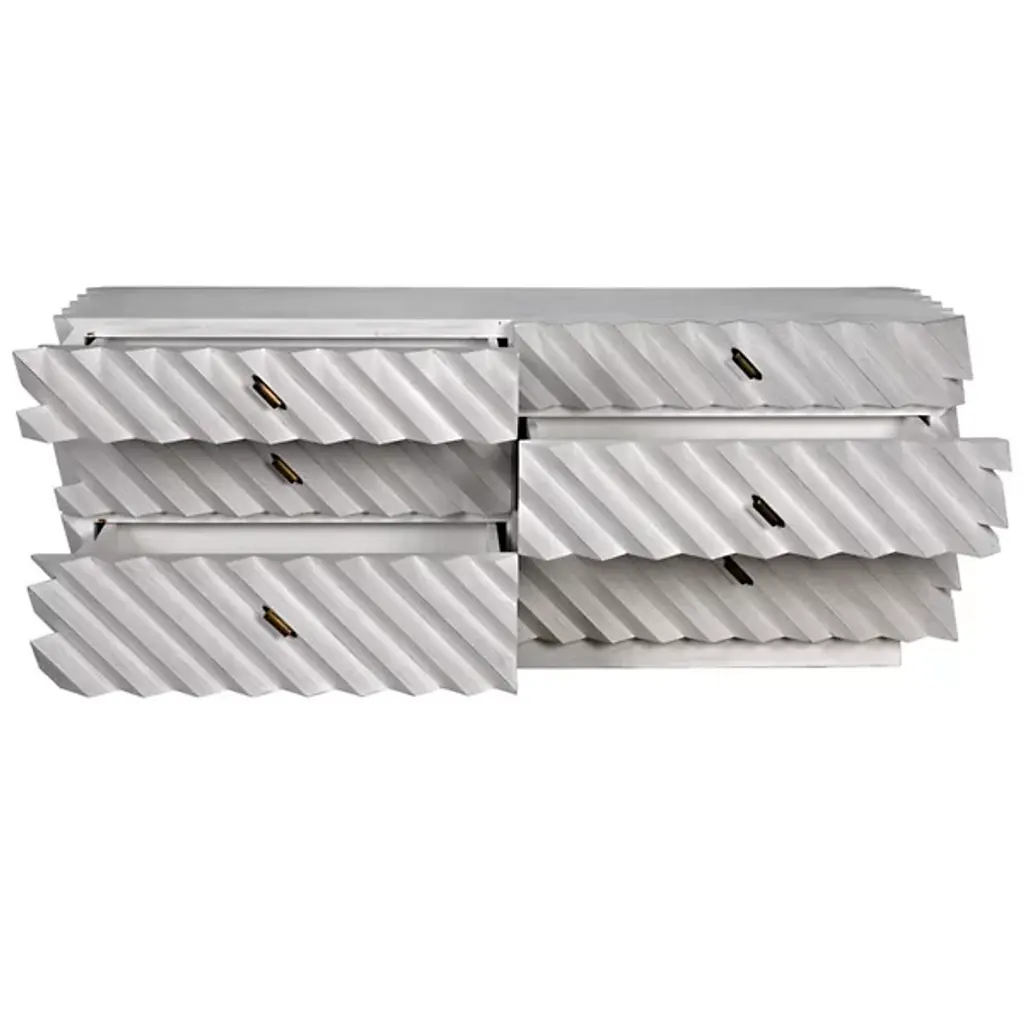 The Hikaru Dresser from Noir features bold diagonal ribs that create dynamic visual movement across its six-drawer facade. The rich finish is carefully removed from the rib peaks, revealing golden mahogany underneath and creating a striking two-tone effect. This artisan technique transforms the geometric pattern into a graphic display of craftsmanship. The high-relief diagonal detailing gives the piece an architectural quality, where each rib catches and reflects available natural illumination differently throughout the day.