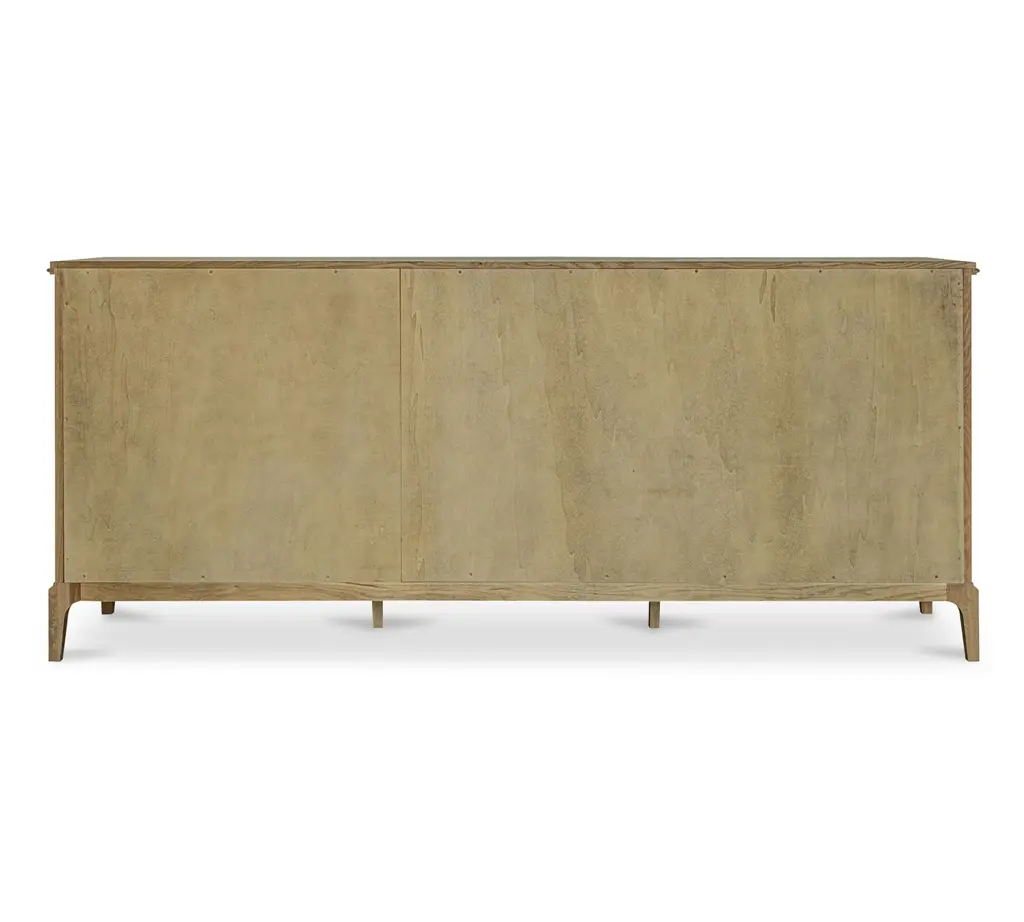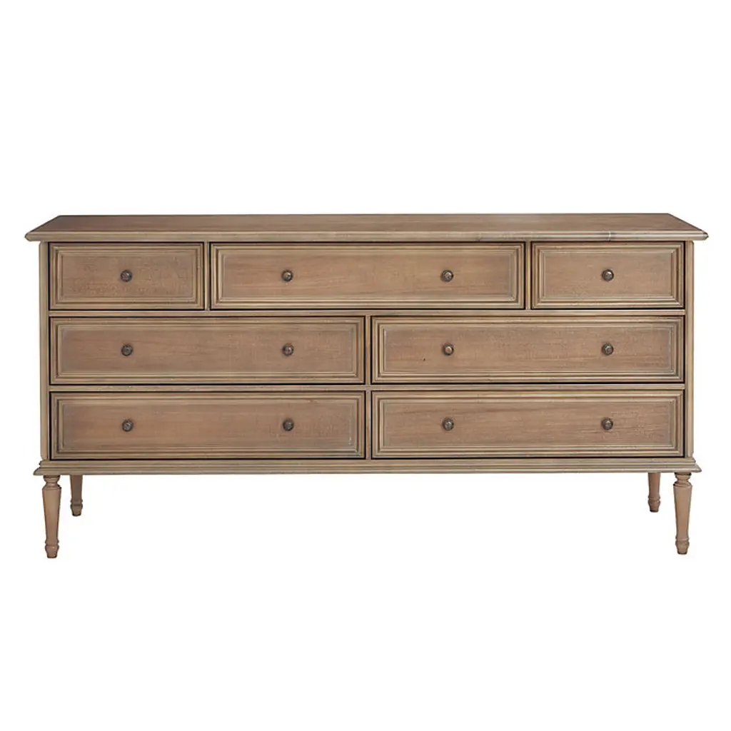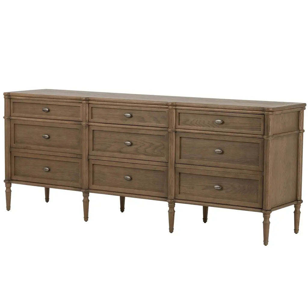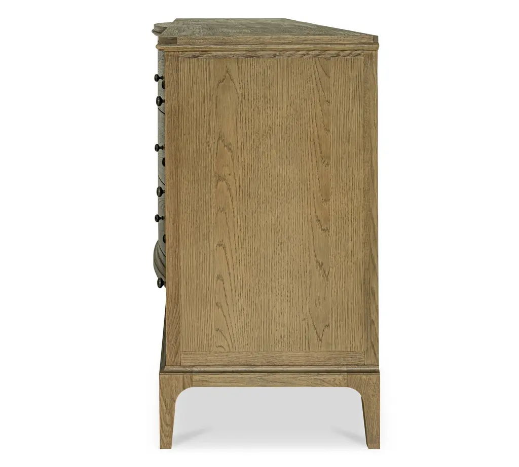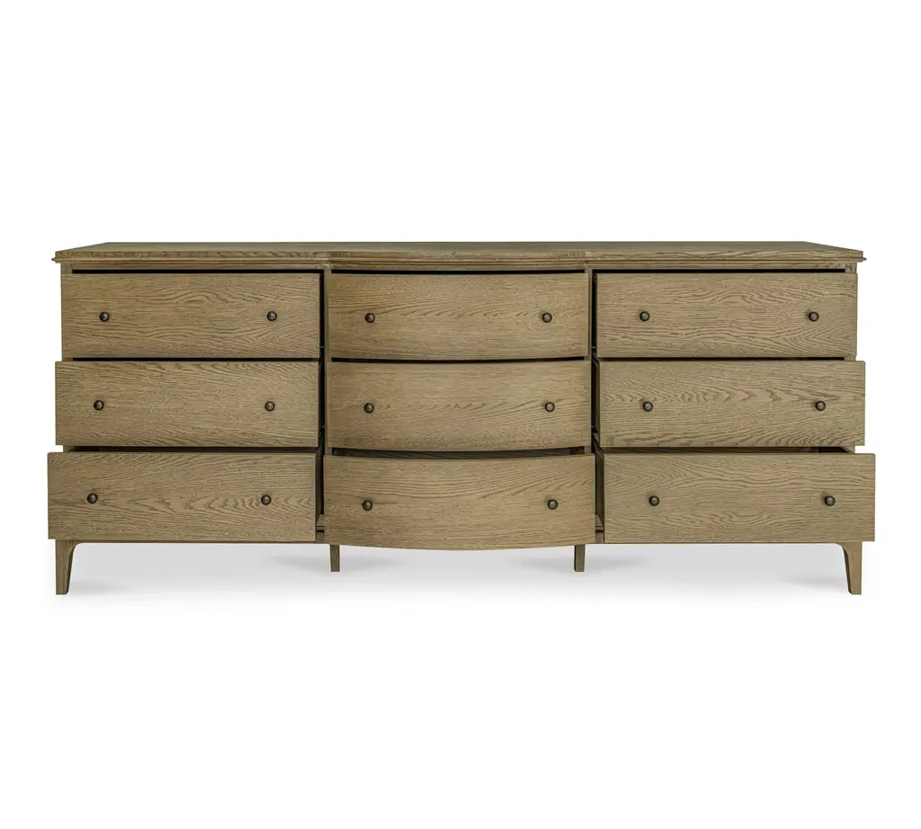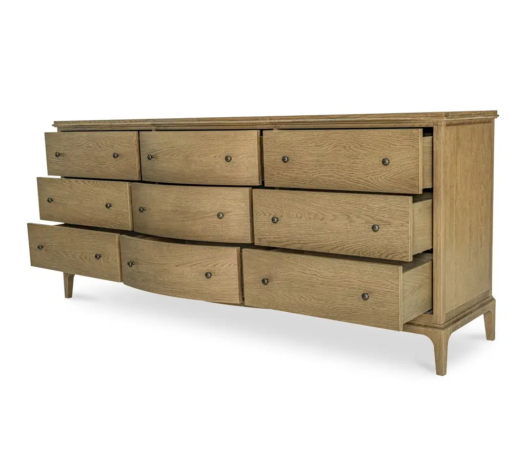 This 9-drawer dresser features a gently curved silhouette, rounded overhang, and a wire-brushed oak finish for timeless texture. With delicate metal knobs and generous storage, it brings soft sophistication to bedrooms both classic and contemporary.