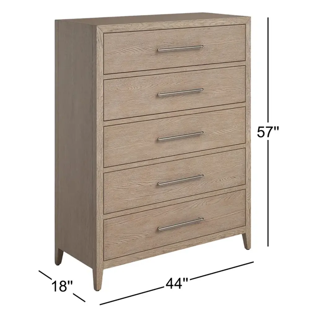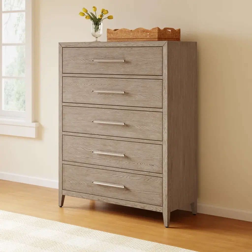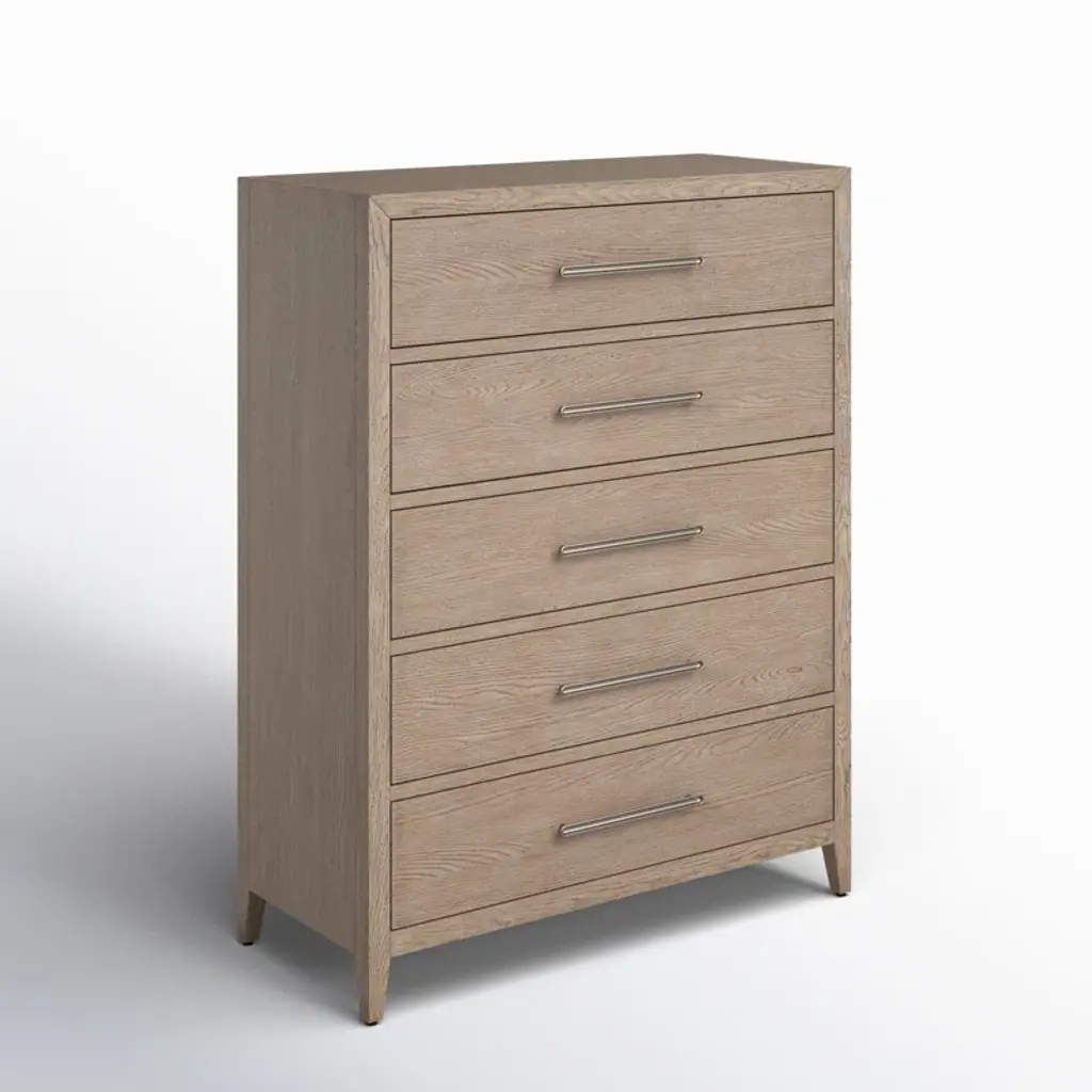 The Hugh Drawer Chest combines the best of form and function with its five spacious drawers set in a serene brown finish. The clean lines of the bar hardware enhance the piece's sleek design, offering a versatile and organic addition to any space that values refined simplicity and practical elegance.