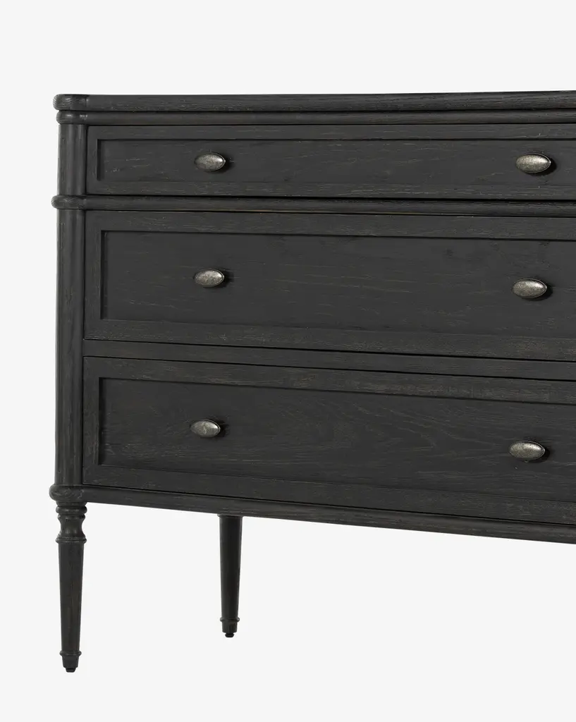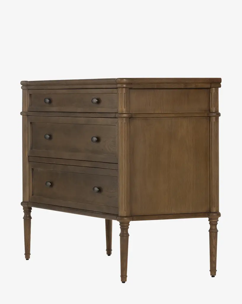 A traditional design and elegant details in the frame bring a vintage feel to modern bedroom styling with the Humphrey Chest. A slim top drawer and two standard and spacious drawers give functionality to the chest, while tapered legs and simple oval handles bring comforting detail to your space.
