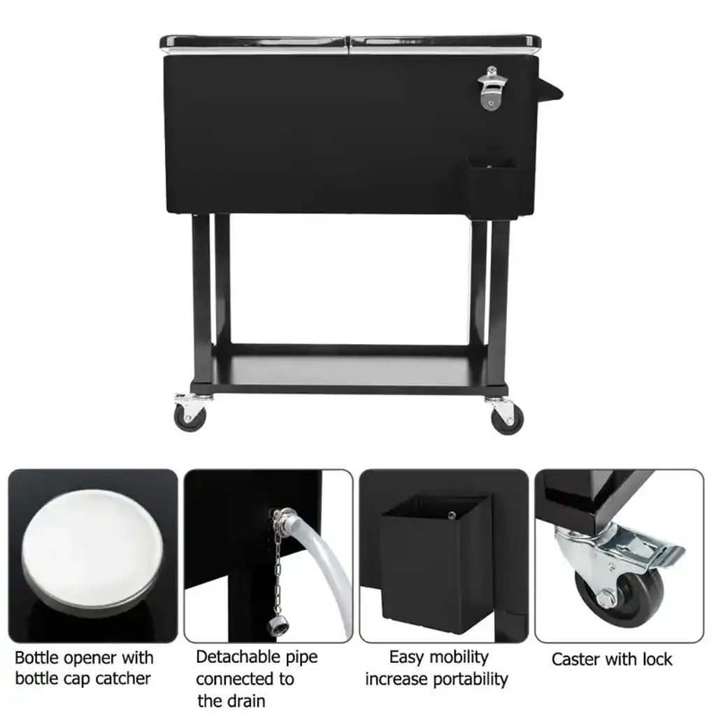 Introductions: It can keep the warm food above 40 ℃ for 4-5 hours and preserve cool for up to 48 hours with ice sheet.Features: 1. Produced by high quality iron spray material, wear resistant and environment friendly 2. With two directional wheels, can stop at any time 3. Feature bottom tray design, convenient to carry things 4. Warm function, can keep the warm food above 40 ℃ for 4-5 hours 5. Cooling function, cool preservation for up to 48 hours with ice sheet 6. Concise design and exquisite workmanship 7. The capacity is 80 QT Specifications: 1. Material: Iron & Plastic 2. Color: Black Box & Black Square Foot Tube 3. Dimensions: (35.83 x 34.25 x 18.9)" / (91 x 87 x 48)cm(L x W x H) 4. Weight: 36.82lbs / 16.7kg 5. Capacity: 80QTPackage Includes: 1 x Cooler Cart