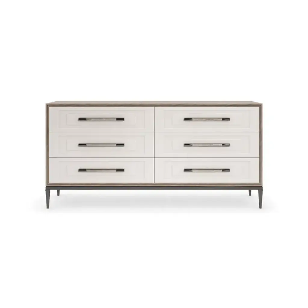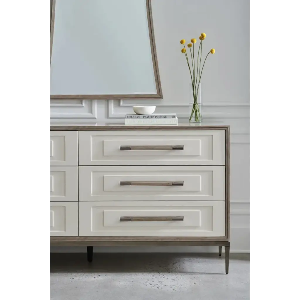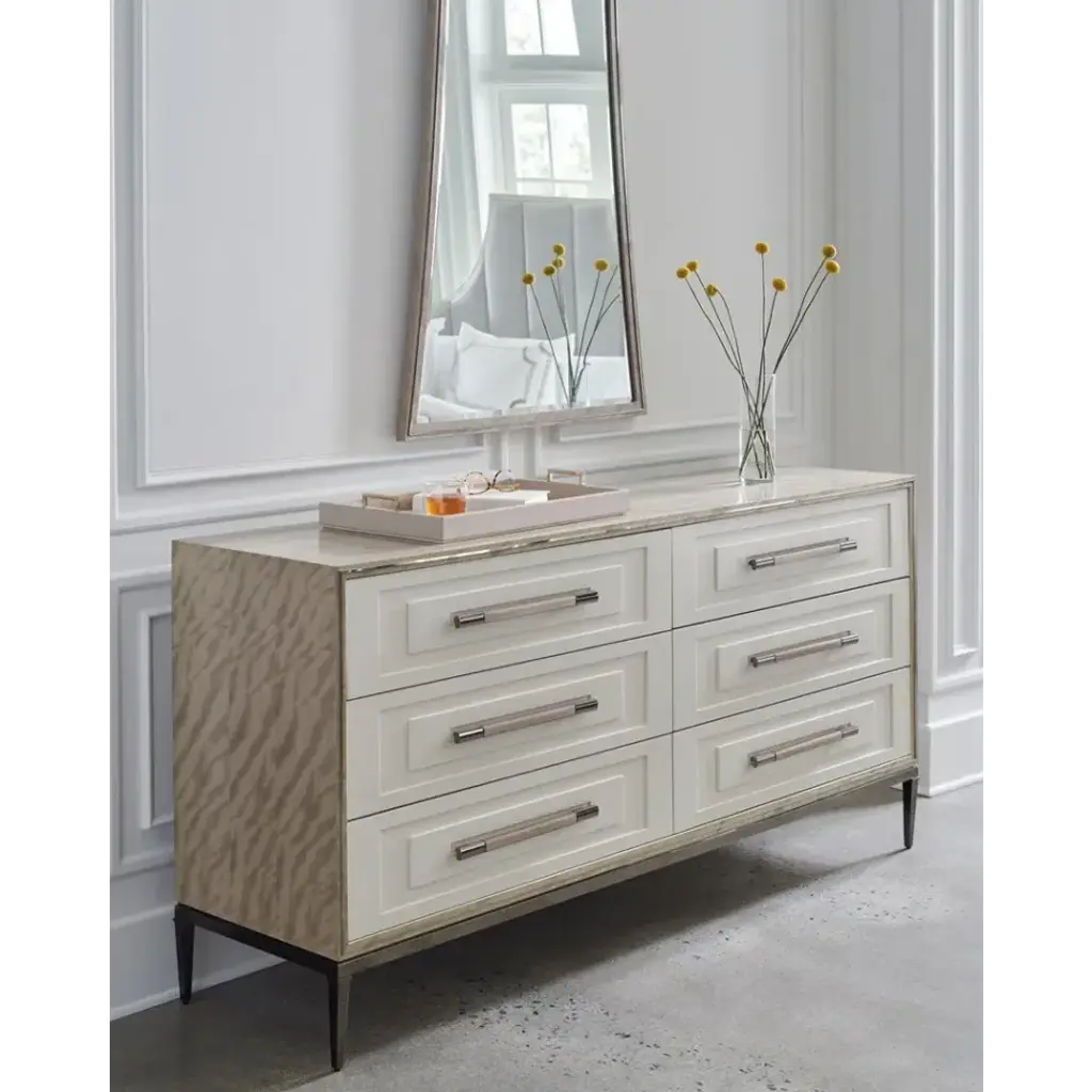 Designed with the utmost attention to detail and materials, this sophisticated dresser is well-suited for a casual retreat or a stately bedchamber. Stepped drawer fronts in a Pearly White finish create subtle shadow and dimension, called to attention by jewelry-like custom hardware with a ceramic inlay. Six spacious drawers are framed in Deep Bronze metal trim and encased in Silver Curupixa veneers, finished in Mountain Smoke to highlight its luxurious, figured wood grain.