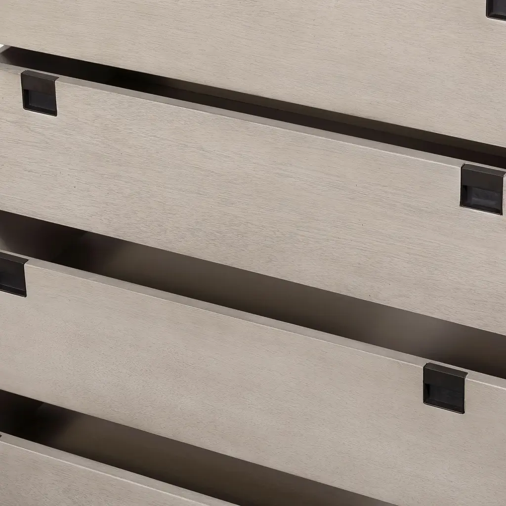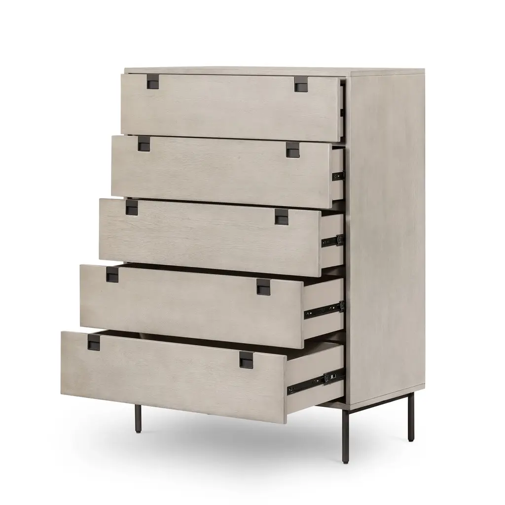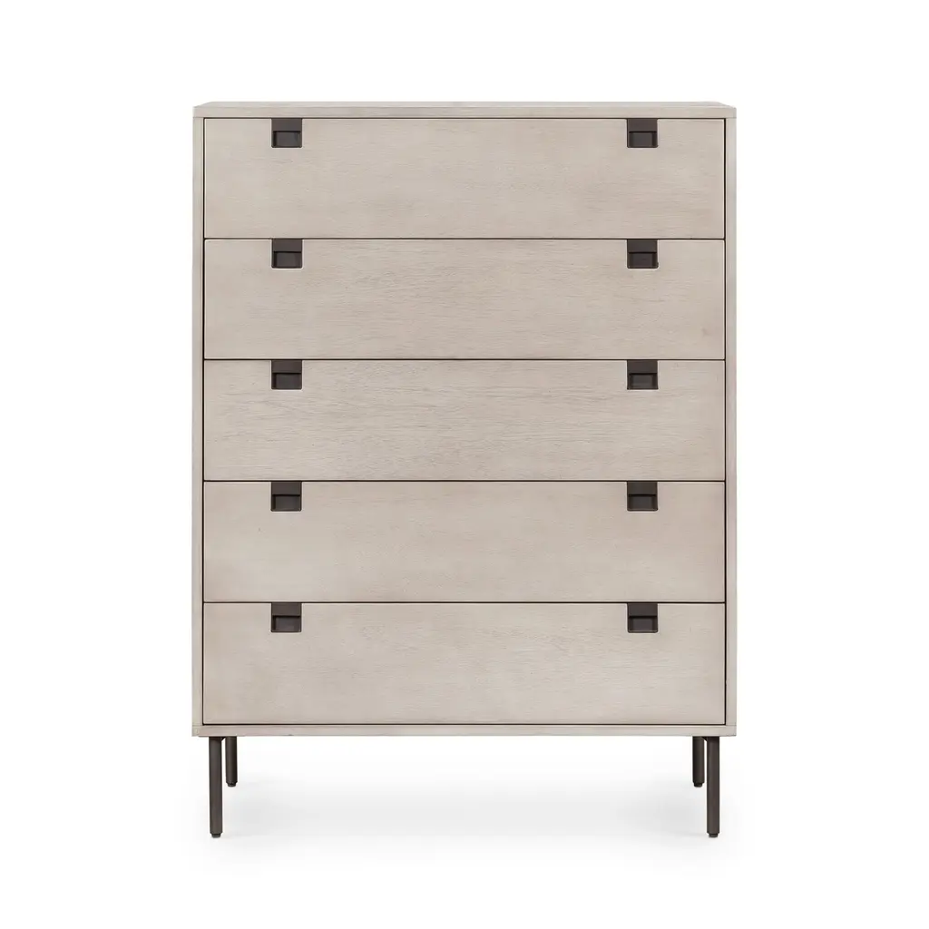 Clean, geometrical shapes give our Squared Handle 5-Drawer Dresser its modern look. The gray washed acacia veneer drawers sit atop lofty iron legs.