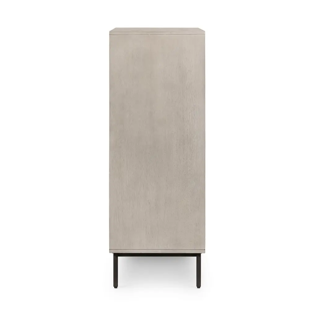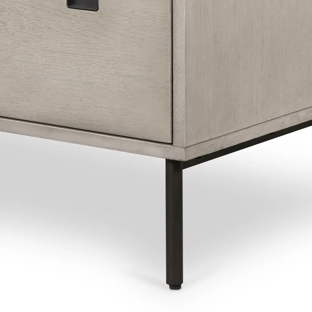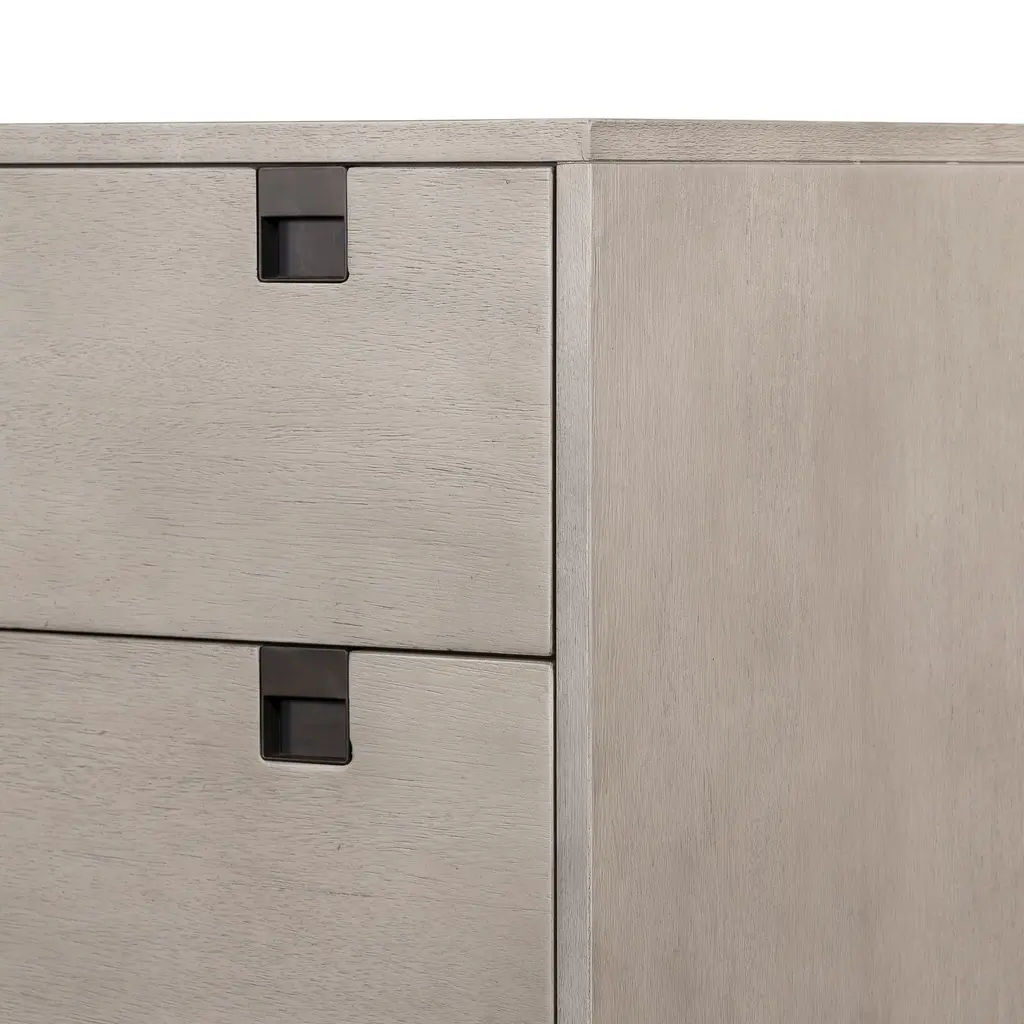 Clean, geometrical shapes give our Squared Handle 5-Drawer Dresser its modern look. The gray washed acacia veneer drawers sit atop lofty iron legs.