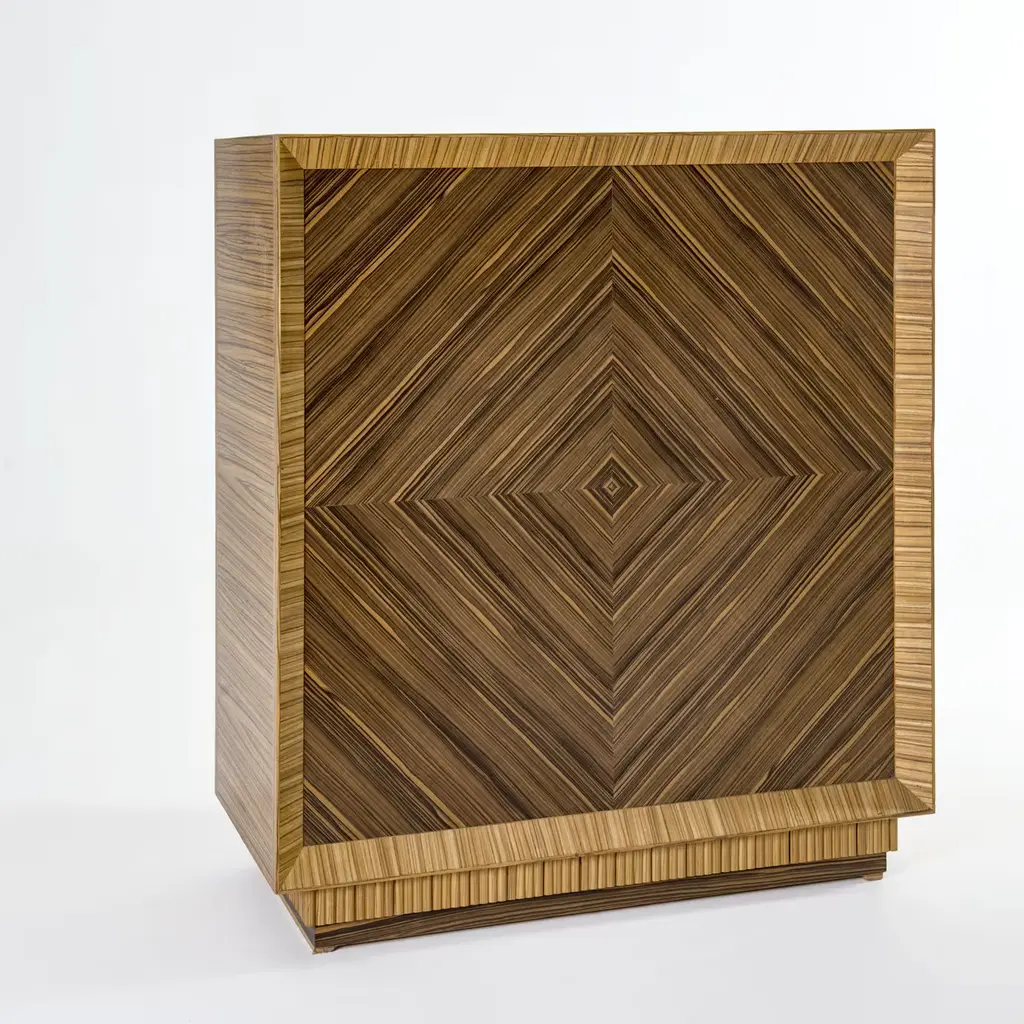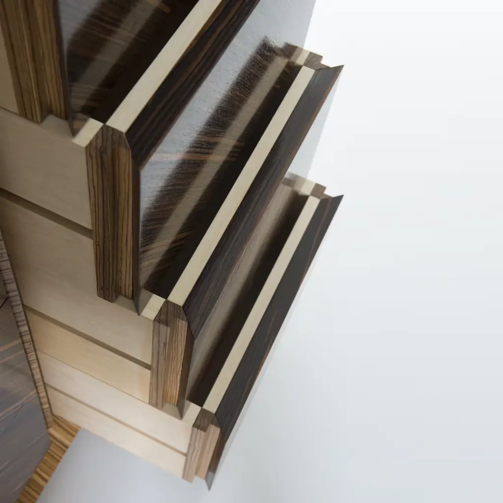 This unique chest of drawers will make a statement when placed in a bedroom or walk-in closet. The exterior structure is crafted in solid wood with a striking zebra-striped pattern. The front and back of the piece are in ebony macassar wood with a 45 degree cross cut pattern, with eight frontal drawers and an additional lateral and central opening. The base is also in zebra-striped wood, and the sub base in ebony macassar. The interior of the drawers are in maple wood. Designed by Antonio Berdondini, year 1944.